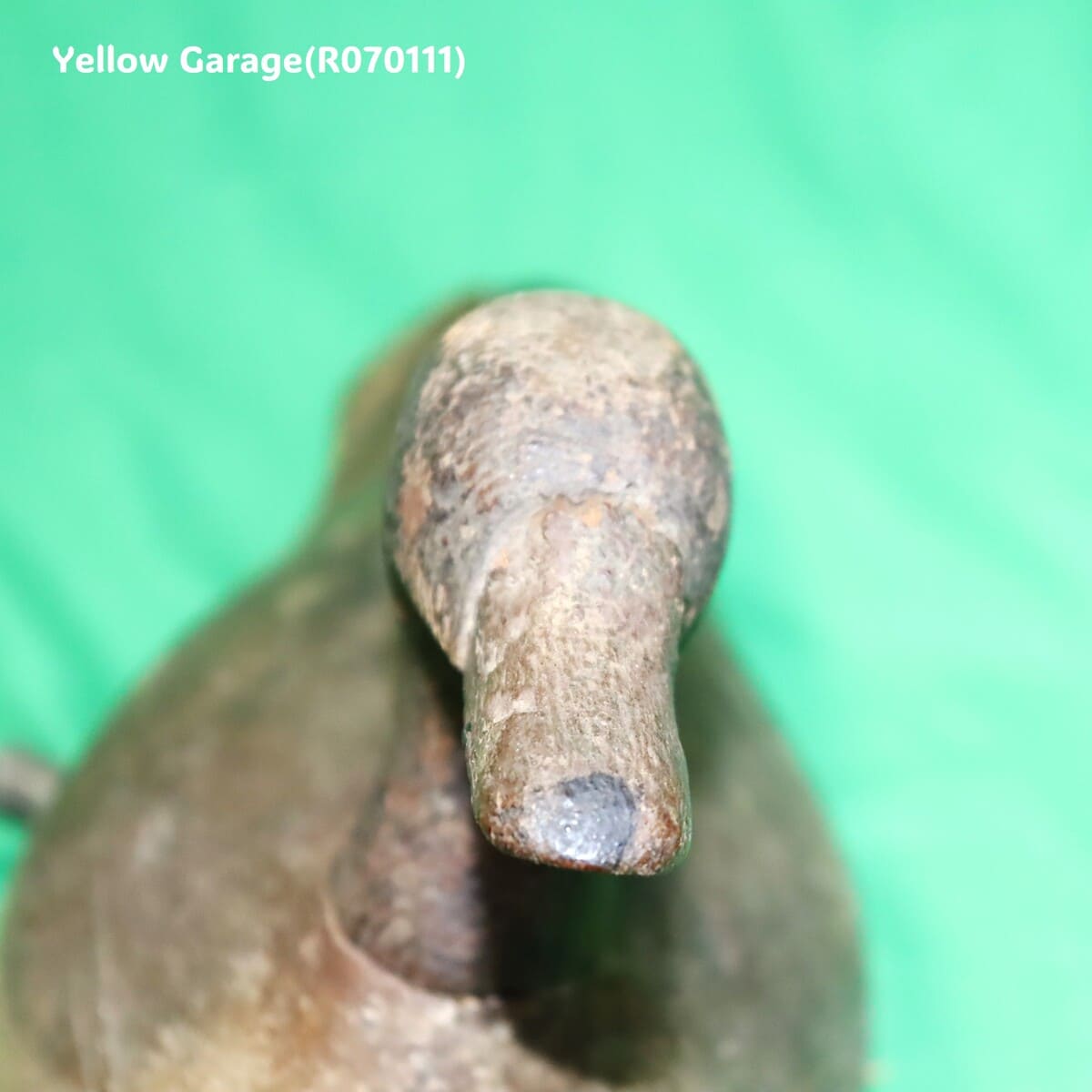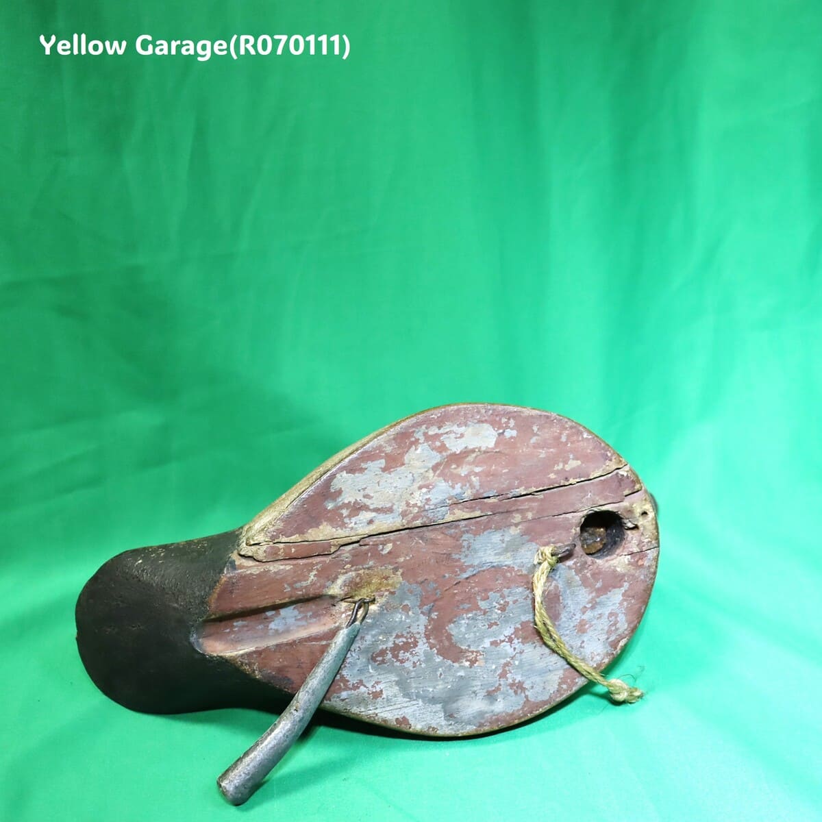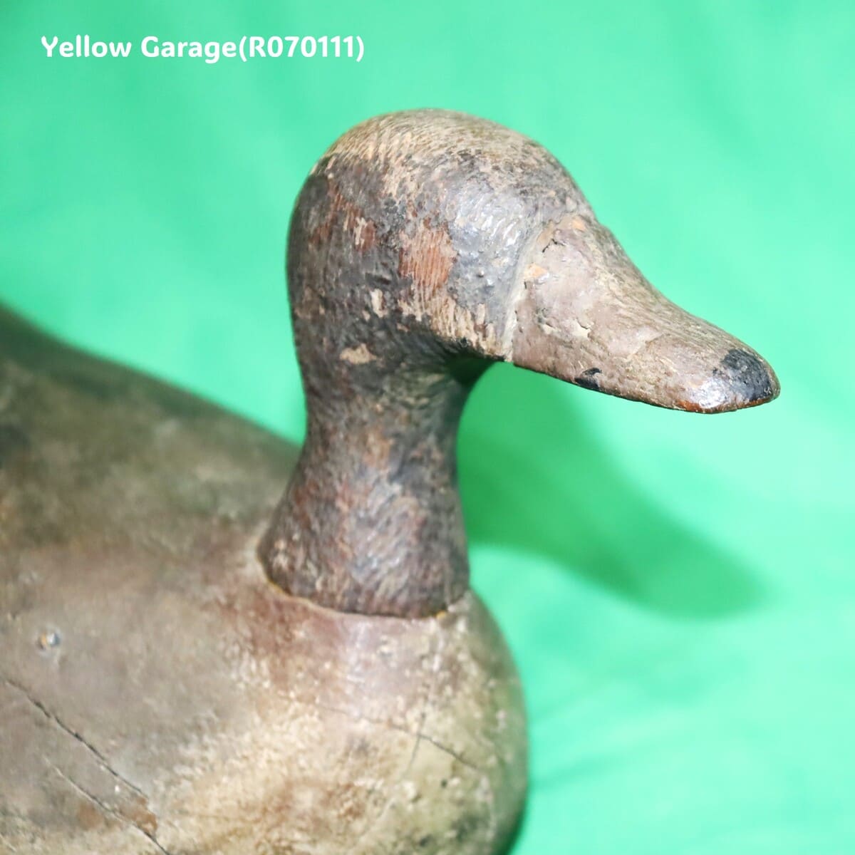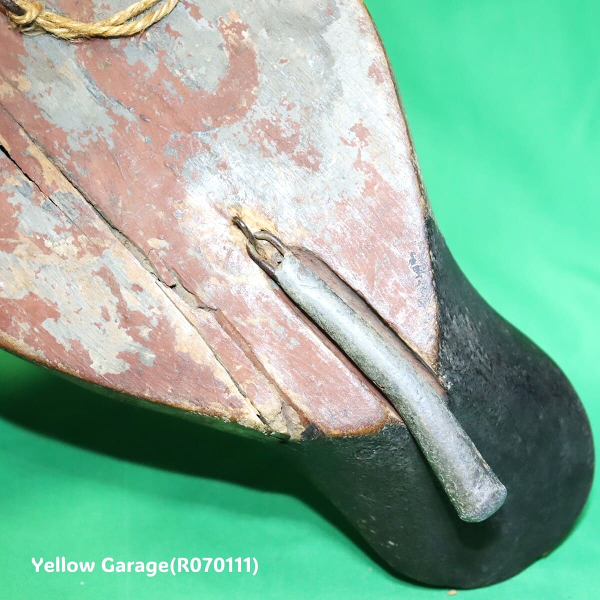 20世紀初期〜中期頃に作られたと推定される木製のカモデコイ(Duck Decoy)です。古い塗装が自然に剥がれ、木地の質感が美しく現れた味わい深い一点もの。特徴的なのは、くちばし部分が抜ける構造。これは、当時のデコイに見られるメンテナンス性を重視した設計で、破損や交換、内部の清掃を容易にするための実用的な仕組みと考えられます。ボディ下部には鉛製のおもりが装着されており、水上での安定性を確保。前方のロープと金具は、実際に水面へ浮かべる際の係留用として機能していました。現存するアンティークデコイの中でも、このようにオリジナルの構造を保った個体は非常に希少です。自然な経年変化とともに、古き良きアメリカのアウトドアカルチャーを感じられる逸品です。(R070111)