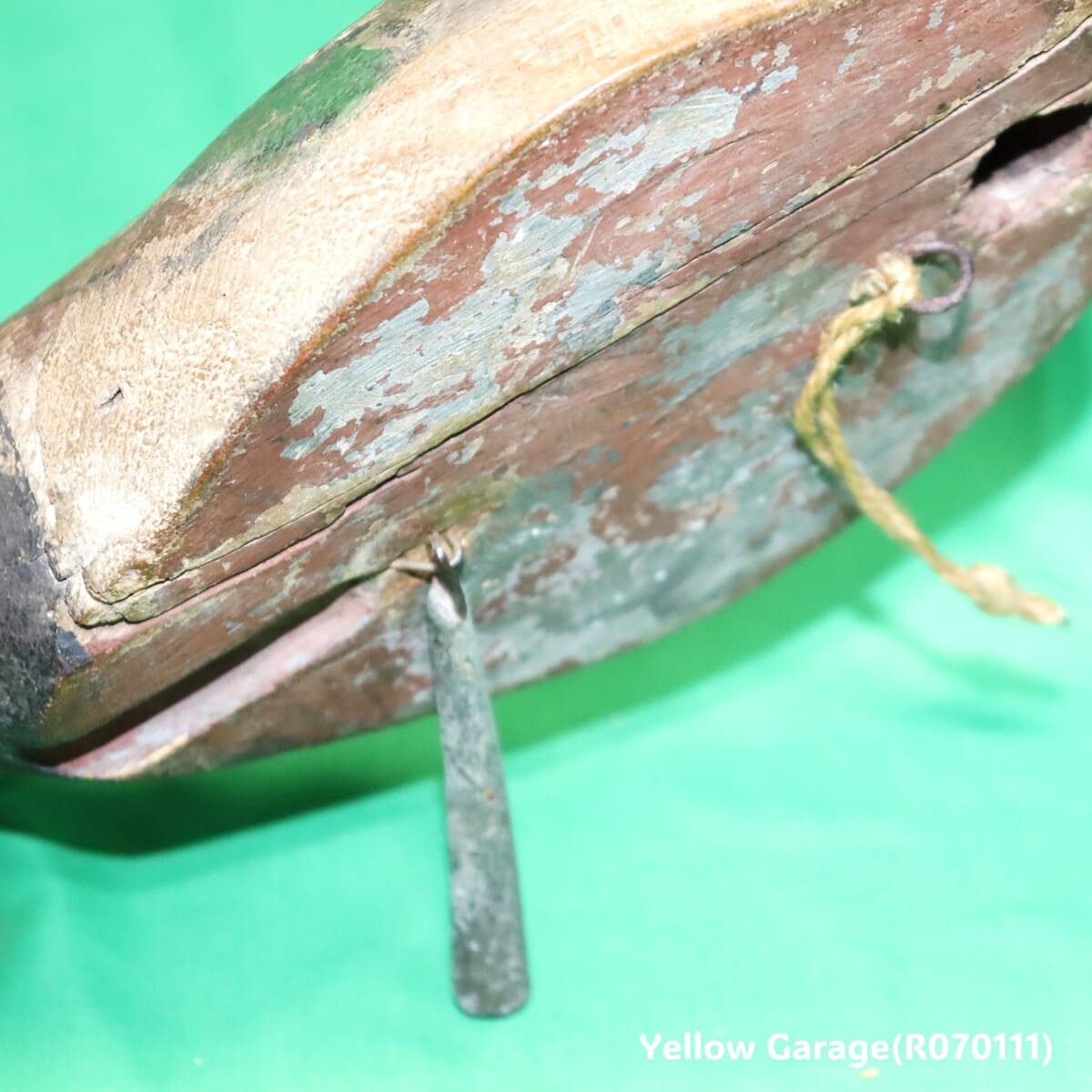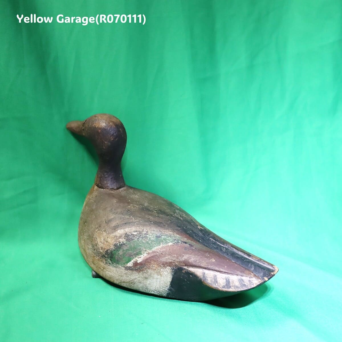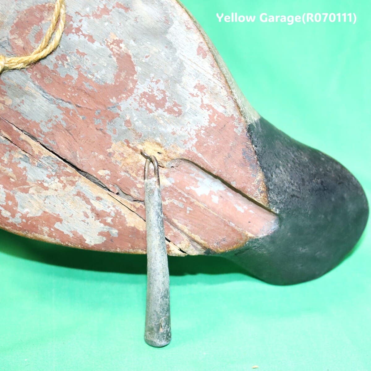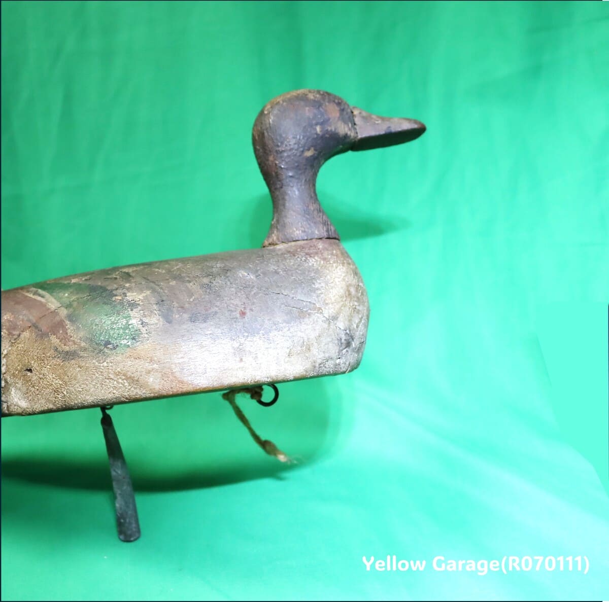 20世紀初期〜中期頃に作られたと推定される木製のカモデコイ(Duck Decoy)です。古い塗装が自然に剥がれ、木地の質感が美しく現れた味わい深い一点もの。特徴的なのは、くちばし部分が抜ける構造。これは、当時のデコイに見られるメンテナンス性を重視した設計で、破損や交換、内部の清掃を容易にするための実用的な仕組みと考えられます。ボディ下部には鉛製のおもりが装着されており、水上での安定性を確保。前方のロープと金具は、実際に水面へ浮かべる際の係留用として機能していました。現存するアンティークデコイの中でも、このようにオリジナルの構造を保った個体は非常に希少です。自然な経年変化とともに、古き良きアメリカのアウトドアカルチャーを感じられる逸品です。(R070111)