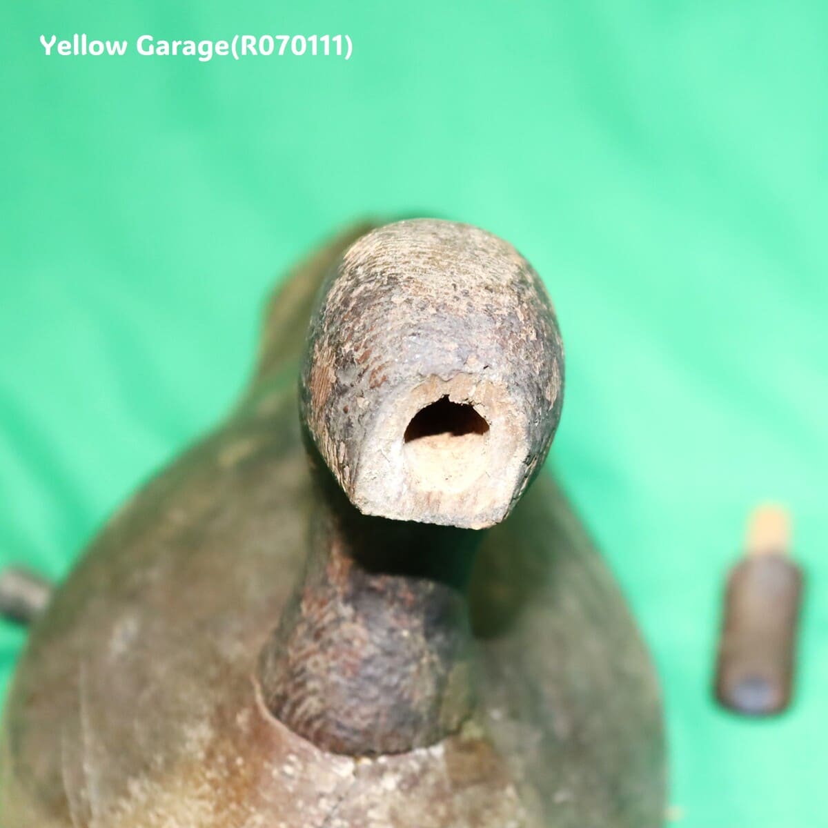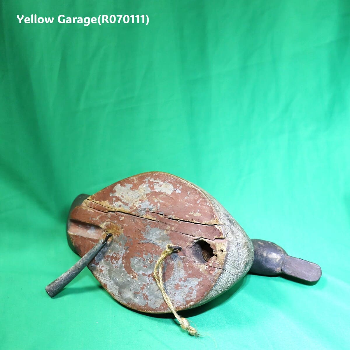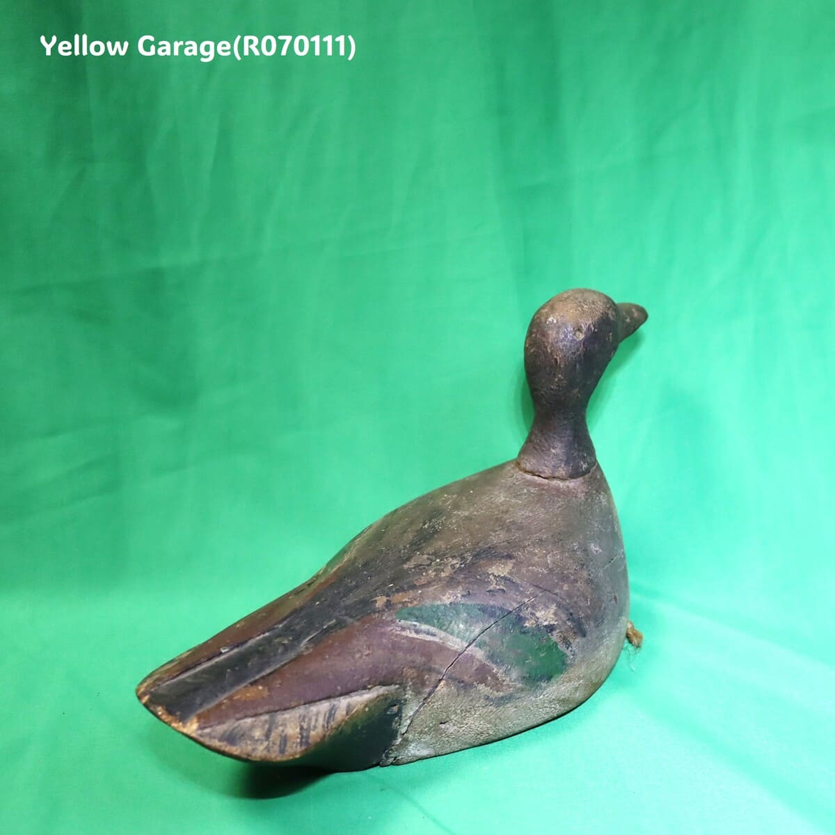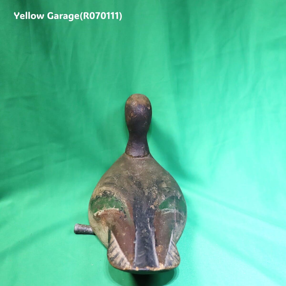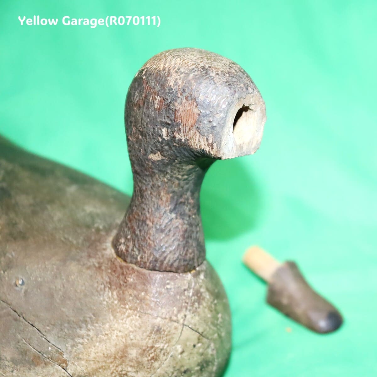 20世紀初期〜中期頃に作られたと推定される木製のカモデコイ(Duck Decoy)です。古い塗装が自然に剥がれ、木地の質感が美しく現れた味わい深い一点もの。特徴的なのは、くちばし部分が抜ける構造。これは、当時のデコイに見られるメンテナンス性を重視した設計で、破損や交換、内部の清掃を容易にするための実用的な仕組みと考えられます。ボディ下部には鉛製のおもりが装着されており、水上での安定性を確保。前方のロープと金具は、実際に水面へ浮かべる際の係留用として機能していました。現存するアンティークデコイの中でも、このようにオリジナルの構造を保った個体は非常に希少です。自然な経年変化とともに、古き良きアメリカのアウトドアカルチャーを感じられる逸品です。(R070111)