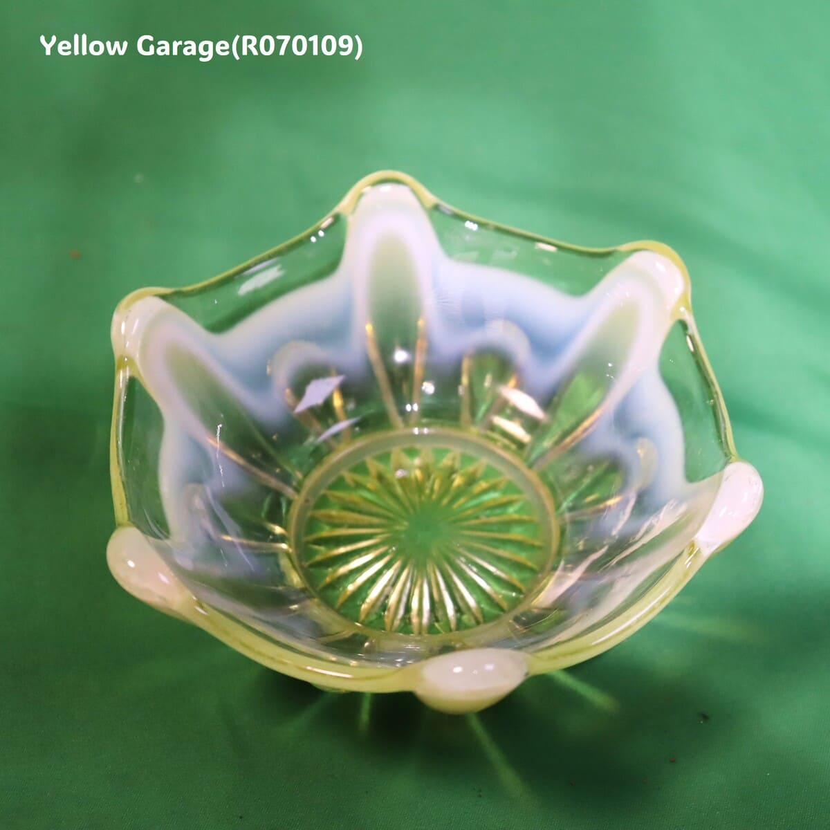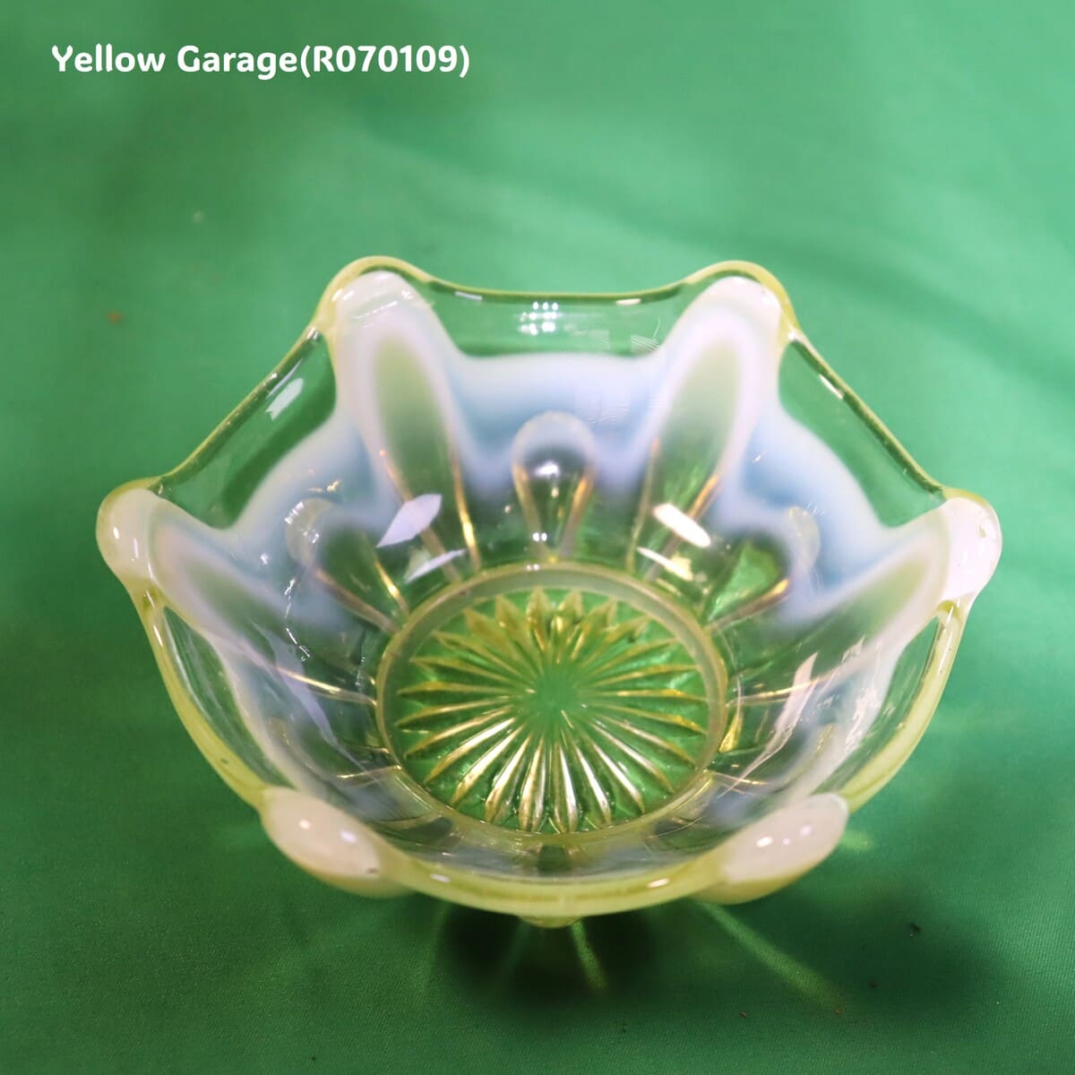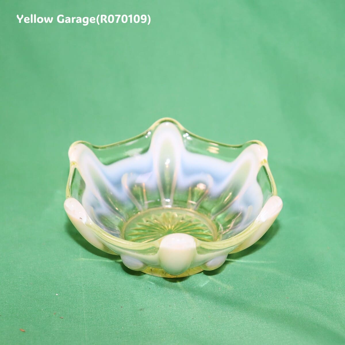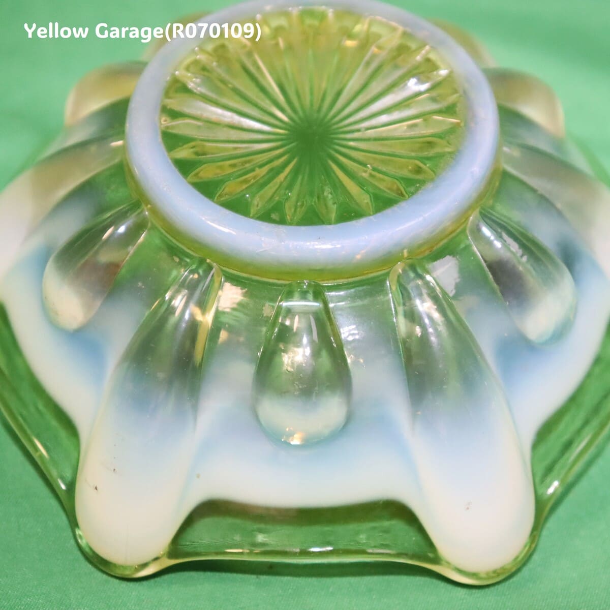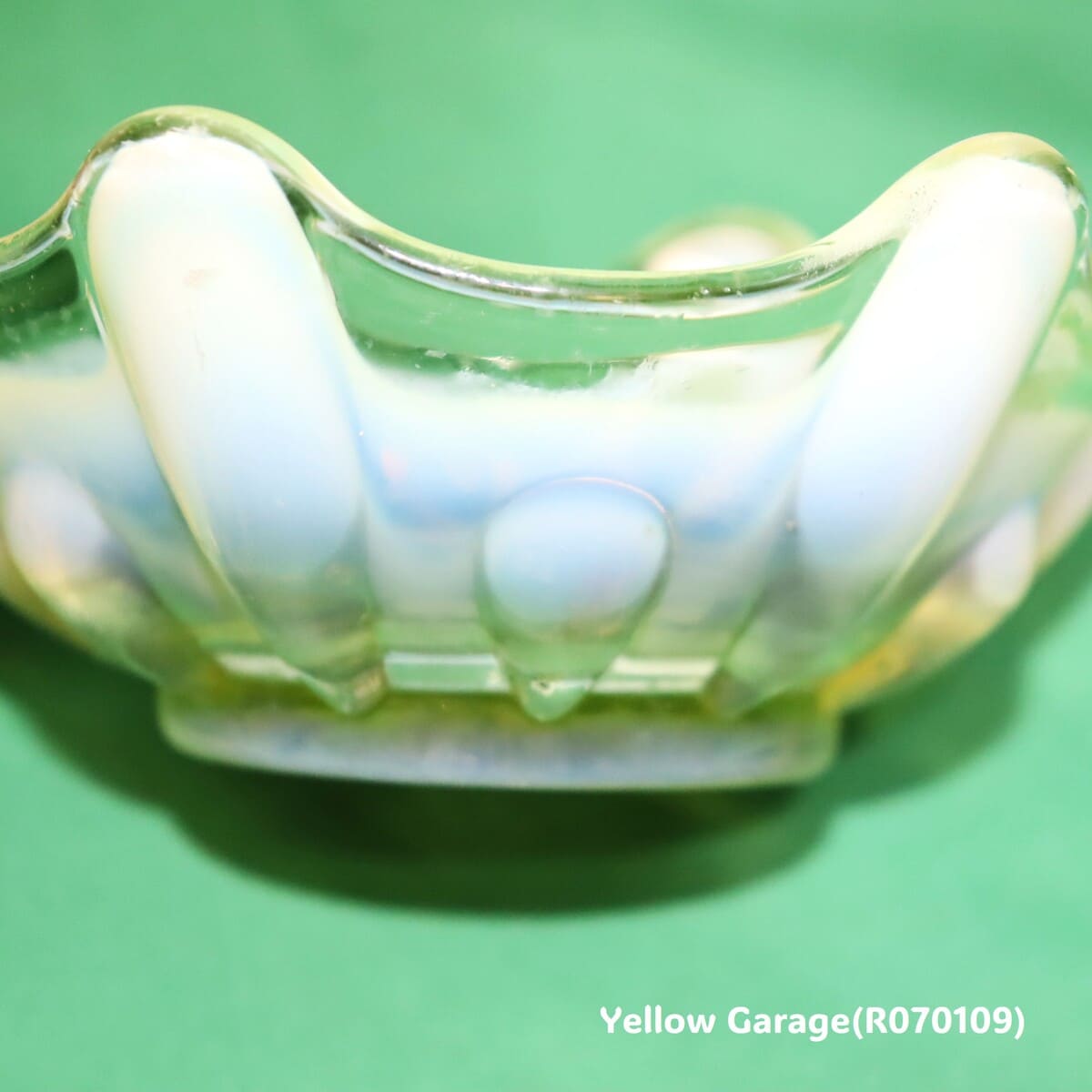 この「水しぶきの王冠のようなデザイン」は、自然をモチーフとしたアール・ヌーヴォー時代の特徴であり、芸術的な装飾ガラスにしばしば見られます。実用性よりも、「美しさそのものが価値」である時代背景を反映したデザインです。アメリカやイギリスの19〜20世紀初頭の家庭では、応接間や客間のテーブルに置いて、ナッツやキャンディをもてなす器として使われていたとも想定できます。甘いものやドライフルーツを少量入れるのにぴったりのサイズです。また、アール・デコやヴィクトリアン期の女性のドレッサーには、指輪・ブローチ・髪留めなどの小物を入れる小鉢がよく使われていました。装飾性が高いので、実用性よりも「飾って使う」目的が強かった可能性も。香りのある乾燥花(ポプリ)を入れて、香りを室内に広げる装飾容器として使われることも。波打つクラウン形状が香りを逃がすのにも適しています。