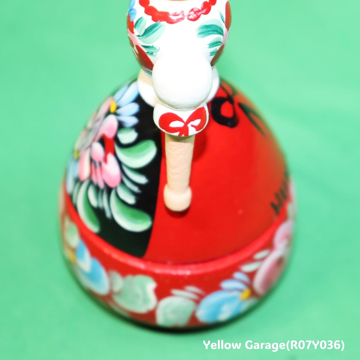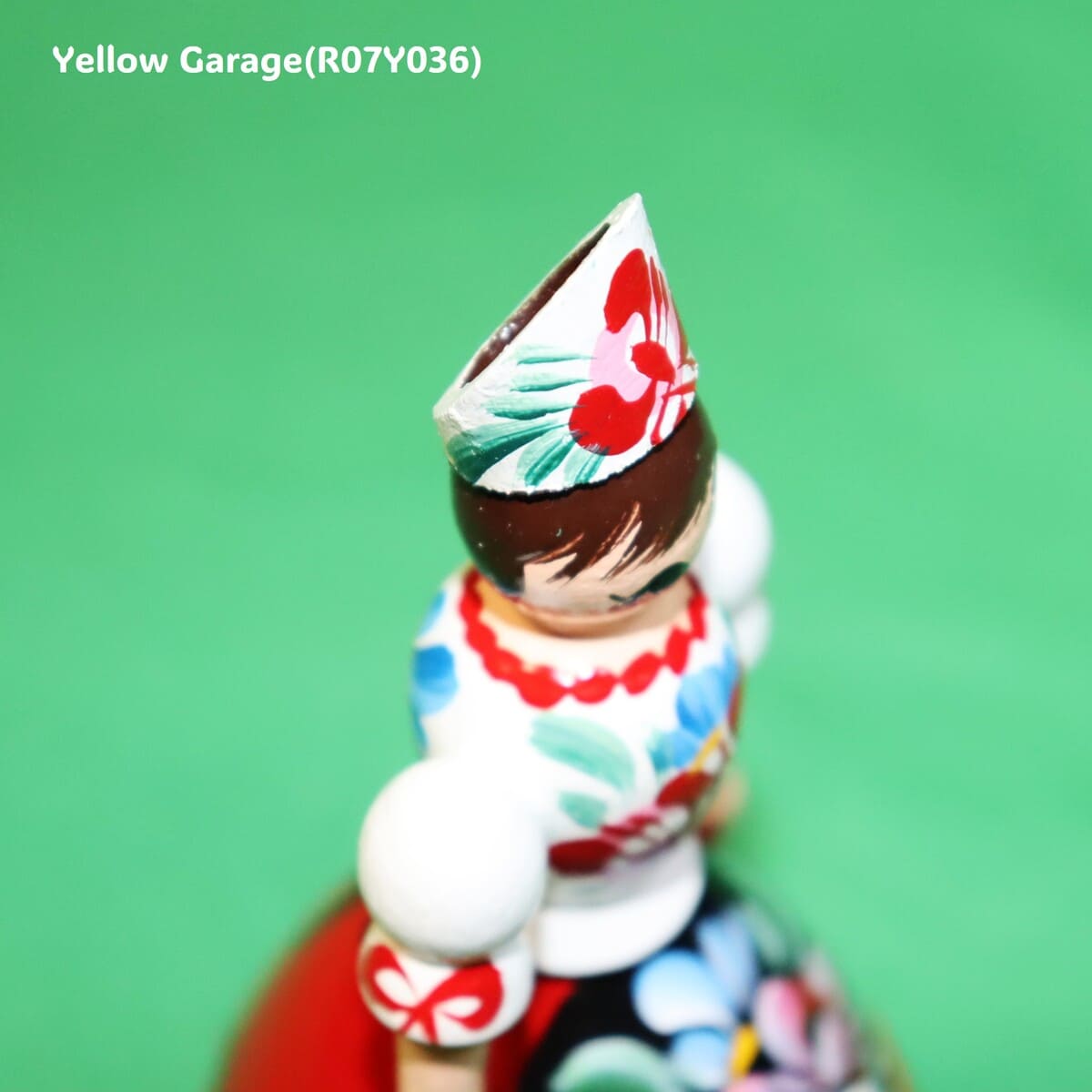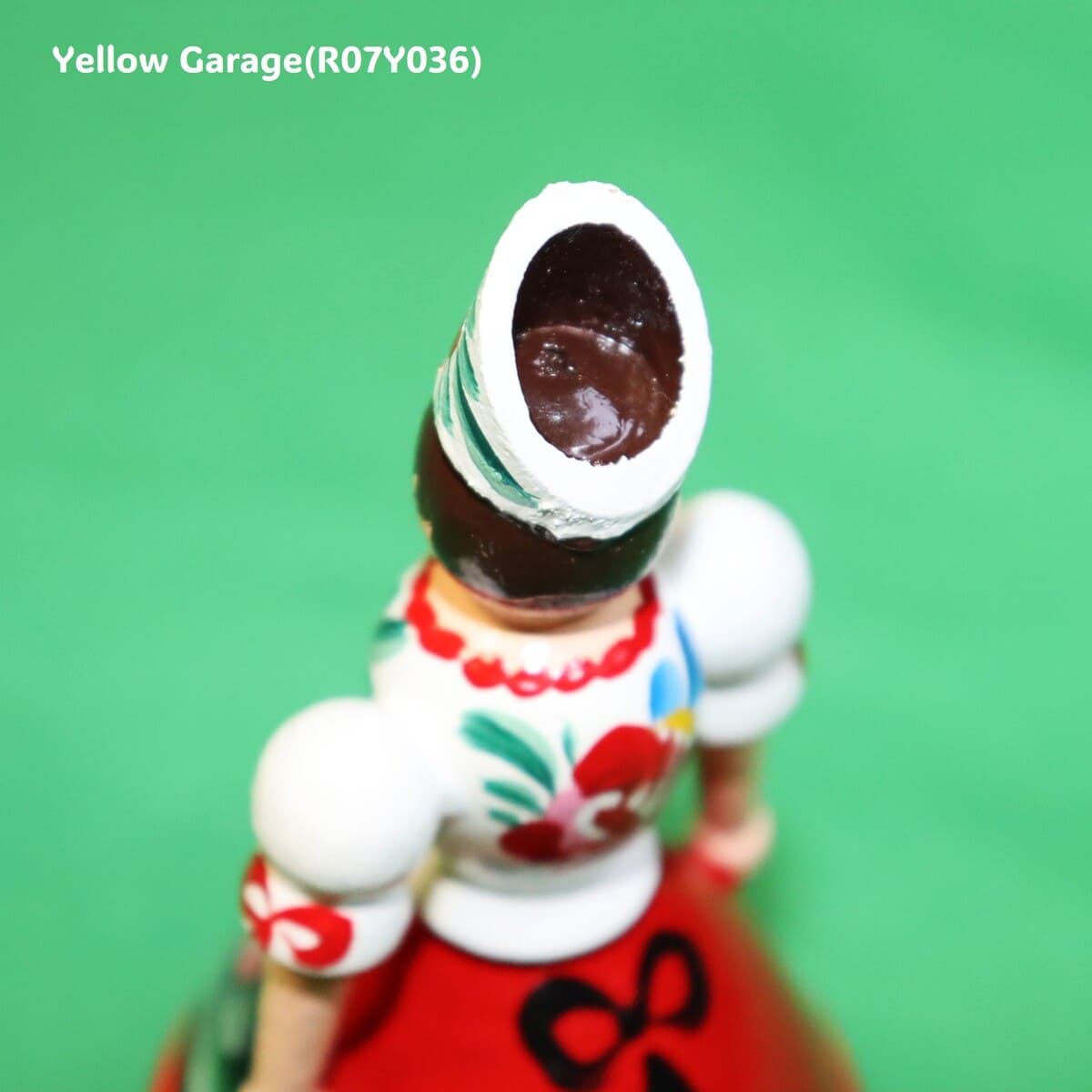 ハンガリーの民族衣装をまとった女性をモチーフにした手描きの木製ミニ人形コンテナです。鮮やかな赤をベースに、花模様や衣装の装飾が全てハンドペイントで施されており、素朴ながらも温かみのある一品。人形は上下で分離し、内部が小物入れとして使用可能です。指輪やアクセサリー、飴玉などの収納にぴったり。後ろには「HUNGARY」の文字が記されており、現地での工芸品またはお土産品として販売されていたと推測されます。(R07Y036)