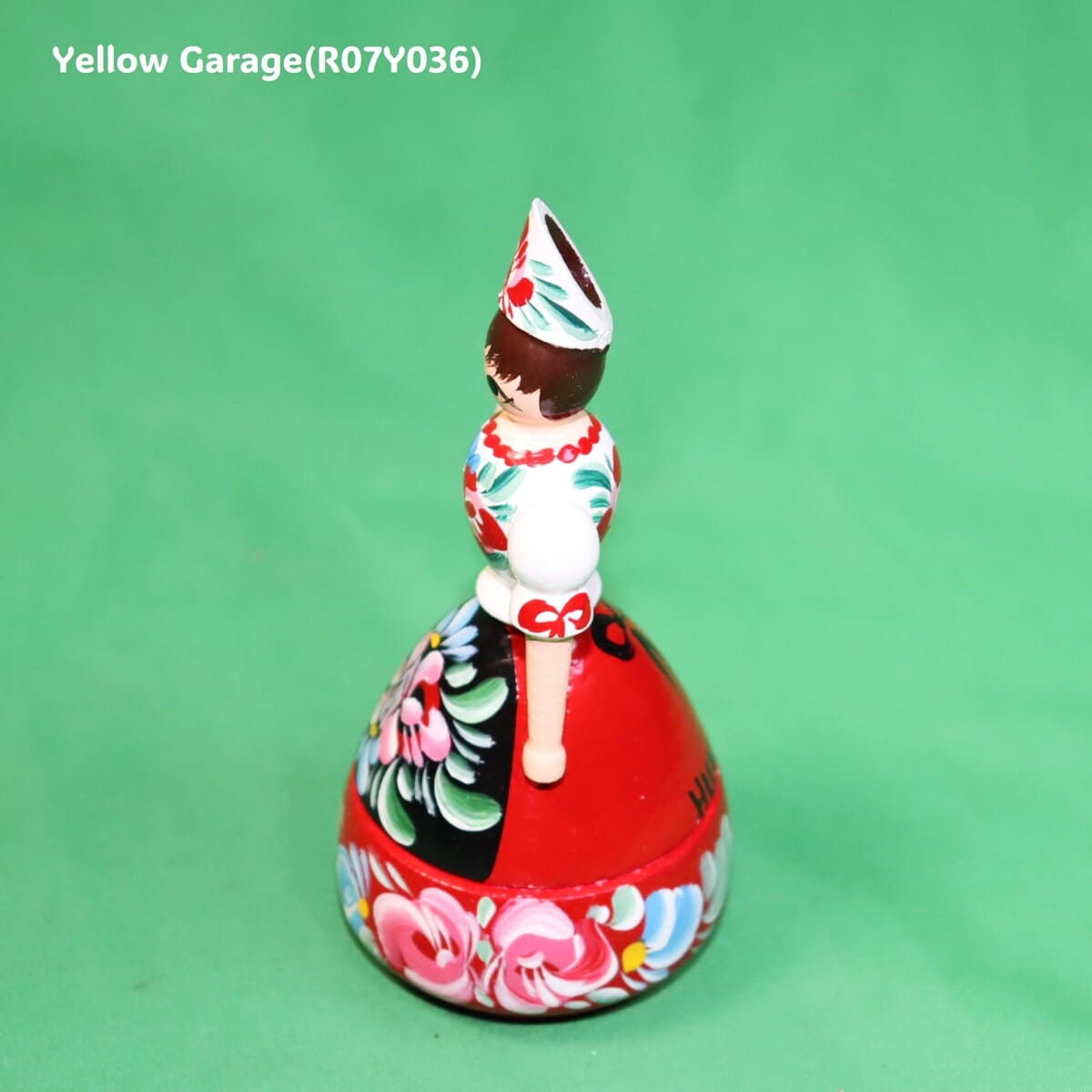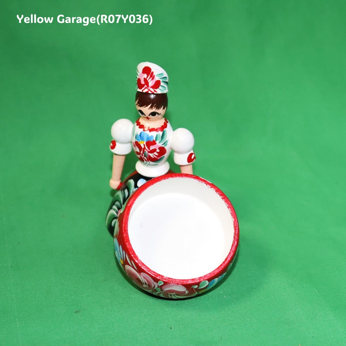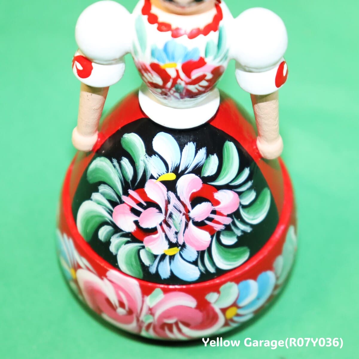 ハンガリーの民族衣装をまとった女性をモチーフにした手描きの木製ミニ人形コンテナです。鮮やかな赤をベースに、花模様や衣装の装飾が全てハンドペイントで施されており、素朴ながらも温かみのある一品。人形は上下で分離し、内部が小物入れとして使用可能です。指輪やアクセサリー、飴玉などの収納にぴったり。後ろには「HUNGARY」の文字が記されており、現地での工芸品またはお土産品として販売されていたと推測されます。(R07Y036)