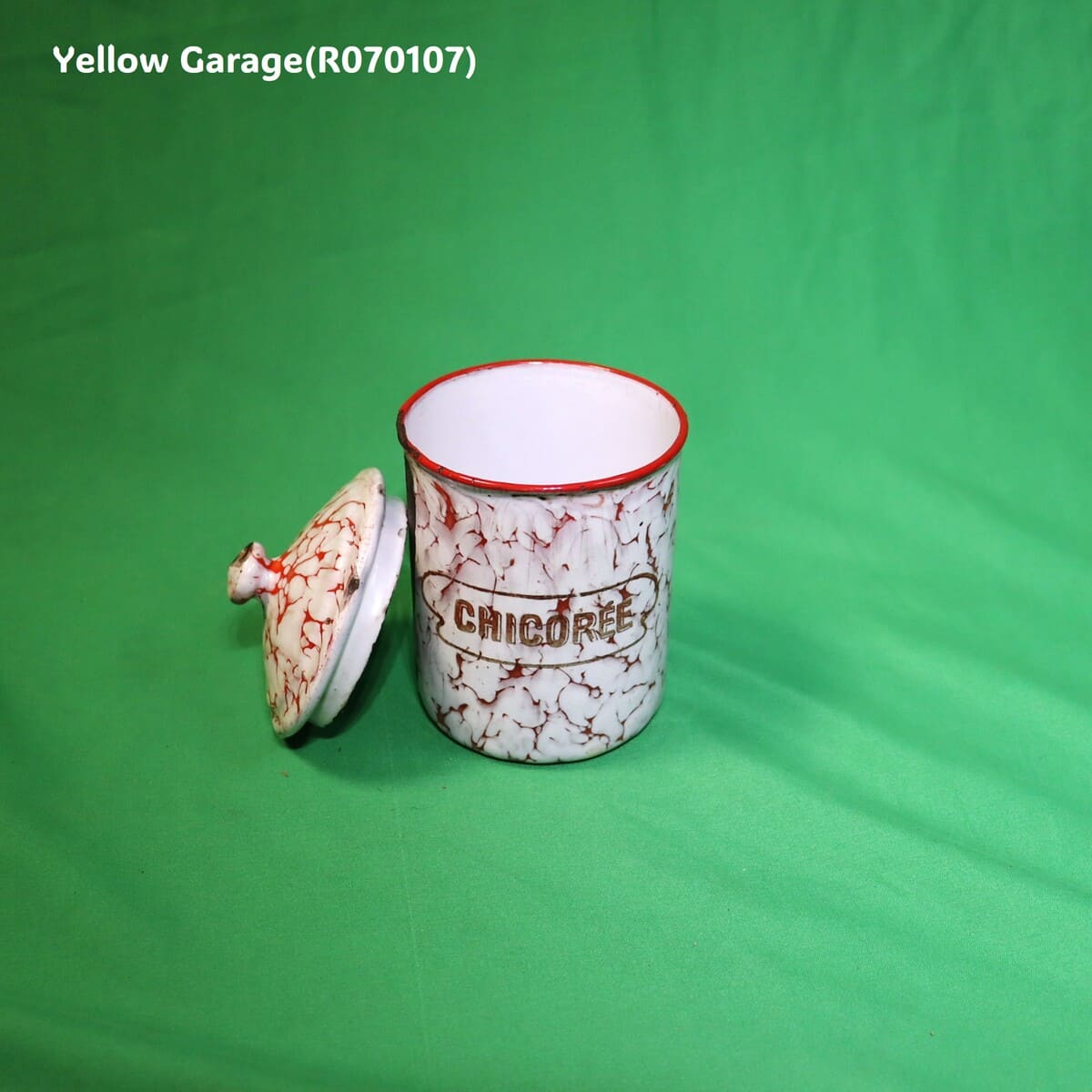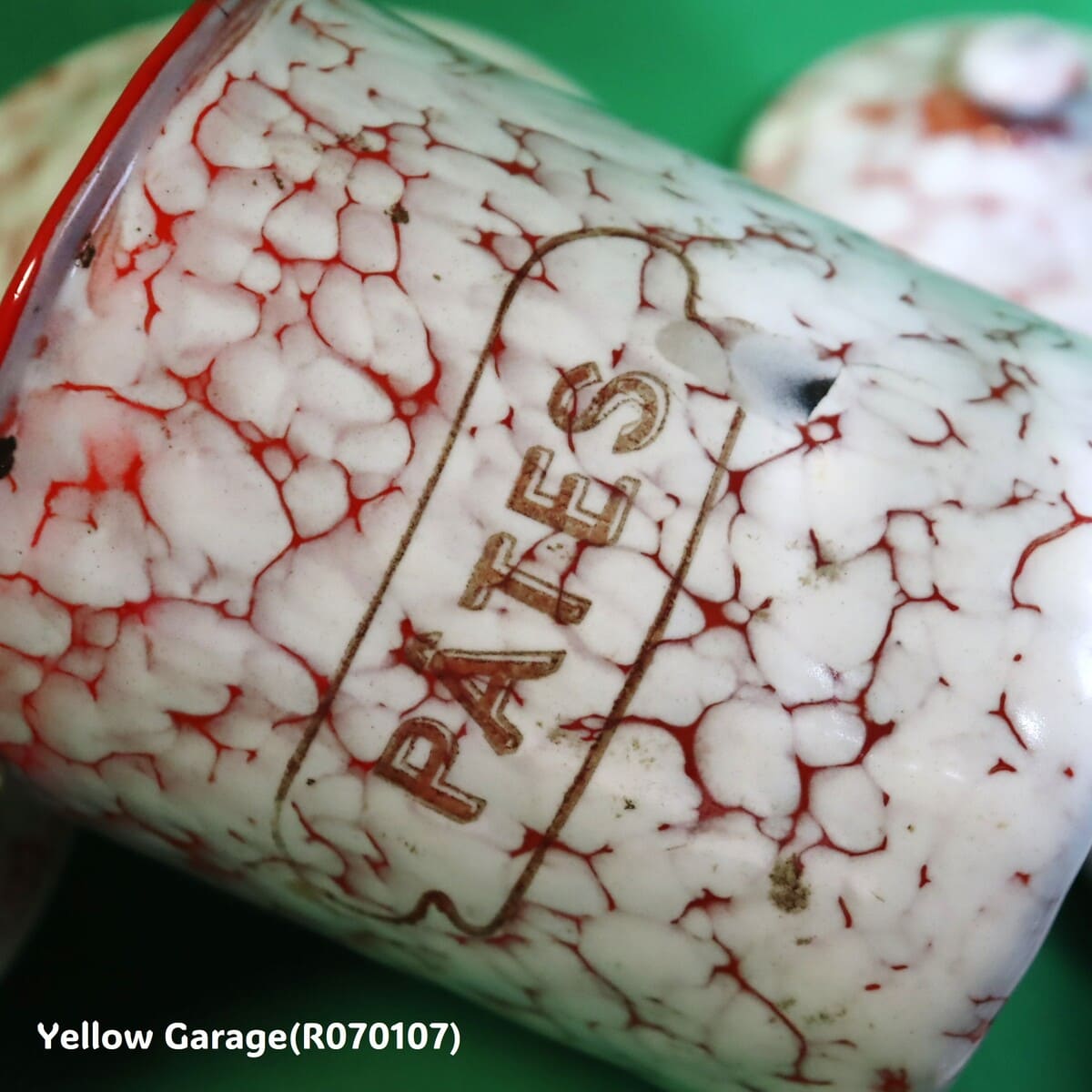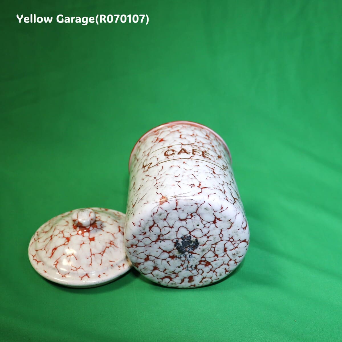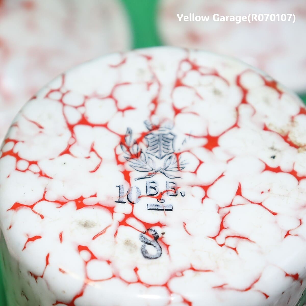 フランス製のヴィンテージホウロウキャニスターセットです。赤と白のマーブル模様が印象的で、可愛らしくも品のある佇まい。各容器にはそれぞれフランス語で「砂糖(SUCRE)」「コーヒー(CAFE)」「パスタ(PÂTES)」「チコリ(CHICORÉE)」「胡椒(POIVRE)」の表示があり、ヨーロッパの古き良きキッチンの風景を彷彿とさせます。すべての容器は入れ子式になっており、コンパクトに収納が可能です。底面には「王冠とオリーブ」の印と「B.B.」の刻印、さらにサイズ番号(12、10、9、8、7)が記されています。一部サイズが抜けている可能性がある点も、アンティークならではの味わいといえるでしょう。(R070107)