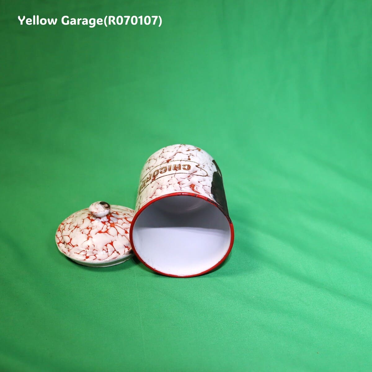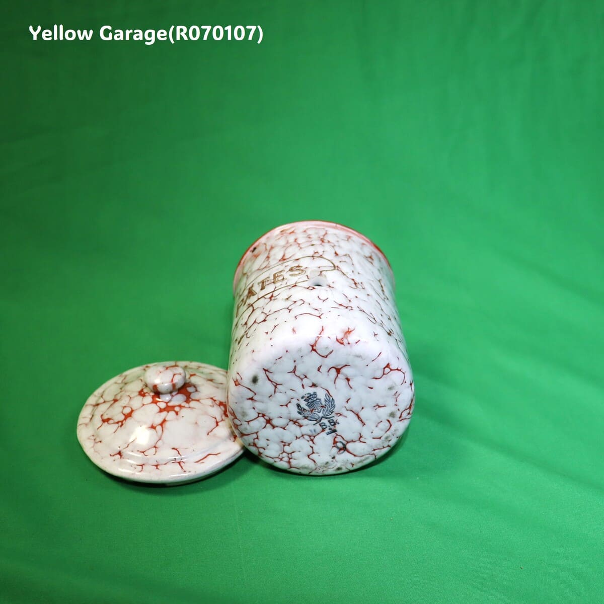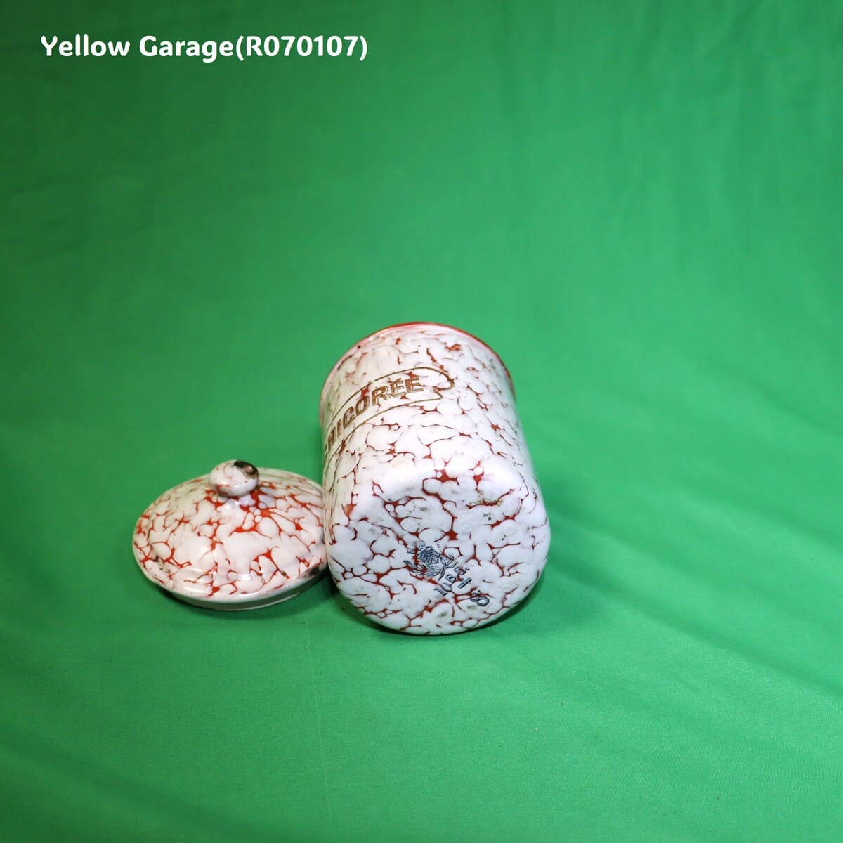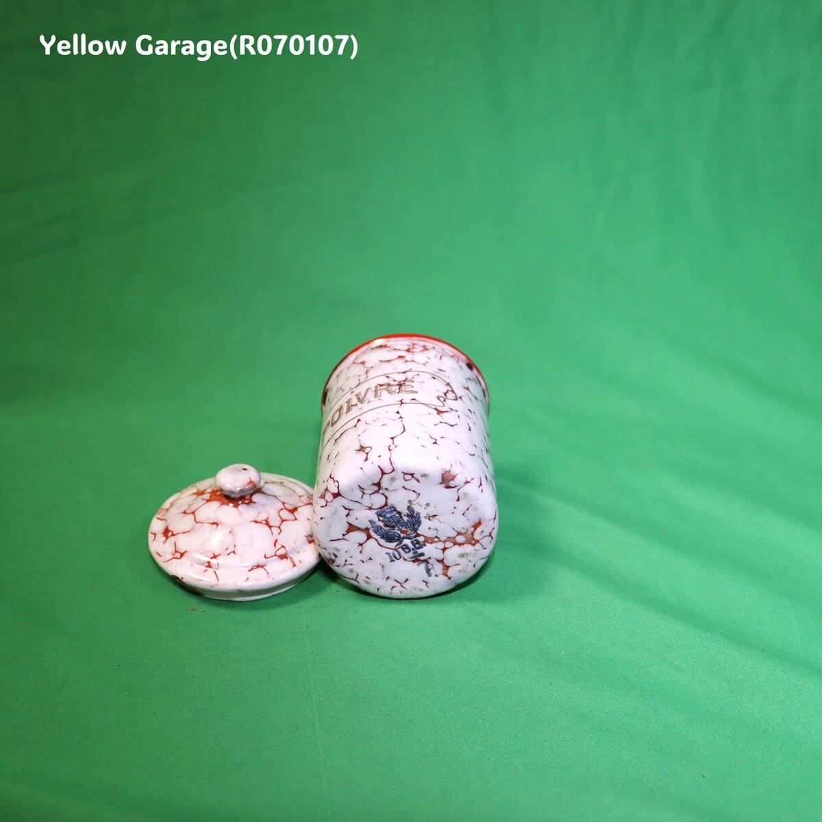 フランス製のヴィンテージホウロウキャニスターセットです。赤と白のマーブル模様が印象的で、可愛らしくも品のある佇まい。各容器にはそれぞれフランス語で「砂糖(SUCRE)」「コーヒー(CAFE)」「パスタ(PÂTES)」「チコリ(CHICORÉE)」「胡椒(POIVRE)」の表示があり、ヨーロッパの古き良きキッチンの風景を彷彿とさせます。すべての容器は入れ子式になっており、コンパクトに収納が可能です。底面には「王冠とオリーブ」の印と「B.B.」の刻印、さらにサイズ番号(12、10、9、8、7)が記されています。一部サイズが抜けている可能性がある点も、アンティークならではの味わいといえるでしょう。(R070107)