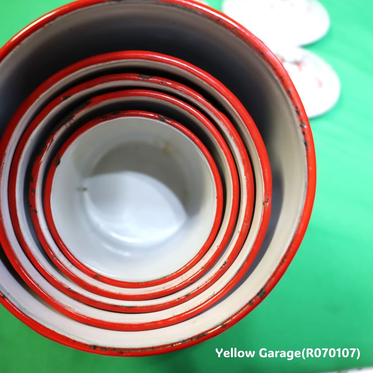 「入れ子式(ネスティング)」のデザインは、19世紀末から20世紀中頃にかけてのヨーロッパやアメリカの家庭用品・キッチン用品で非常によく見られる機能的な特徴でした。当時の多くの家庭では収納スペースが限られていたため、使わないときはコンパクトにしまえる入れ子式は非常に合理的でした。特に戦後の復興期や都市部では、小さな台所での省スペース設計が重要視されていました。生産者や商社にとっても、入れ子式にすることで梱包・輸送時のスペース削減が可能になり、コストの抑制にも繋がりました。この時代の容器や調理器具、食器はサイズ違いの「セット商品」として販売されることが多く、それをまとめて入れられるように設計されたものが好まれました。ホウロウは丈夫で滑りが良いため、入れ子にしても摩擦が少なく、傷もつきにくいという特性があり、ホウロウ製の入れ子セットは特に人気がありました。
