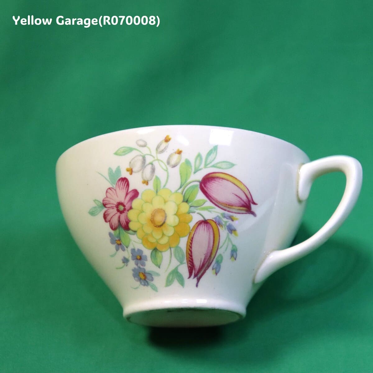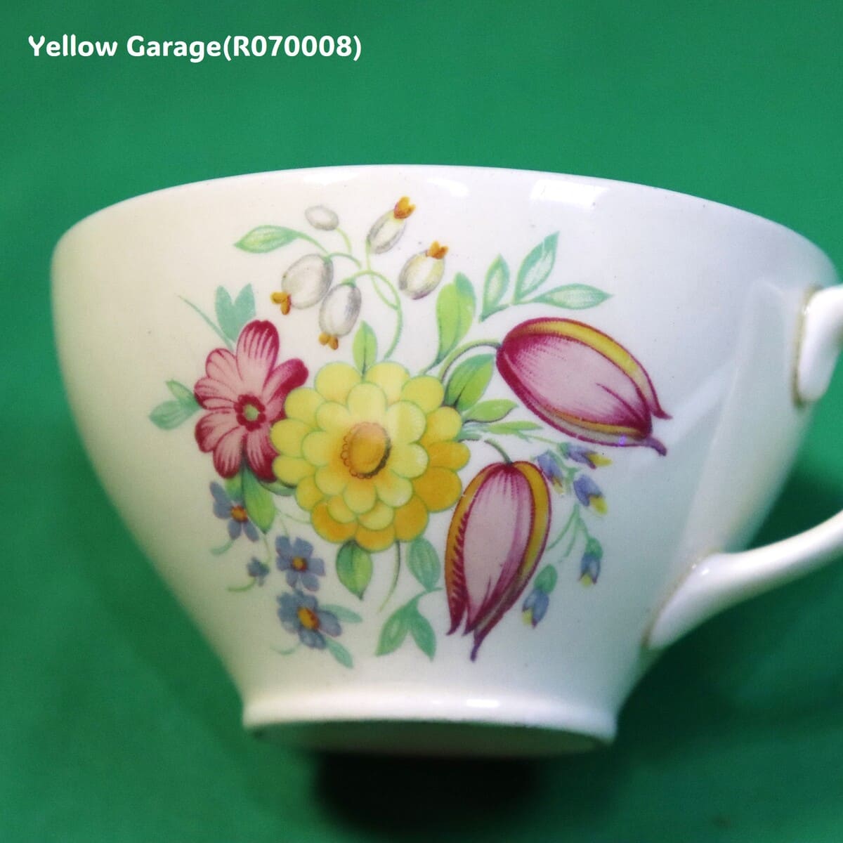 Susie Cooper(スージー・クーパー)カップ&ソーサー(花柄デザイン)イギリスの名陶デザイナー Susie Cooper による、フローラルデザインのカップ&ソーサーセットです。鮮やかなイエローやピンク、パープルの花々がハンドペイント風に描かれており、明るく華やかな印象を与えます。ティータイムを特別なひとときに演出するアンティークアイテムです。(R070008)