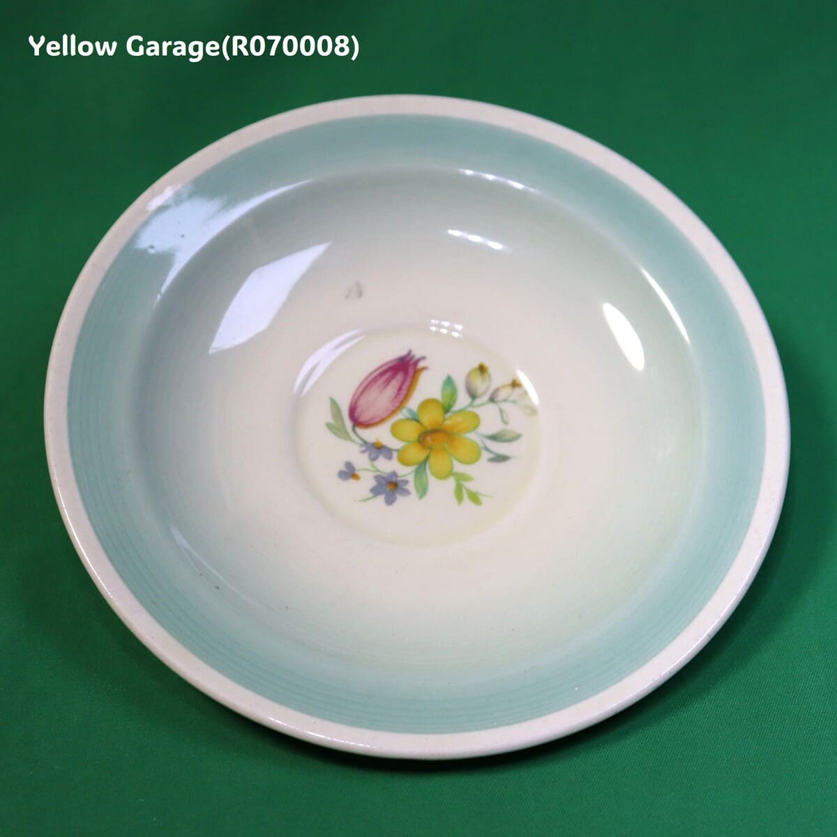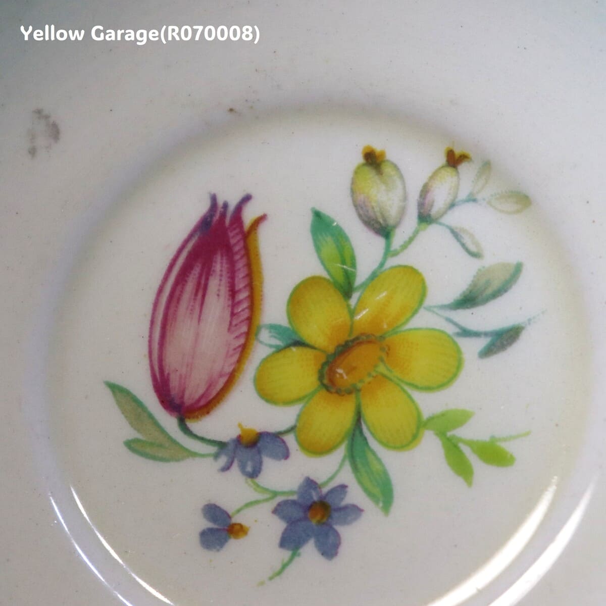 Swansea Spray(スワンジー・スプレイ)と呼ばれる、スージー・クーパーが1930年代にデザインした花柄の可能性が高いと考えられます。「スワンジー」はウェールズの地名で、「スプレイ」は花束や枝葉を描いたデザインのことを指します。1935年頃に発表されたシリーズで、フローラルモチーフの中でも人気の高いデザインの一つです。また、スージー・クーパーの1930年代〜50年代の作品は「転写(transfer print)」と「手彩色(hand-painted)」を組み合わせた技法 が多く使われています。採食部分のわずかな個体差から、このティーセットの絵柄は 「輪郭は転写、彩色は手描き」 で仕上げられている可能性が高いと思われます。