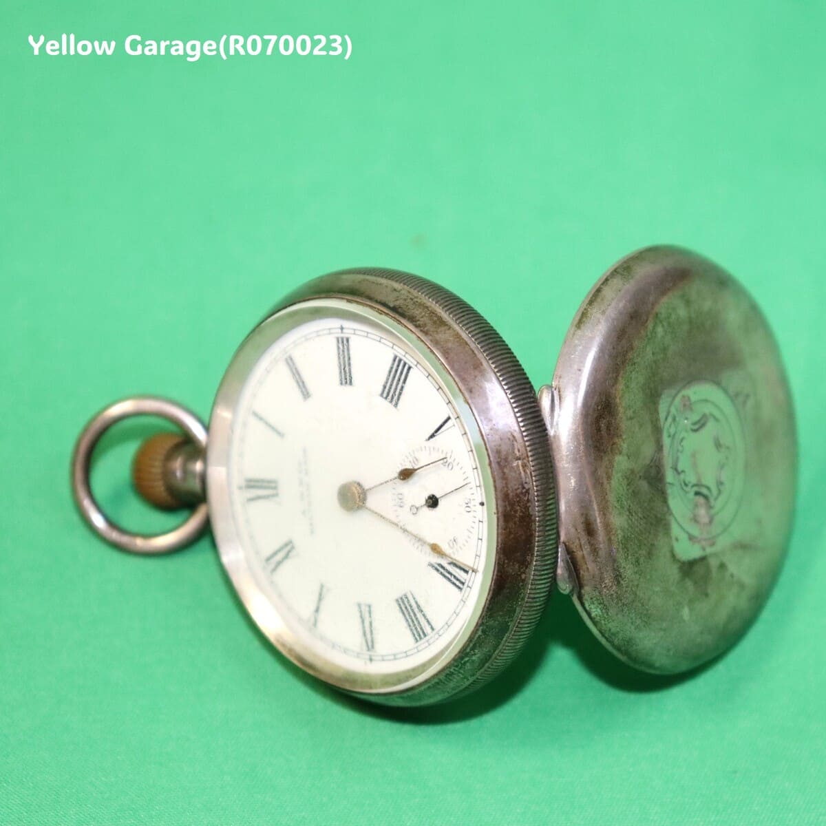 アメリカの名門 Waltham Watch Company(ウォルサム社) によるアンティーク懐中時計です。文字盤には 「A.W.W.Co. Waltham, Mass.」 の表記があり、19世紀後半から20世紀初頭の製造と考えられます。裏蓋にはライオン(獅子)、錨、そして「D」の刻印があり、イギリス・バーミンガムでの銀製品のホールマークを示しています。ケース裏面には家紋のような紋章風の彫刻があり、当時の持ち主の特注品であった可能性もあります。(R070023)