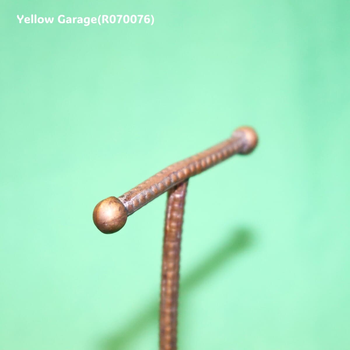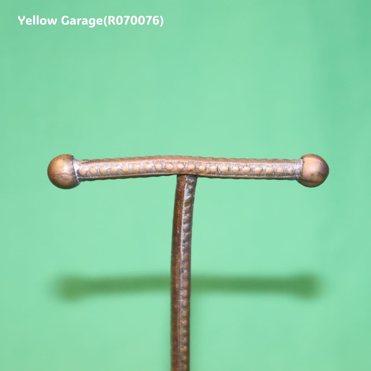 「PT 27」の刻印が底面に残る、真鍮製のアンティークアクセサリースタンドです。縦棒・横棒ともに縞々のリング模様が施され、クラシカルで重厚感のあるデザイン。小ぶりながらも存在感があり、指輪やブレスレット、イヤリングなどを美しくディスプレイするのに最適です。経年によるサビやくすみがアンティークならではの趣を醸し出し、インテリアとしても魅力的な一点物です。(R070076)