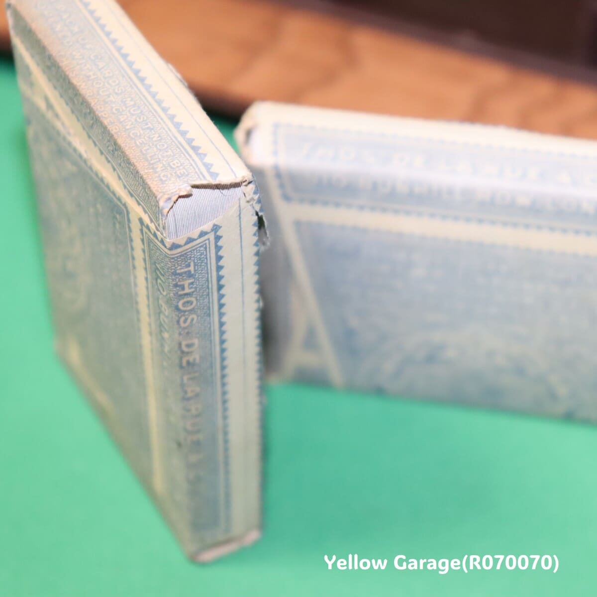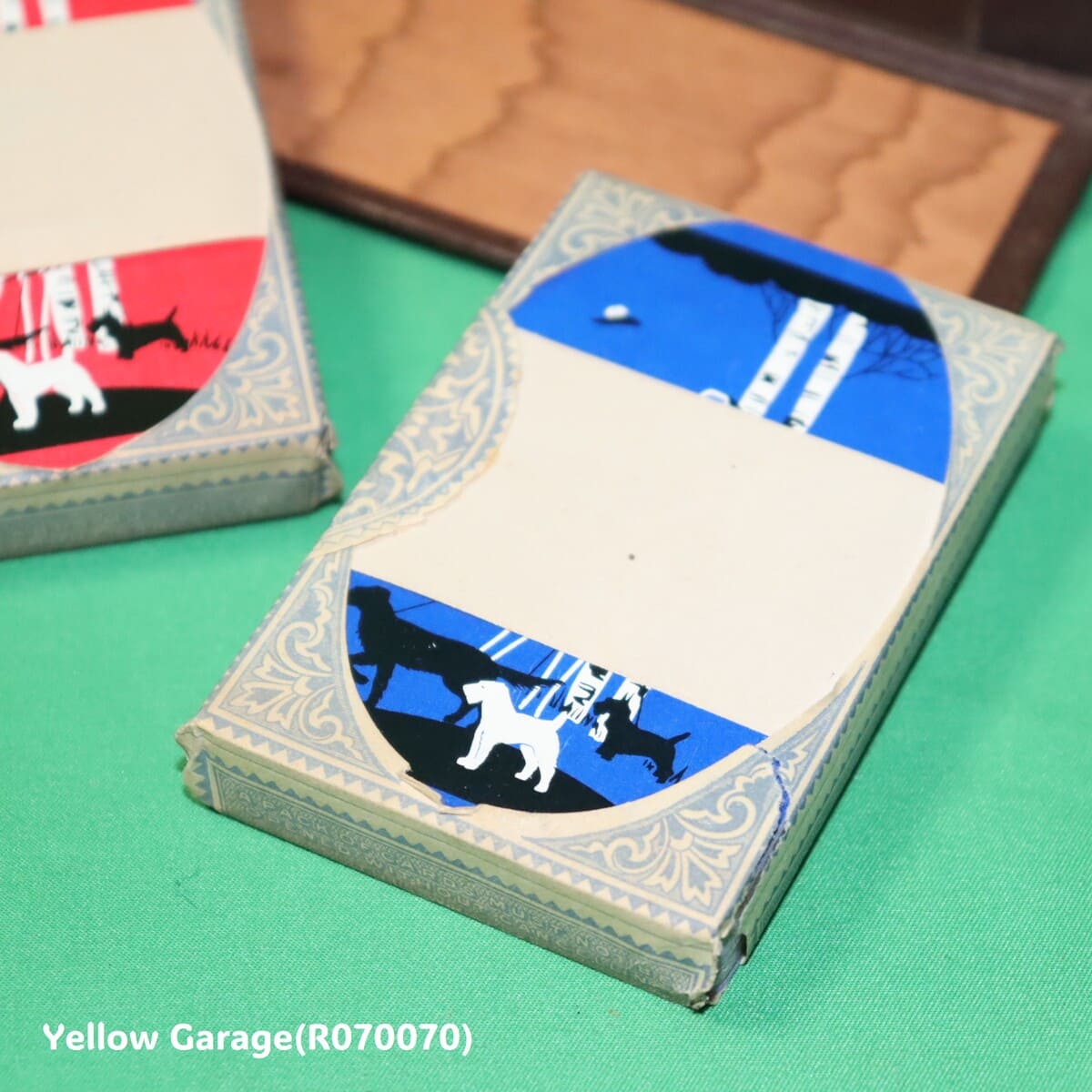 英国の伝統を感じさせる、ヴィンテージのブリッジゲームセットです。豪華な木目調の収納ケースに、未使用の状態でスコアカード3冊と鉛筆3本、さらに美しいデザインのトランプ2組(赤・青)が収められています。カードは「THOS. DE LA RUE & CO. LTD.」(ロンドン・110 BUNHILL ROW)製で、かつて王室御用達のメーカーとして知られた高品質な逸品です。つまり、このブリッジセットは一般庶民の娯楽用というよりは、贅沢品・社交アイテムとして流通していた可能性が高いです。(R070070)