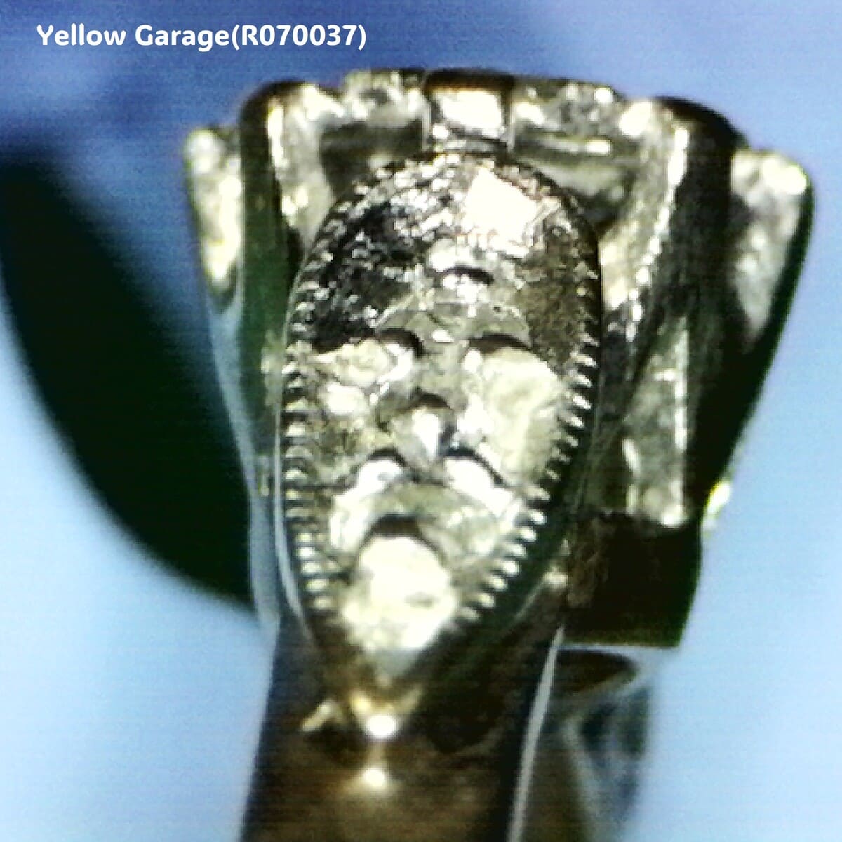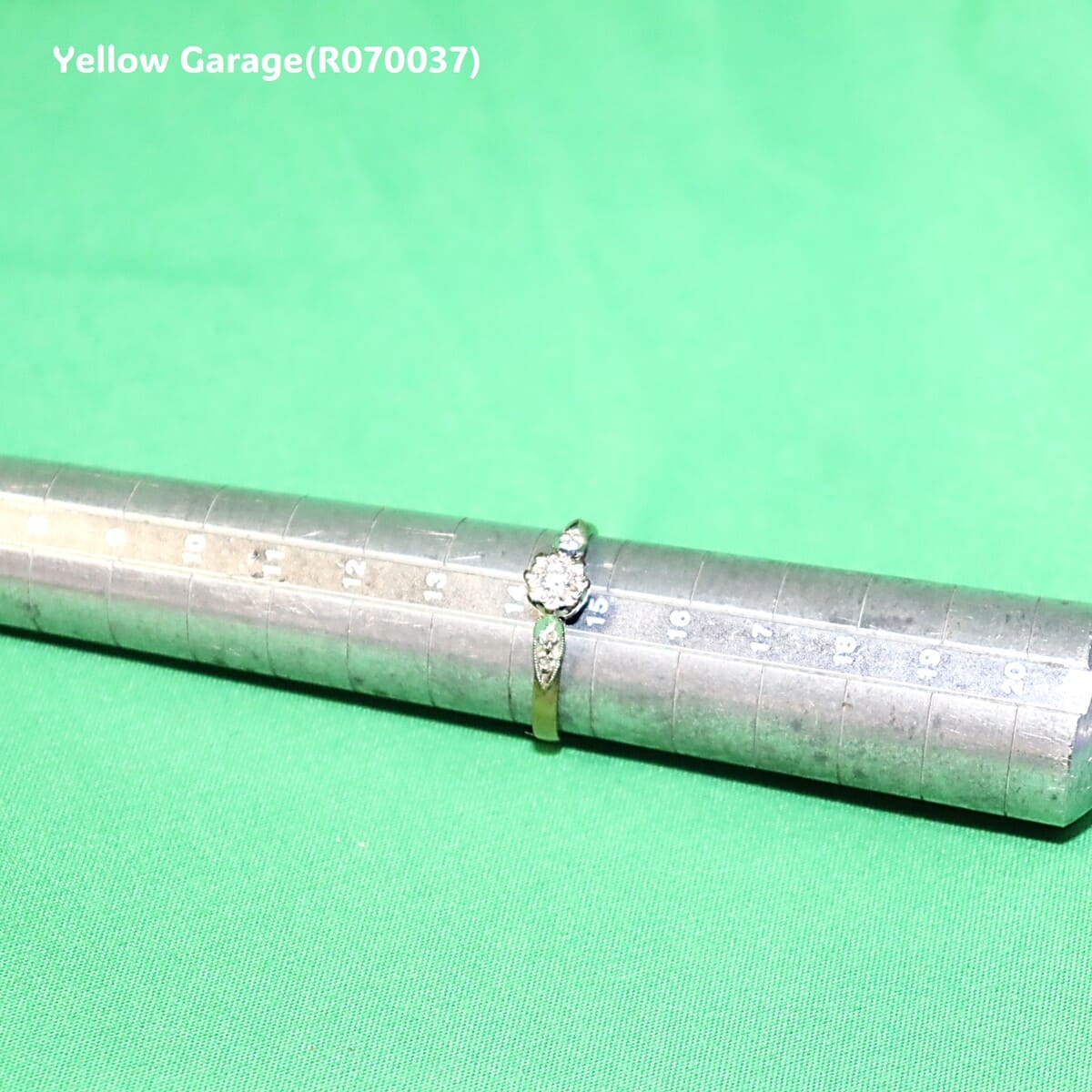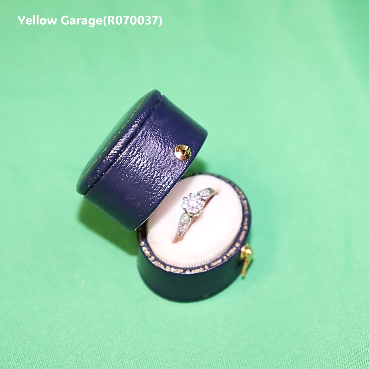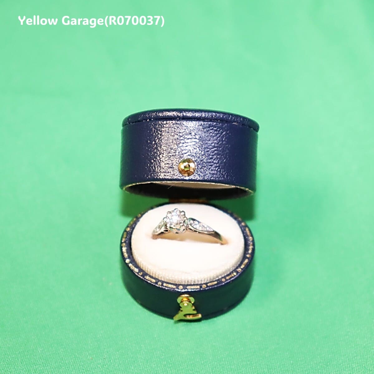 1989年、イギリス・バーミンガムで製作されたと推定されるアンティークダイヤモンドリングです。中央には可憐な花を思わせるラウンドカットのダイヤモンドが1石、そして両サイドにはリーフモチーフのようにデザインされたメレダイヤが計4石あしらわれています。石座の装飾やリングアームの細工も細やかで、時代を感じさせる品のある一本です。ホールマークには「A&GL」のメーカーズマーク、王冠、375(9金)、動物のマーク、そして「P」のデートレターが刻印されており、これにより1989年製と判断されます。リングサイズは日本サイズで約14.5号。英国サイズではN付近と推定されます。付属のネイビーブルーの丸型ヴィンテージリングケースは開閉もスムーズで、贈り物や保管にも適しています。(R070037)