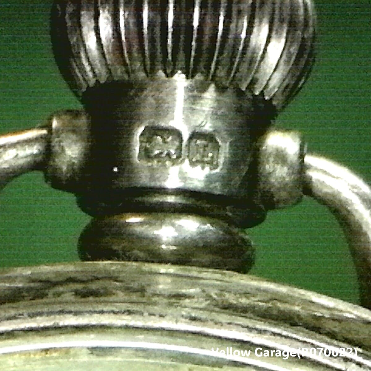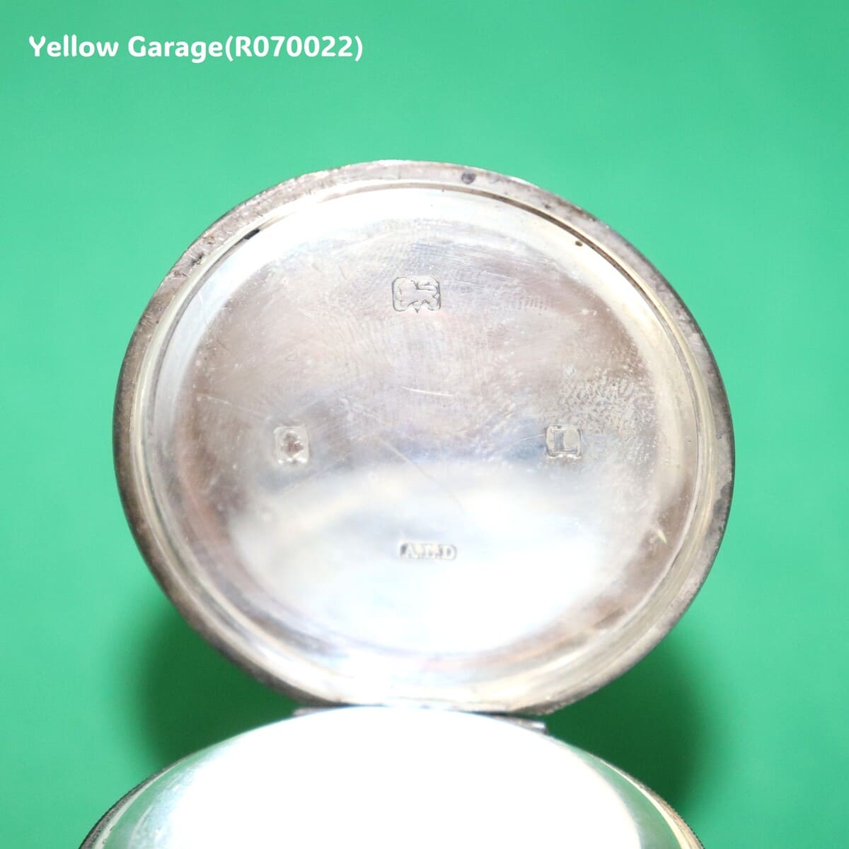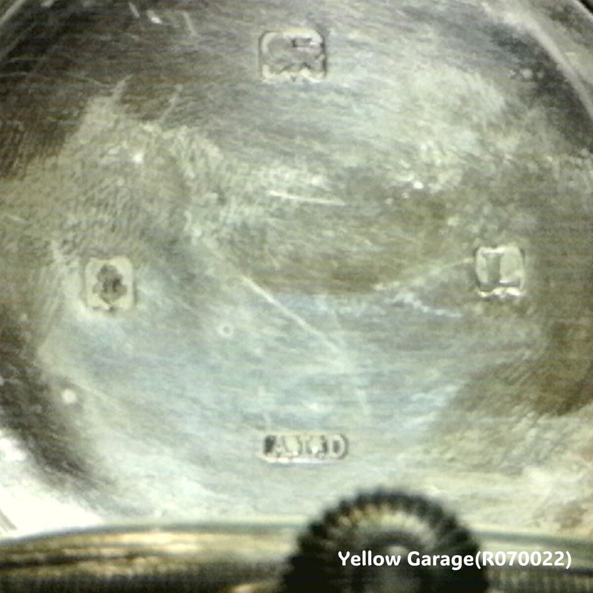 懐中時計の裏蓋刻印はイギリスのホールマークで、以下の意味があります:ライオン(Passant):スターリングシルバー(銀純度92.5%以上)を示します。錨(Anchor):イングランドのバーミンガム(Birmingham)にあるアセイオフィス(検定所)を意味します。「A.L.D」は Dennison Watch Case Company(アーロン・ルフス・デニソン設立のケースメーカー)のマークで、スイス製ムーブメントをイギリスでケースに収めて販売していたことを示します。