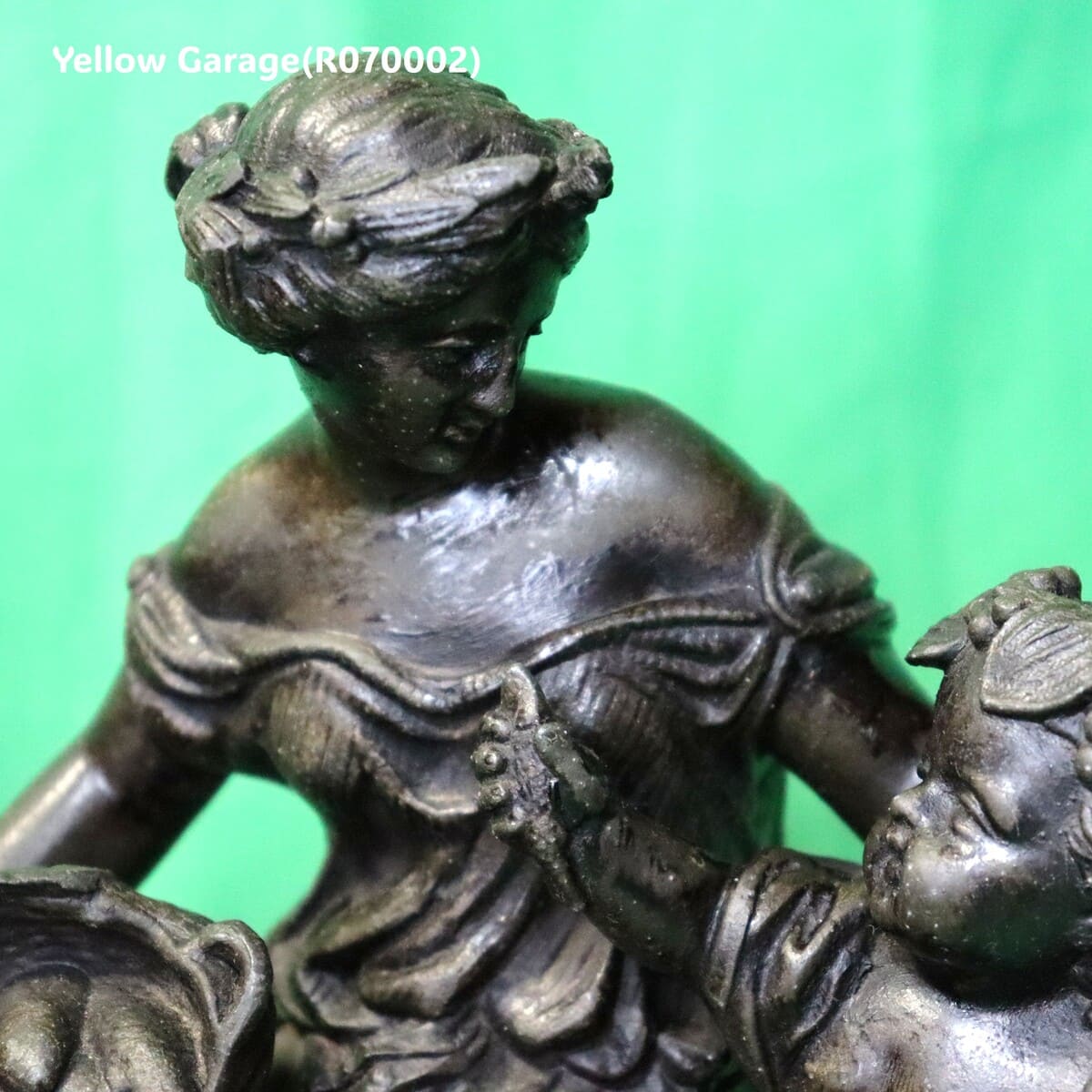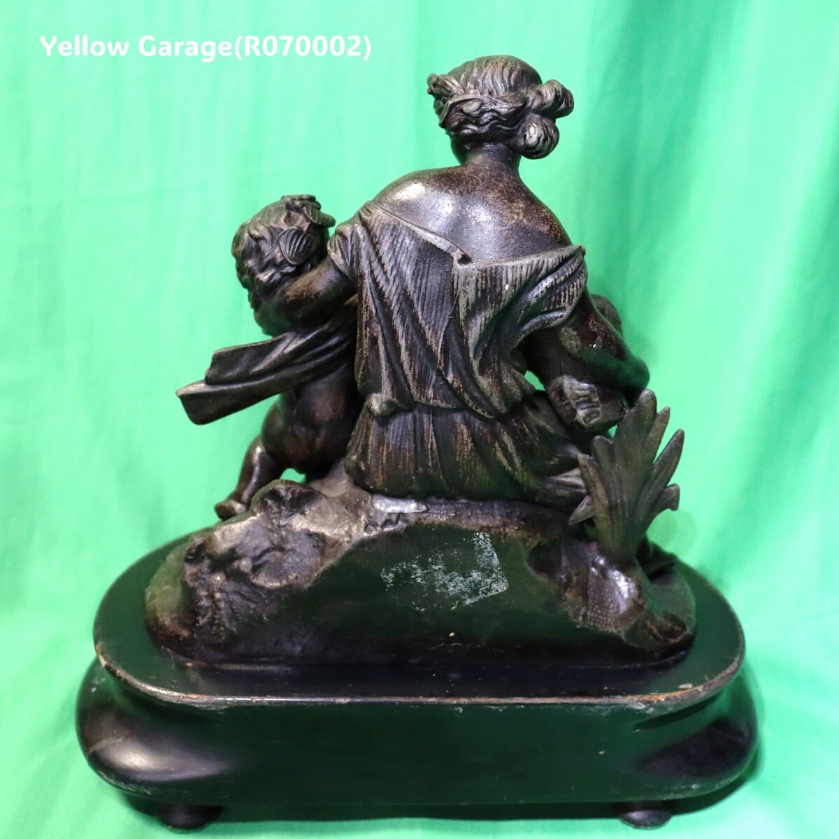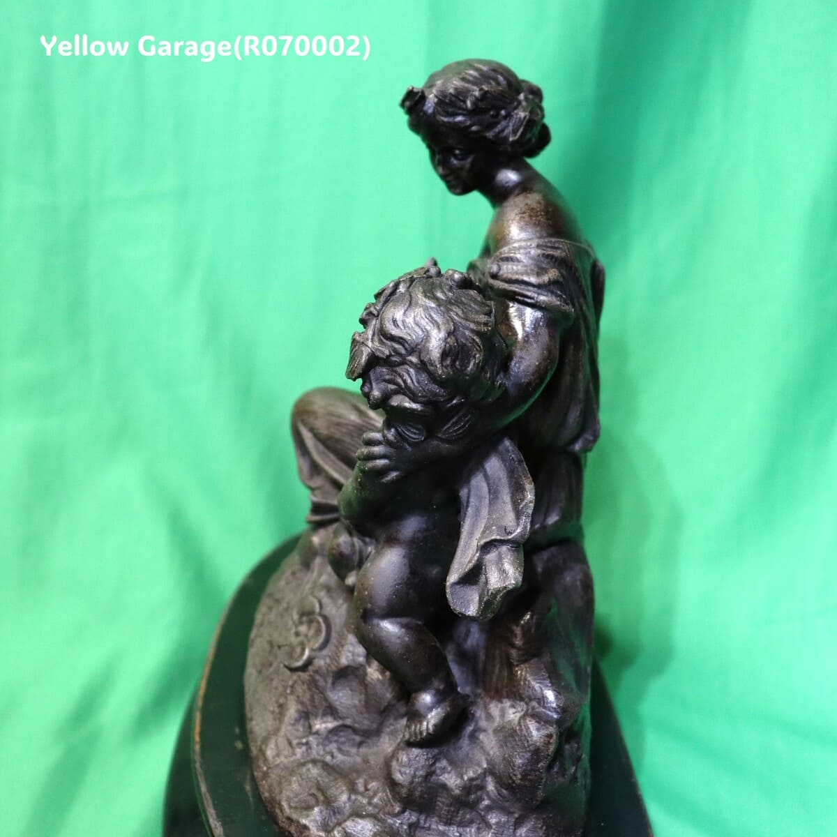優美な女性像と天使(キューピッド)のような子どもが寄り添うアンチモニー製の置物です。ブロンズのような重厚な風合いを持ちながら、アンチモニーならではの独特の光沢感が魅力。細部まで丁寧に彫刻され、衣服のしなやかな質感や表情の柔らかさが美しく表現されています。高さ29cm、横幅28cm、奥行16cm(台座含む)の存在感あるサイズで、リビングや書斎、クラシックなインテリアに映える逸品です。コレクションや贈り物にもおすすめです。(R070002)