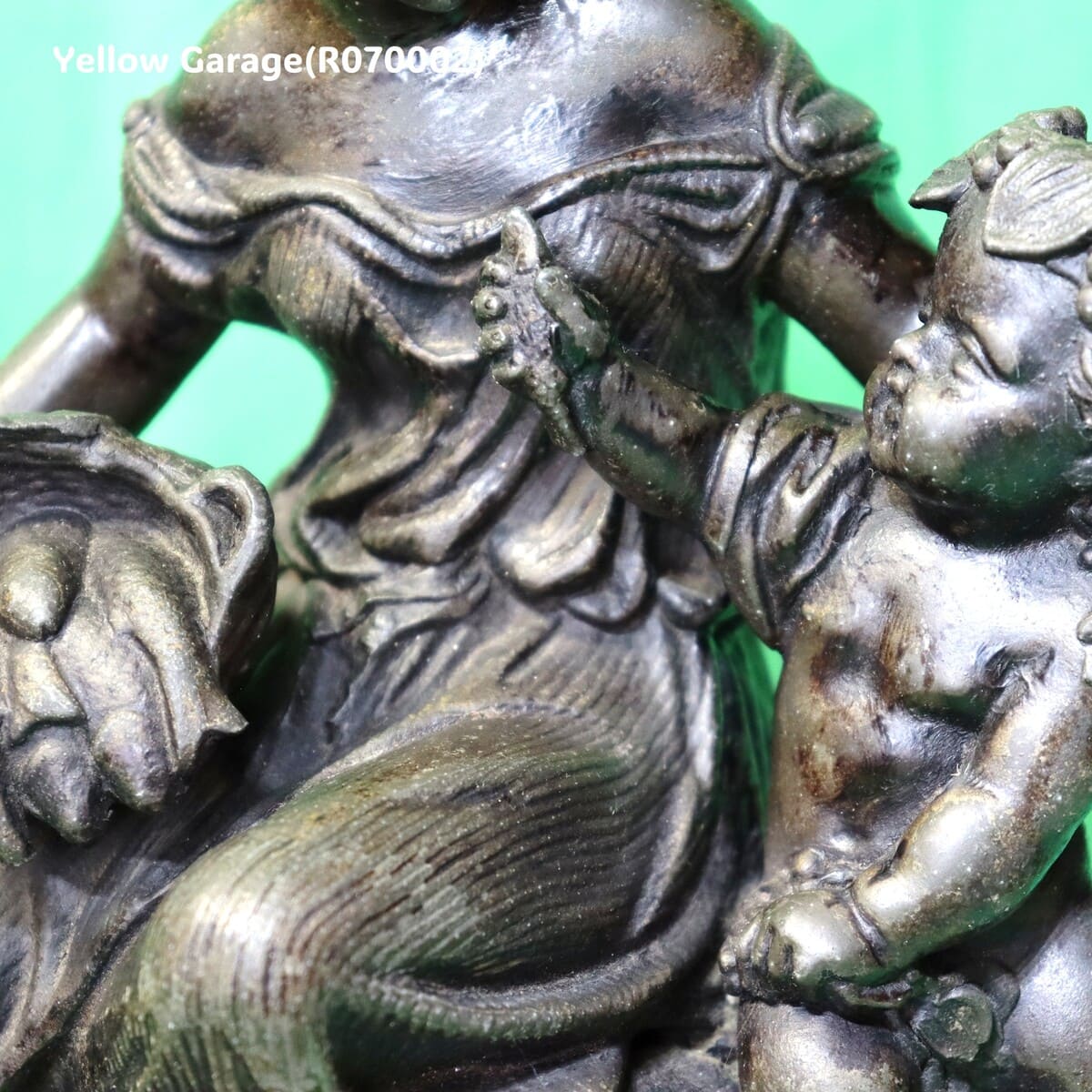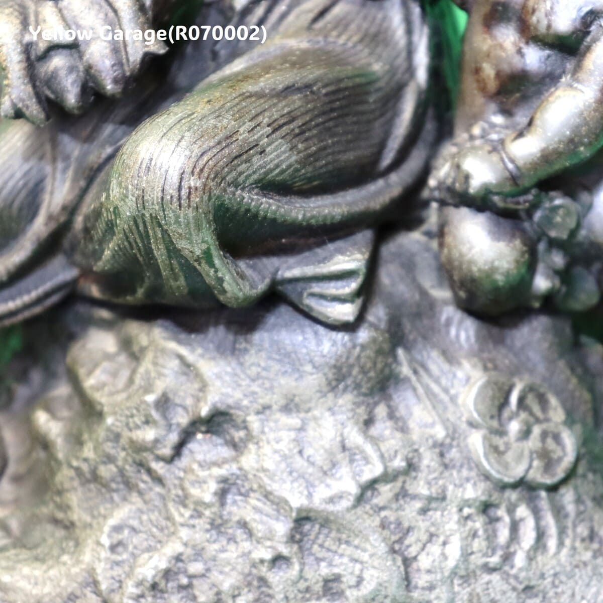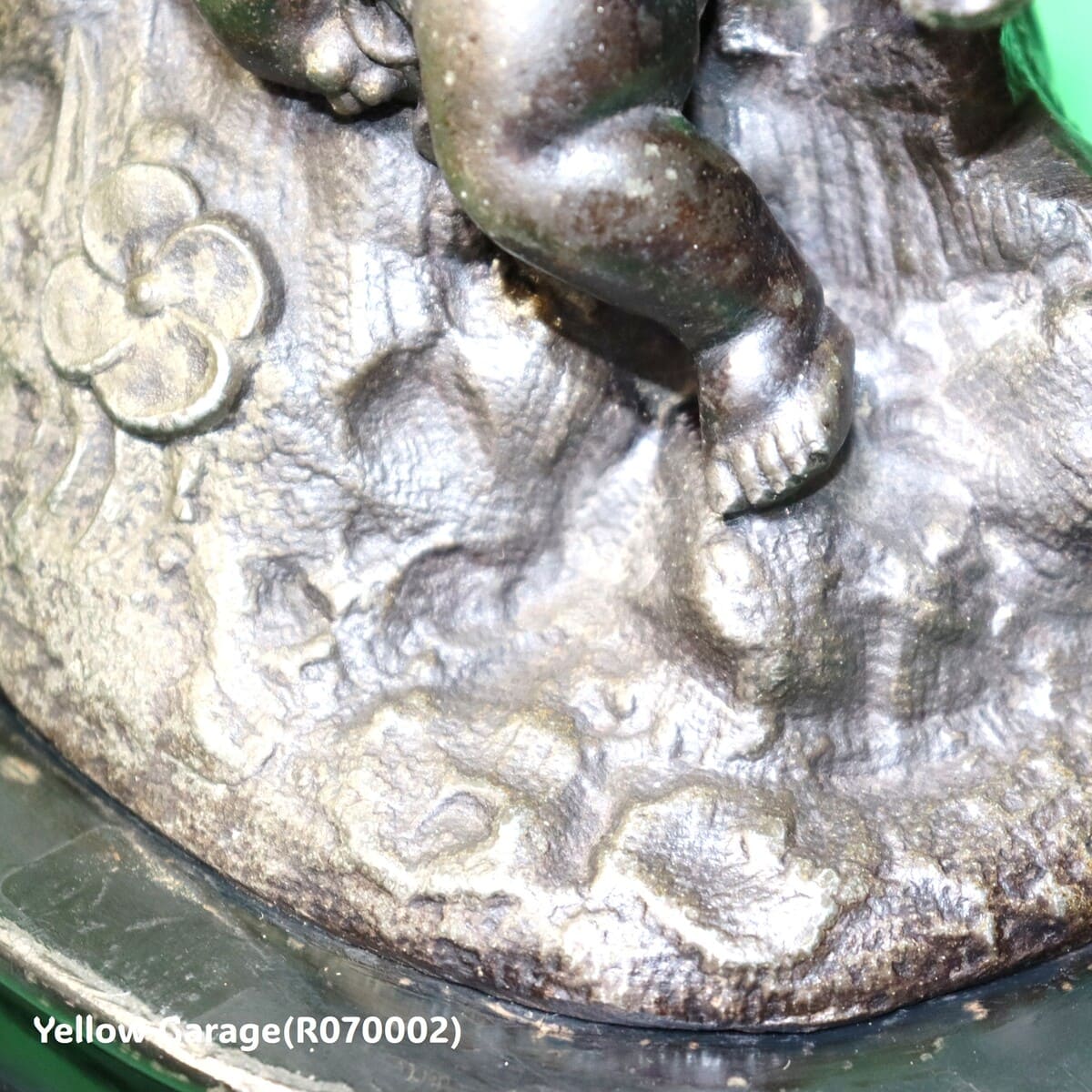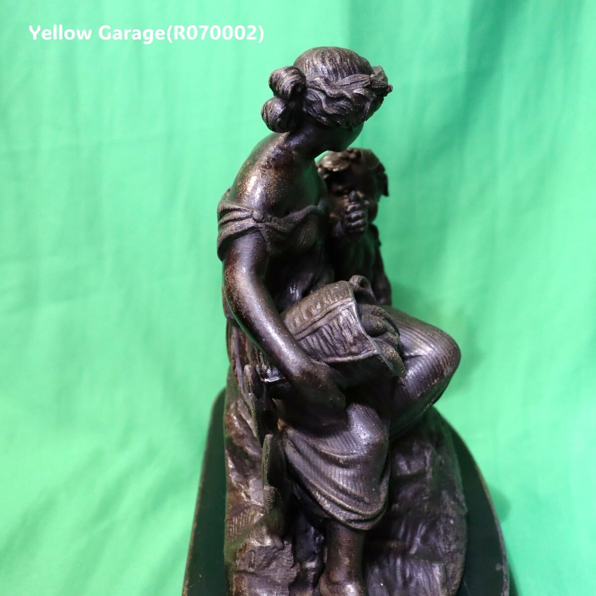 優美な女性像と天使(キューピッド)のような子どもが寄り添うアンチモニー製の置物です。ブロンズのような重厚な風合いを持ちながら、アンチモニーならではの独特の光沢感が魅力。細部まで丁寧に彫刻され、衣服のしなやかな質感や表情の柔らかさが美しく表現されています。高さ29cm、横幅28cm、奥行16cm(台座含む)の存在感あるサイズで、リビングや書斎、クラシックなインテリアに映える逸品です。コレクションや贈り物にもおすすめです。(R070002)