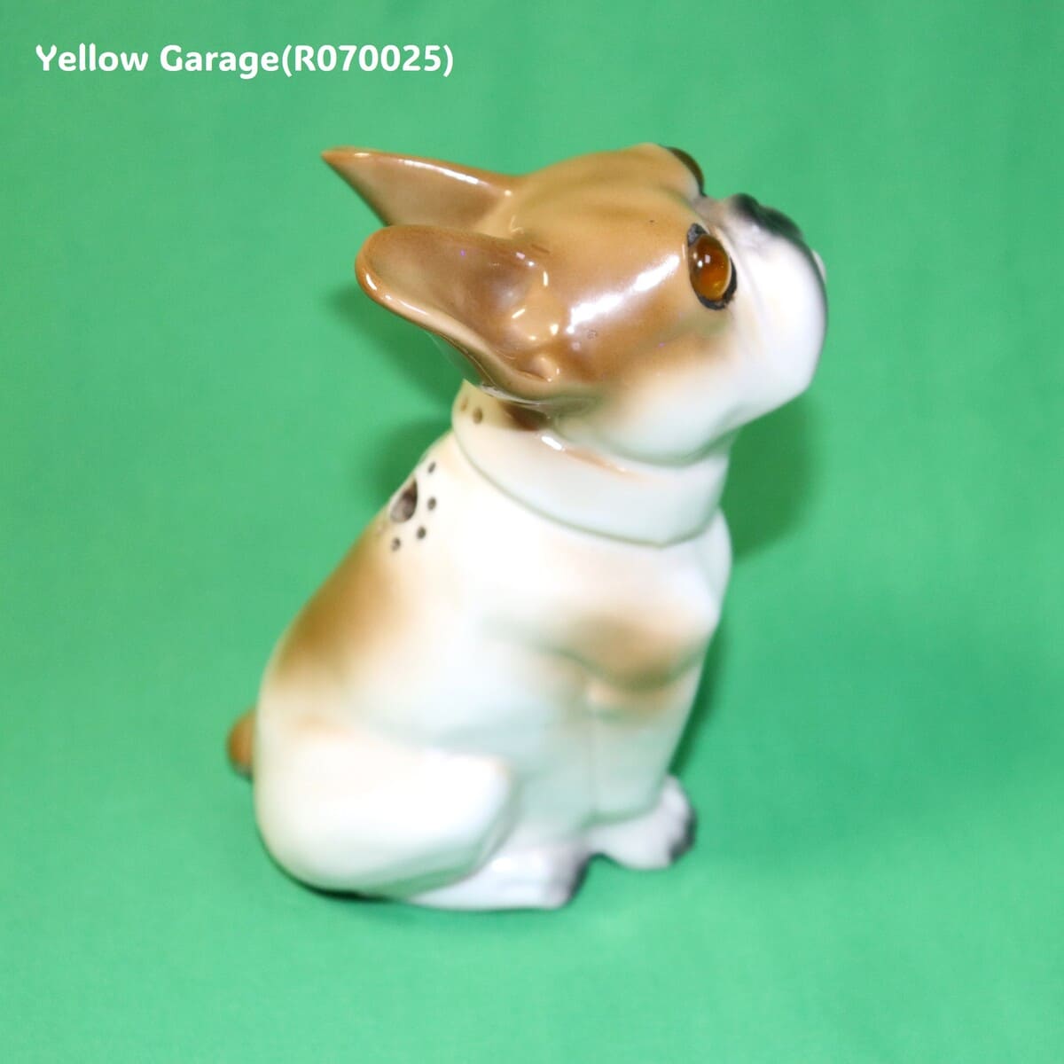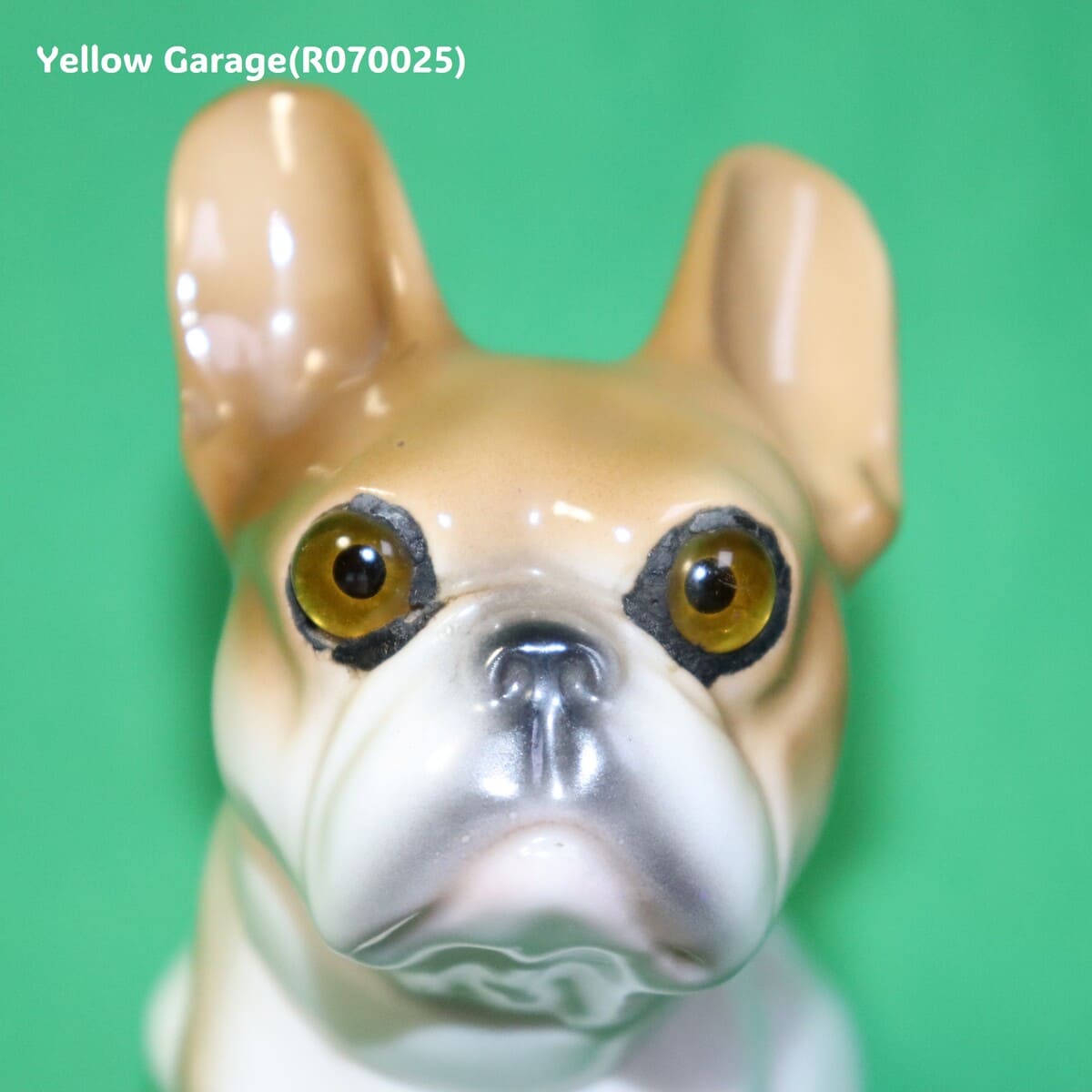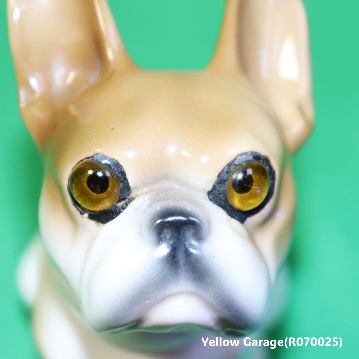 高さ約13cmの精巧に作られた陶器製フレンチブルドッグのオブジェです。愛らしい大きなガラス製の瞳は、内側から光を灯すことで幻想的に輝き、まるで本当に命を宿したかのような存在感を放ちます。背中の首元に小さな通気孔があり、煙や蒸気を出す演出が可能。また、背面下部には電源コードを差し込めるような切込みが施されており、ライトアップオブジェや簡易的な燻し機能を兼ね備えた仕様と考えられます。(R070025)
