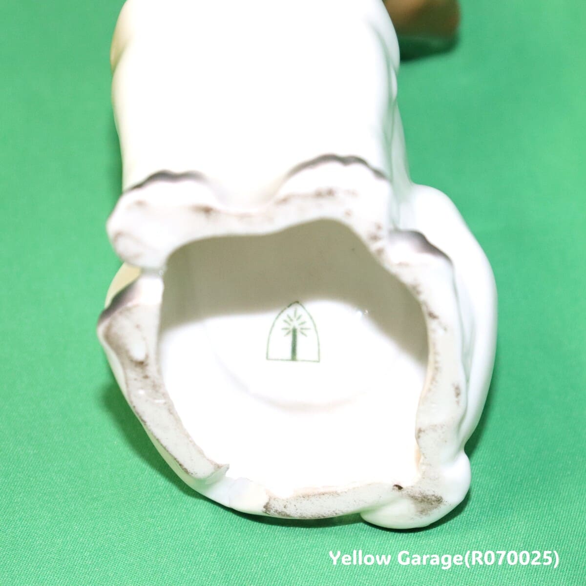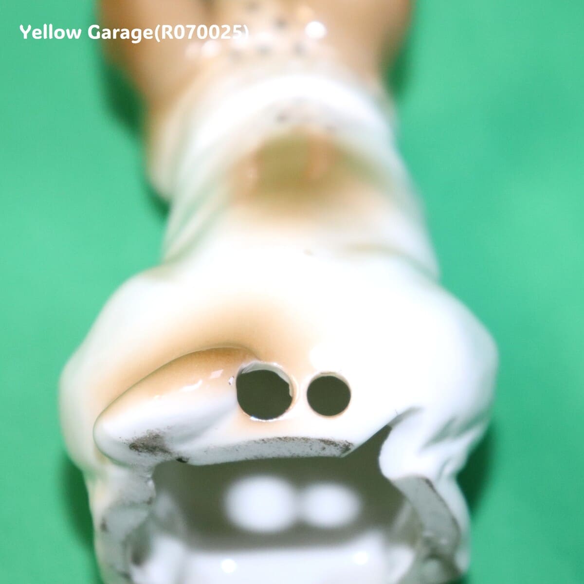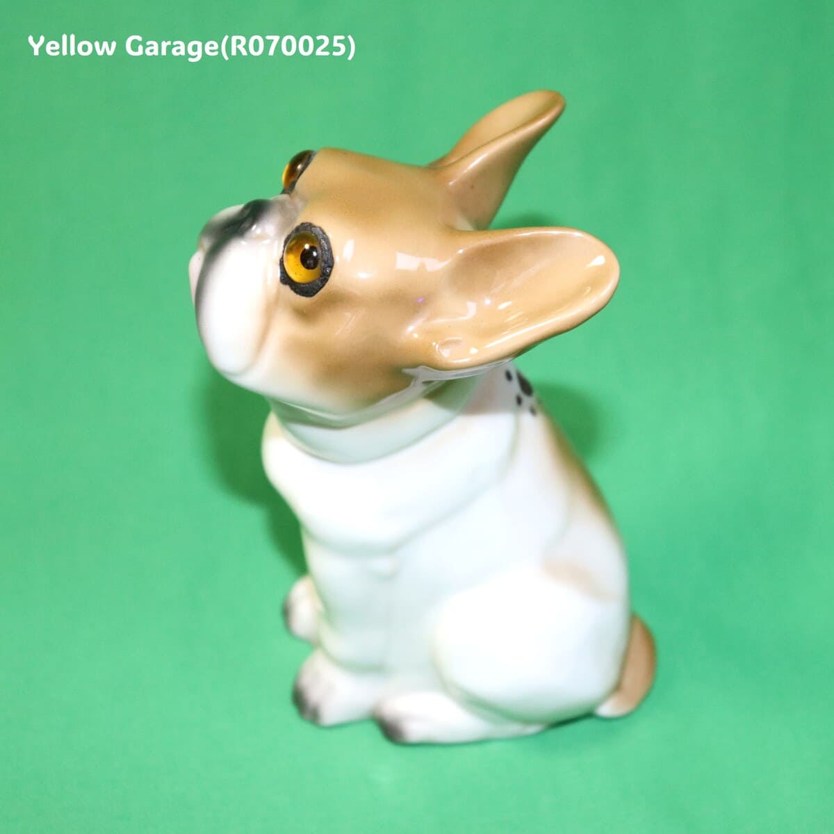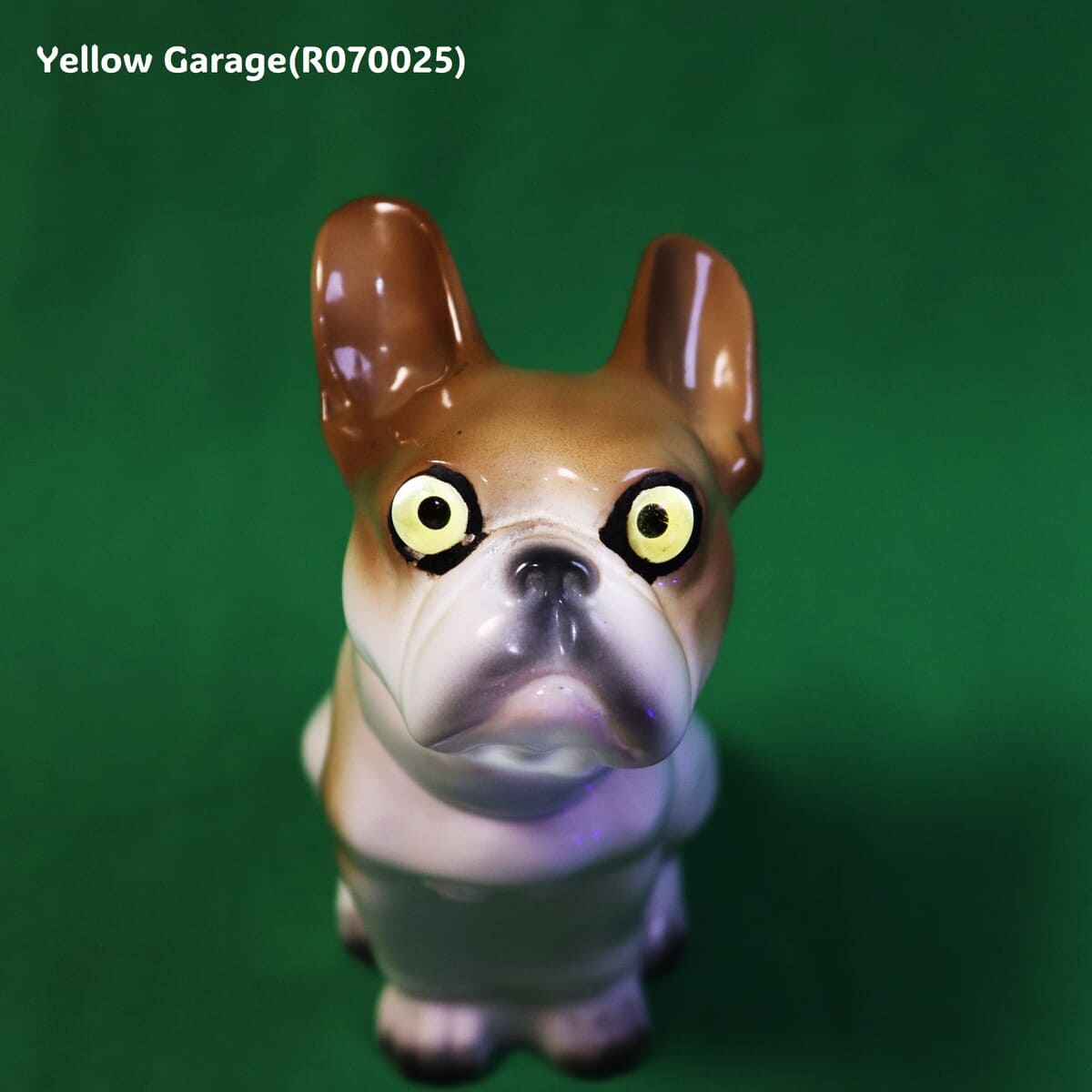 高さ約13cmの精巧に作られた陶器製フレンチブルドッグのオブジェです。愛らしい大きなガラス製の瞳は、内側から光を灯すことで幻想的に輝き、まるで本当に命を宿したかのような存在感を放ちます。背中の首元に小さな通気孔があり、煙や蒸気を出す演出が可能。また、背面下部には電源コードを差し込めるような切込みが施されており、ライトアップオブジェや簡易的な燻し機能を兼ね備えた仕様と考えられます。(R070025)