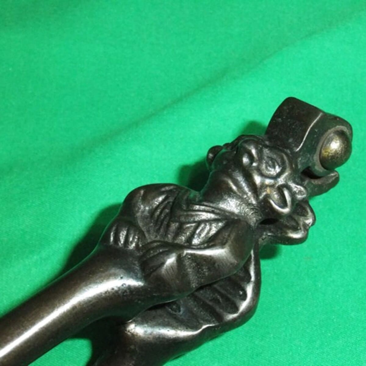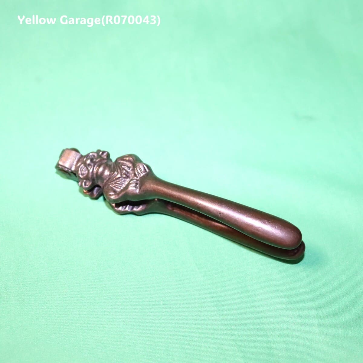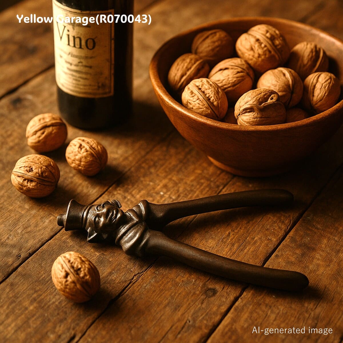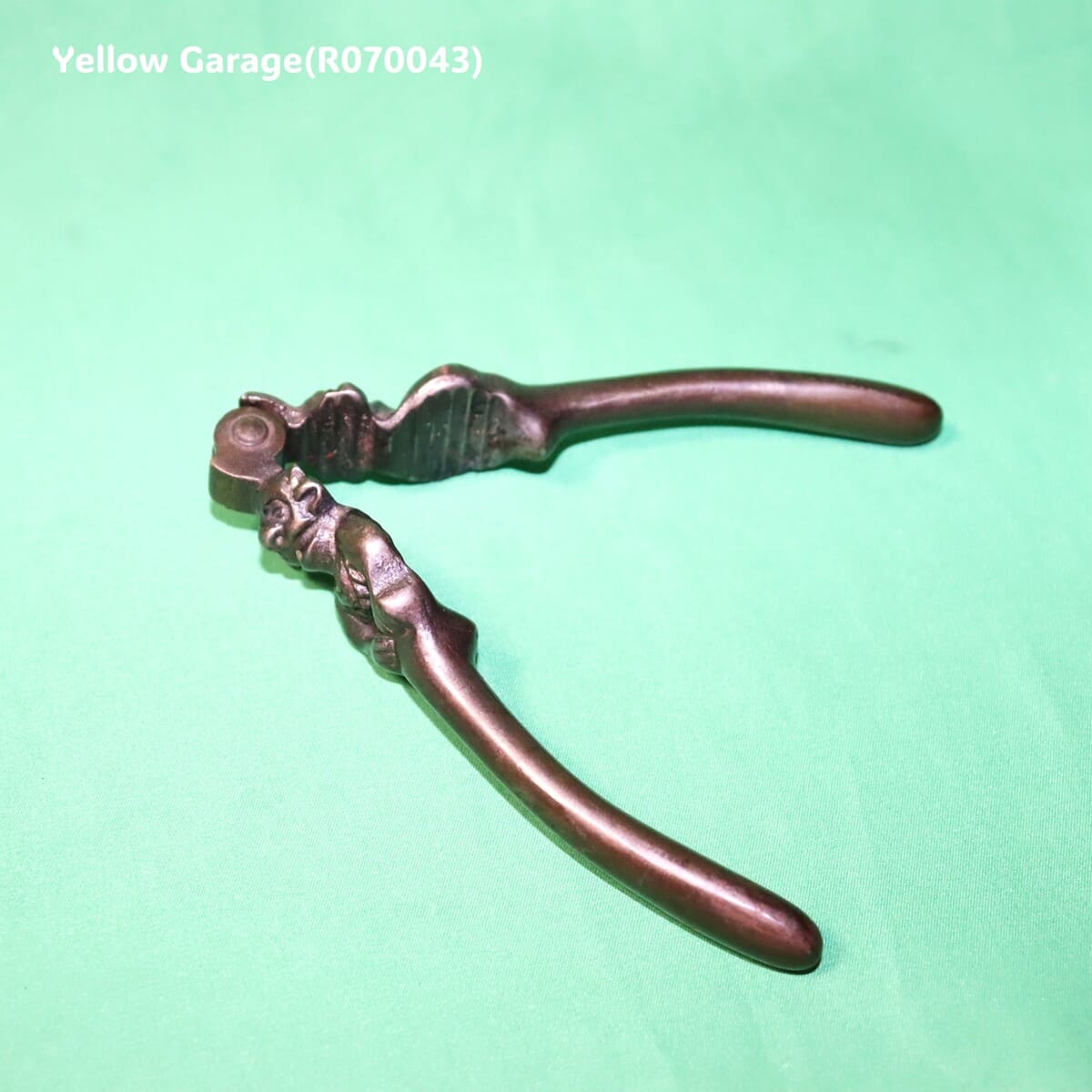 19世紀末〜20世紀初頭にかけて製造されたと考えられる、人物装飾付きの鉄製ナッツクラッカーです。ハンドル部分に彫刻された人物像は、王様のような冠を模した意匠とも、道化師のユーモラスな表情とも取れる造形が施されています。こうしたデザインは、当時の食卓に遊び心を添えるために好まれました。硬いクルミを割るための実用的な道具でありながら、美術工芸品としての価値も高く、コレクションアイテムやインテリアとしてもおすすめです。(R070043)