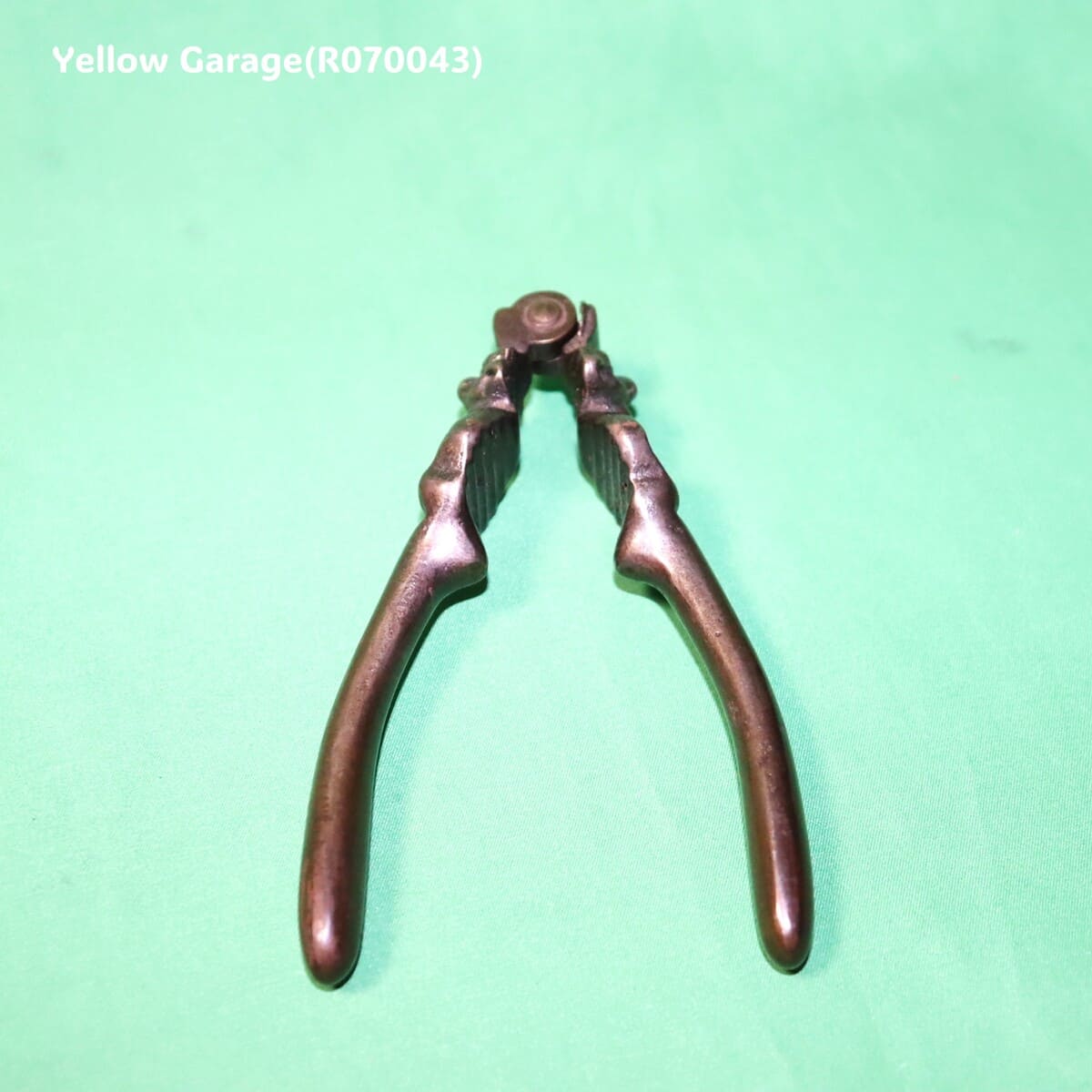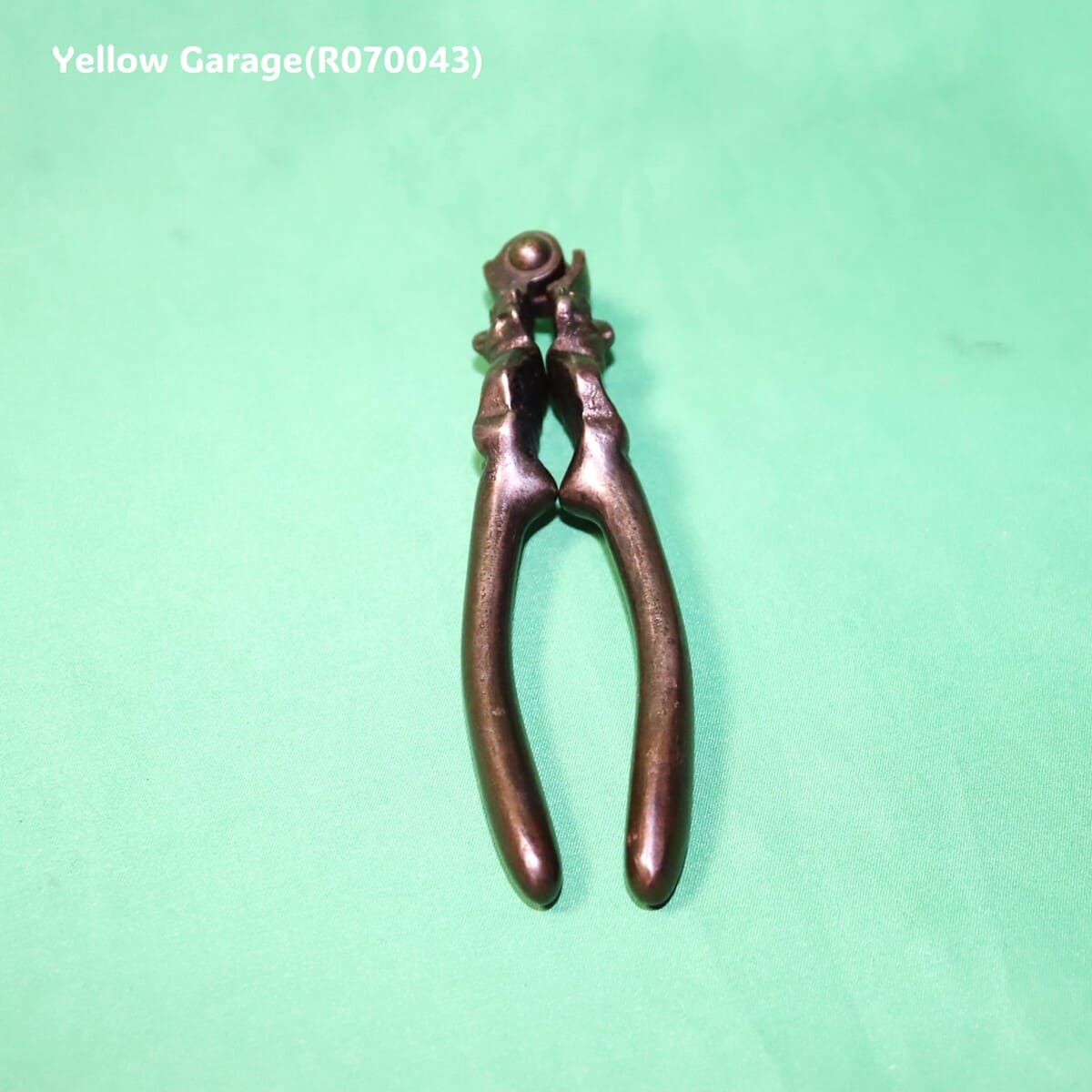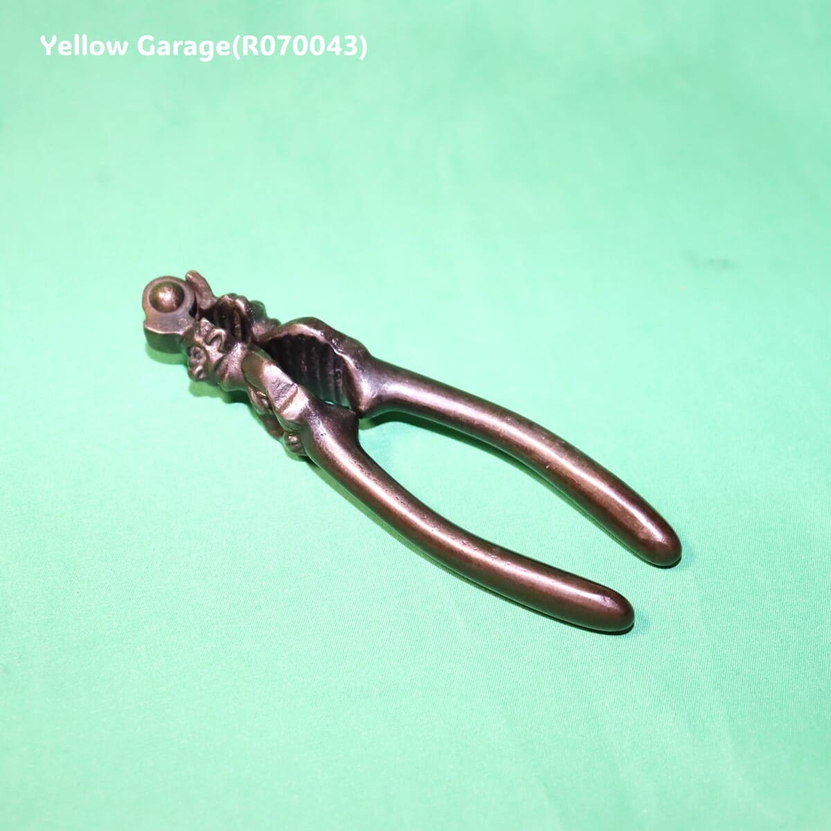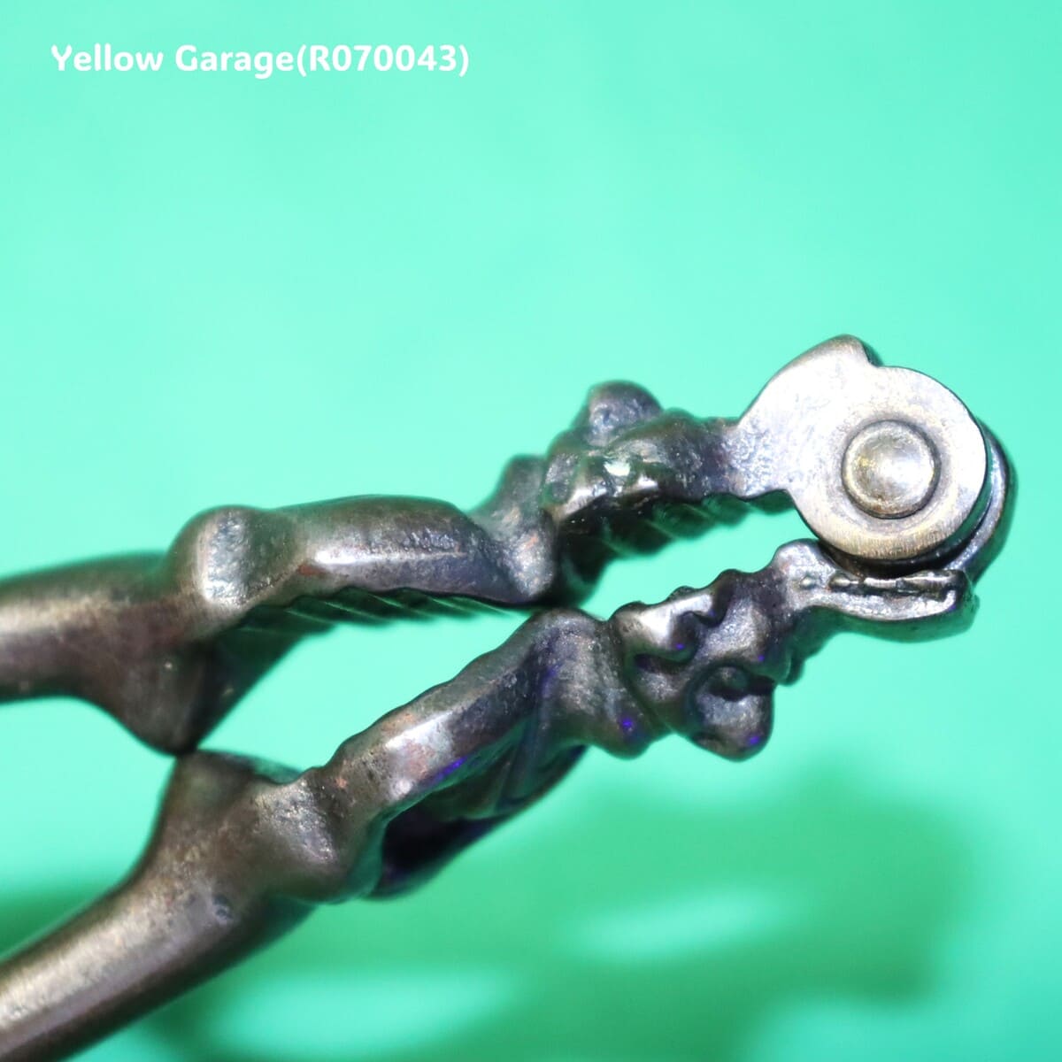19世紀末〜20世紀初頭にかけて製造されたと考えられる、人物装飾付きの鉄製ナッツクラッカーです。ハンドル部分に彫刻された人物像は、王様のような冠を模した意匠とも、道化師のユーモラスな表情とも取れる造形が施されています。こうしたデザインは、当時の食卓に遊び心を添えるために好まれました。硬いクルミを割るための実用的な道具でありながら、美術工芸品としての価値も高く、コレクションアイテムやインテリアとしてもおすすめです。(R070043)