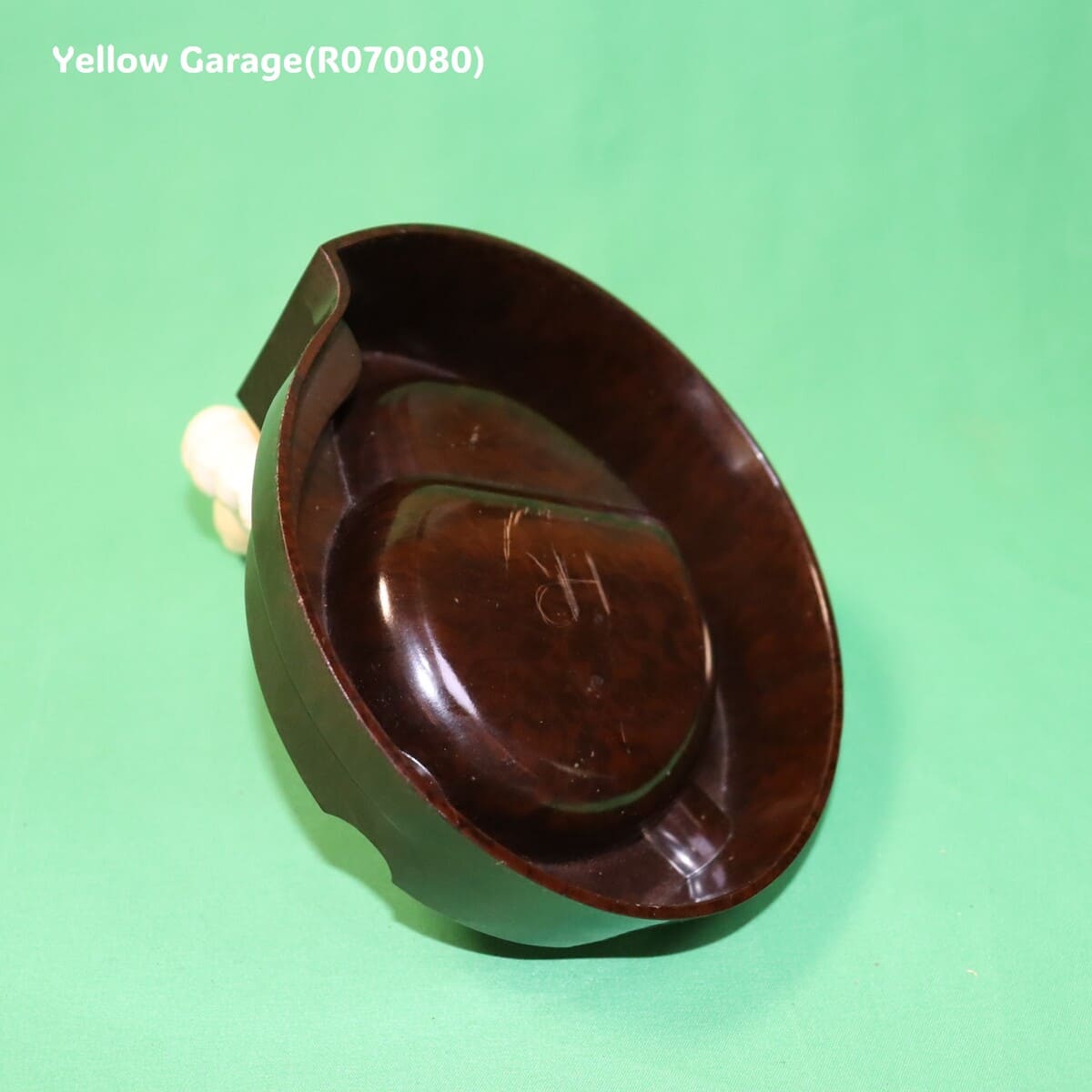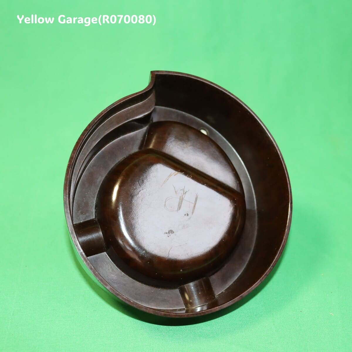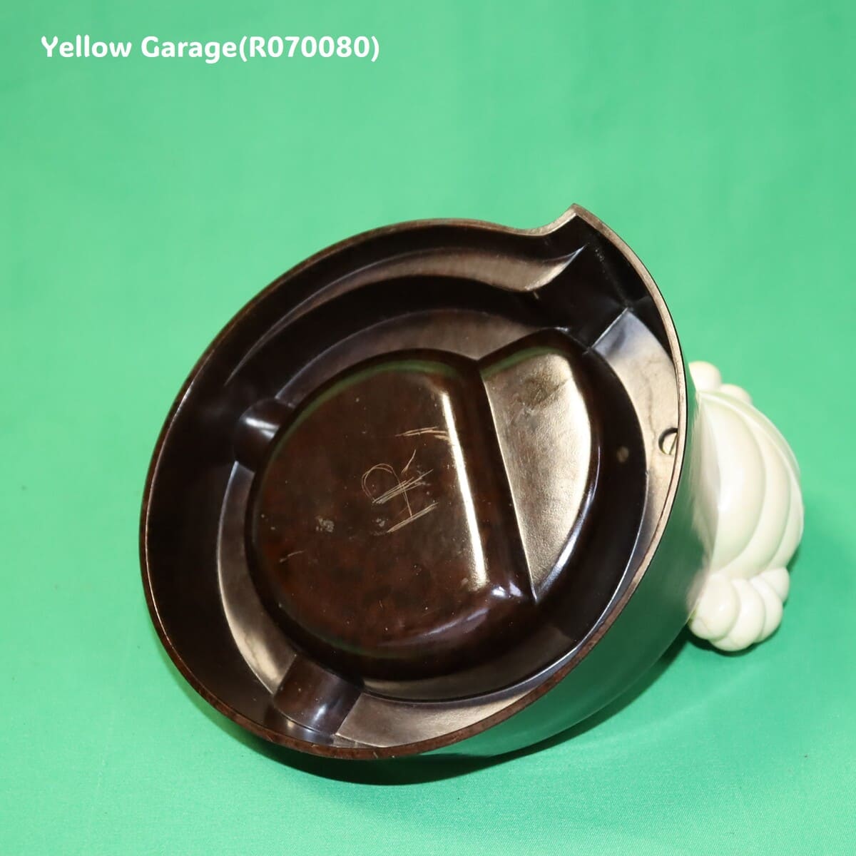 アメリカ製の一部モデルには元から刻印がないものも存在します(特に1940年代〜50年代の中期モデル)。一方で、近年のレプリカや模倣品も刻印が無いことが多いため、慎重な判断が必要です。灰皿本体の材質は英国製と非常に近い質感のベークライト風のフェノール樹脂で、模様も自然です。マーブル調の茶色地模様は経年変化による深みもあり、安価な樹脂レプリカにありがちな不自然な艶や軽さは感じられません。ミシュランマンのパーツも成型がシャープで、表面の肌理(きめ)や仕上げがしっかりしています。英国製同様に、フィギュアはしっかりと金属ネジで固定されています。ネジの形状や位置も正確で、現代の接着剤を用いた簡易レプリカとは異なります。ディテールは若干異なるものの、鋳型自体はミシュラン公認のものである可能性が高く、模倣品には見えません。この灰皿は、アメリカで1950年代ごろに製造された正規のプロモーション用ヴィンテージ品と見て良いでしょう。レプリカ品にありがちな粗さはなく、ミシュランのブランドイメージを尊重した造形・質感が保たれています。英国製と比べても遜色なく、十分にコレクション価値がある一品です。底面にある“HR”のスクラッチは、製造元の刻印ではなく、後から加えられた個人・業務用途のマーキングと考えられます。明確な意味は断定できませんが、おそらく「所有者のイニシャル」である可能性が最も高いです。製品のオリジナリティや希少性にはほぼ影響はなく、むしろ一点物感を演出するエピソードの一部として捉えることもできます。