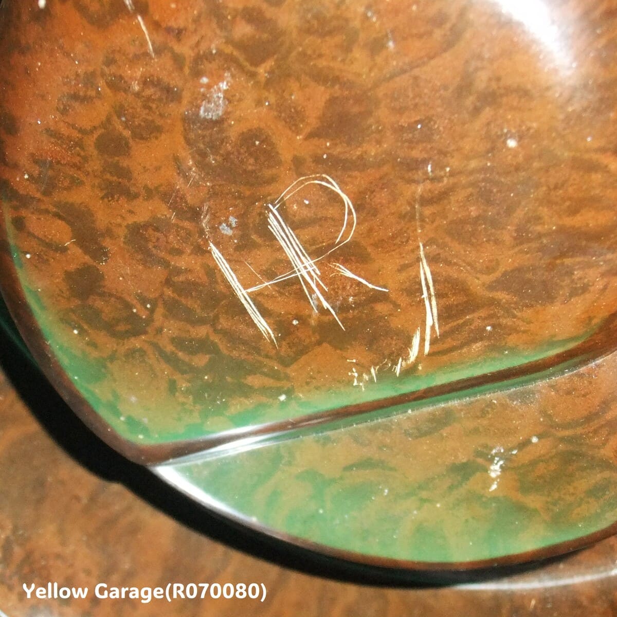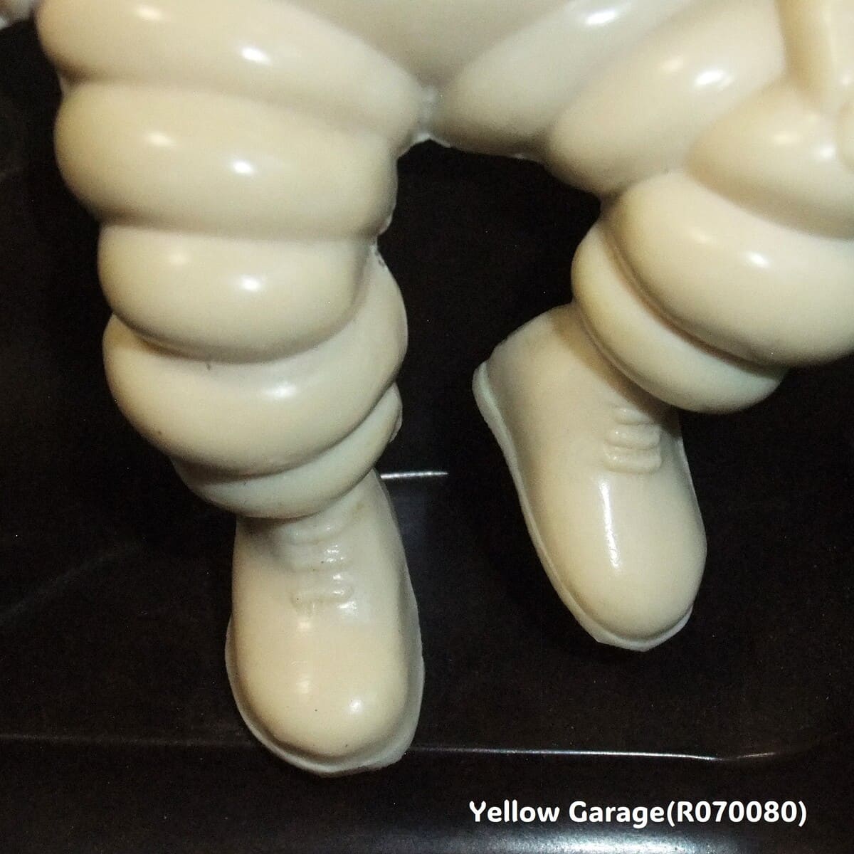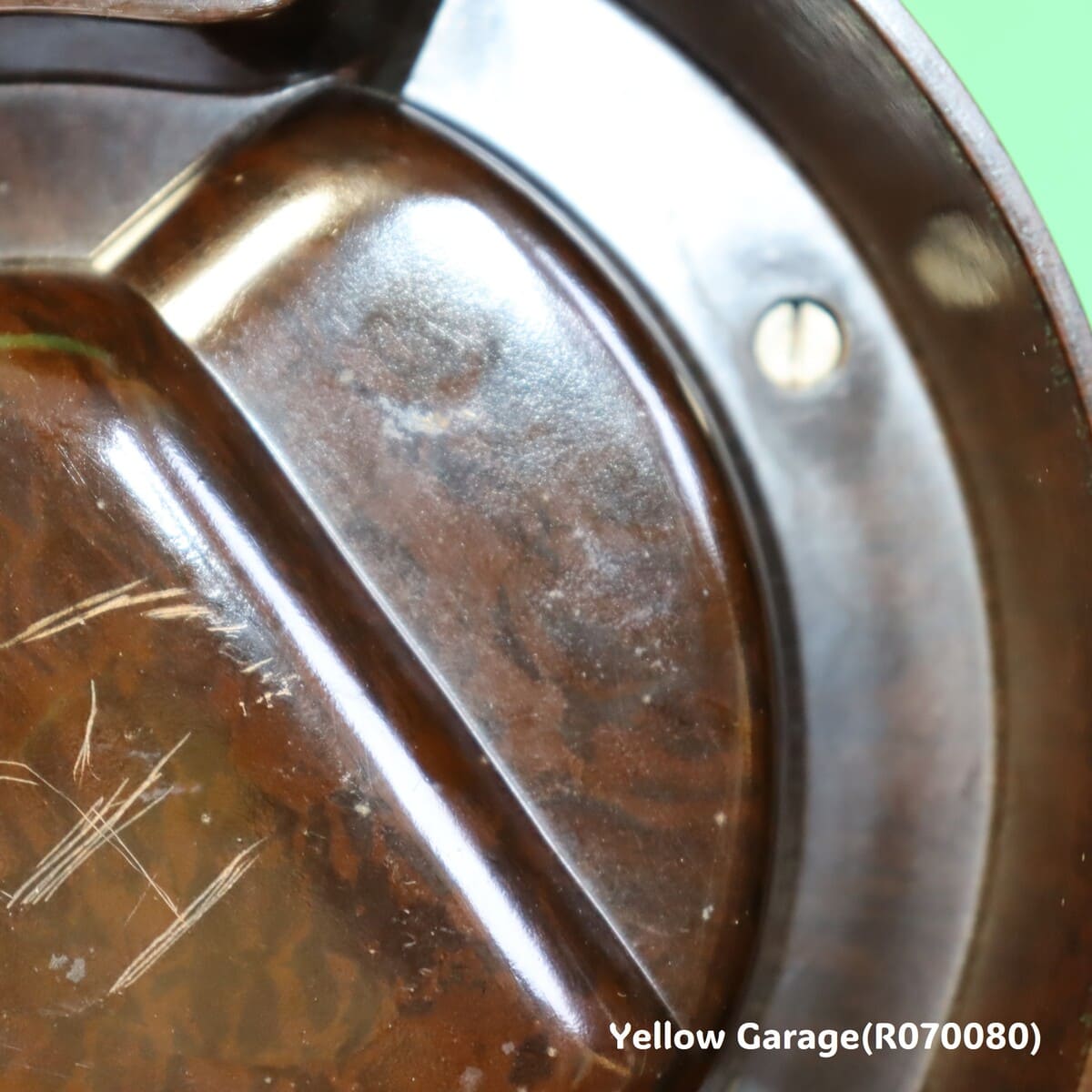 アメリカ製の一部モデルには元から刻印がないものも存在します(特に1940年代〜50年代の中期モデル)。一方で、近年のレプリカや模倣品も刻印が無いことが多いため、慎重な判断が必要です。灰皿本体の材質は英国製と非常に近い質感のベークライト風のフェノール樹脂で、模様も自然です。マーブル調の茶色地模様は経年変化による深みもあり、安価な樹脂レプリカにありがちな不自然な艶や軽さは感じられません。ミシュランマンのパーツも成型がシャープで、表面の肌理(きめ)や仕上げがしっかりしています。英国製同様に、フィギュアはしっかりと金属ネジで固定されています。ネジの形状や位置も正確で、現代の接着剤を用いた簡易レプリカとは異なります。ディテールは若干異なるものの、鋳型自体はミシュラン公認のものである可能性が高く、模倣品には見えません。この灰皿は、アメリカで1950年代ごろに製造された正規のプロモーション用ヴィンテージ品と見て良いでしょう。レプリカ品にありがちな粗さはなく、ミシュランのブランドイメージを尊重した造形・質感が保たれています。英国製と比べても遜色なく、十分にコレクション価値がある一品です。底面にある“HR”のスクラッチは、製造元の刻印ではなく、後から加えられた個人・業務用途のマーキングと考えられます。明確な意味は断定できませんが、おそらく「所有者のイニシャル」である可能性が最も高いです。製品のオリジナリティや希少性にはほぼ影響はなく、むしろ一点物感を演出するエピソードの一部として捉えることもできます。