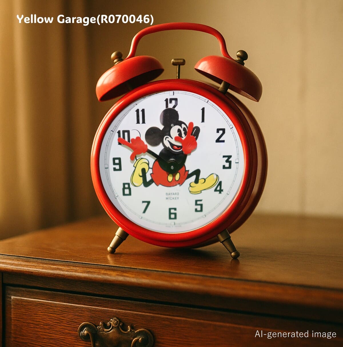 1977年、Walt Disney Productions 正規ライセンスにより、フランスの名門時計メーカー「Bayard(バヤール)」社によって製造された、愛らしいミッキーマウスのアラームクロックです。ミッキーの腕が時分針になっており、元気に走るポーズで時間を知らせてくれるユニークなデザイン。赤・白・黒のカラーリングが鮮やかで、ポップながらどこか懐かしさを感じさせるビンテージアイテムです。本体裏面にはメカニカルな金属製の巻き鍵付き。手巻き式で、チクタクとした音がレトロ感を引き立てます。動作確認済みで、実際に時を刻みます。(R070046)