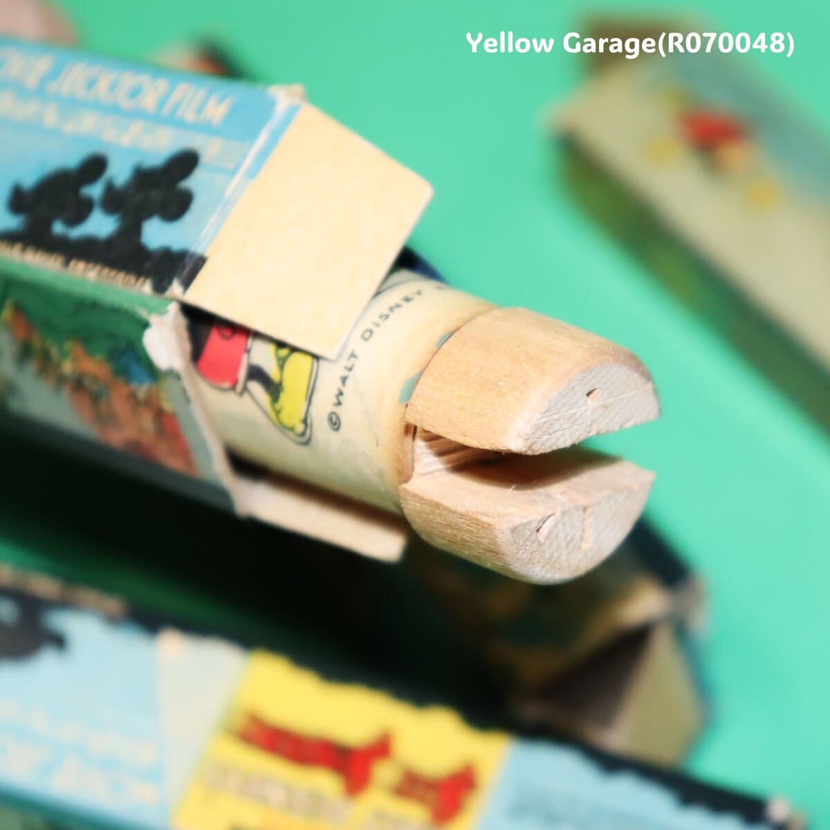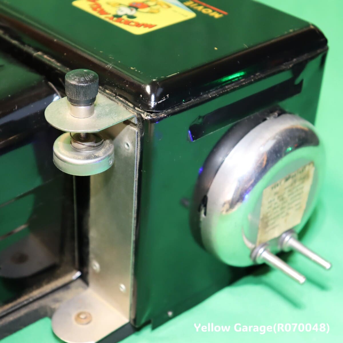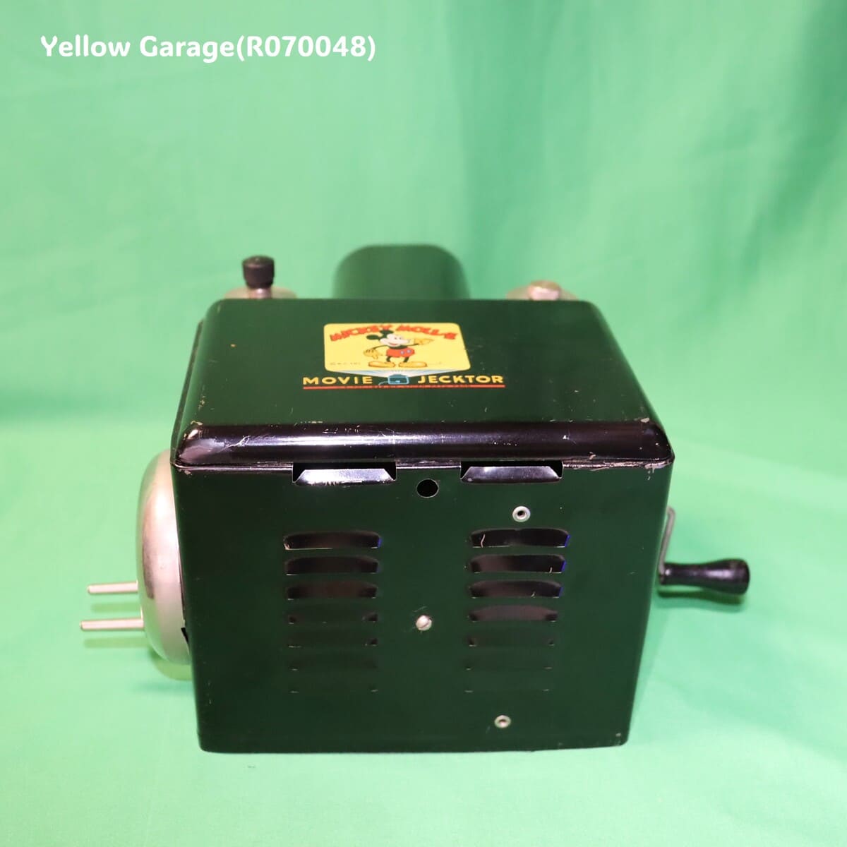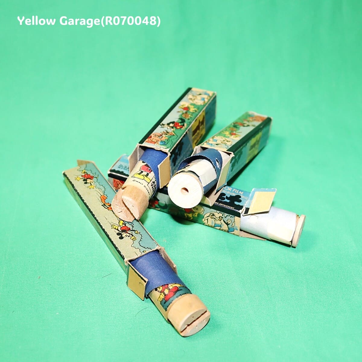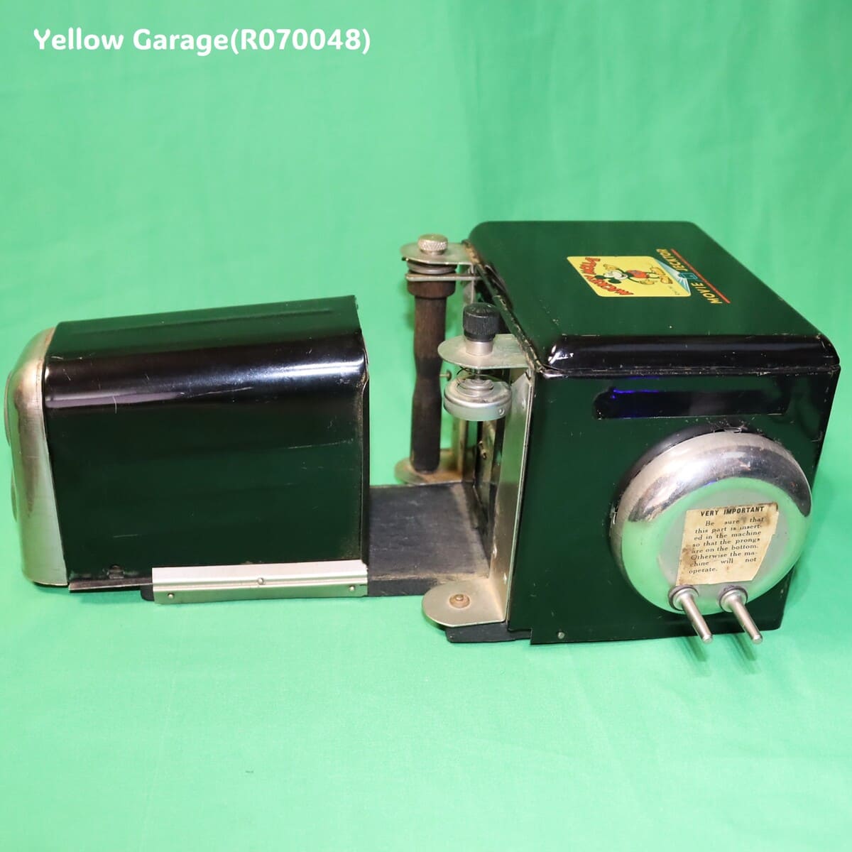 1930年代〜40年代にアメリカ・ニューヨークの「Movie-Jector Co. Inc.」より発売された、ディズニー公式ライセンス品「Mickey Mouse Movie-Jector」です。黒いメタルボディに「Mickey Mouse」のラベルがついた愛らしいデザインで、当時の子どもたちが夢中になった家庭用映写機。手動ハンドルと電源ヒーターによって、専用のカラーフィルム(紙製)を投影します。セット内容には、当時のオリジナルカートンフィルムが4本付属。「Birds in the Spring」「The Doll Dance」「The Fireman」など、当時のディズニー作品を再現したミニストーリーが展開されます。本体には2つのレンズとシャッターが内蔵されており、フィルムには横方向に2コマのカラーフレームが繰り返し印刷されています。側面のハンドルを回すことで、ストリップが送られると同時に内部のシャッターが連動し、上下のレンズから順番に画像を投影。これにより、2コマの連続アニメーション(ミッキーの動作など)が繰り返しスクリーンに映し出されるという、当時としては非常にユニークな映写体験が楽しめる仕組みです。(R070048)