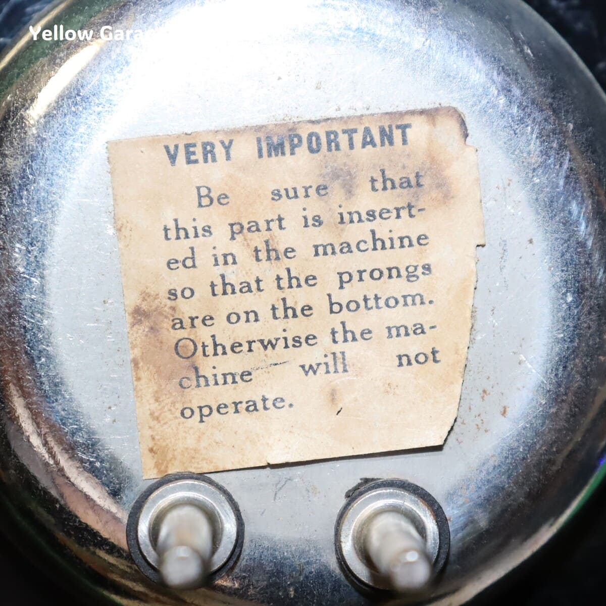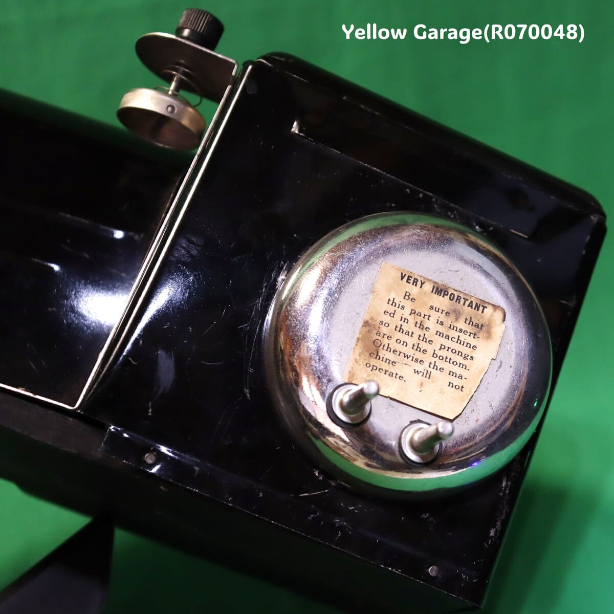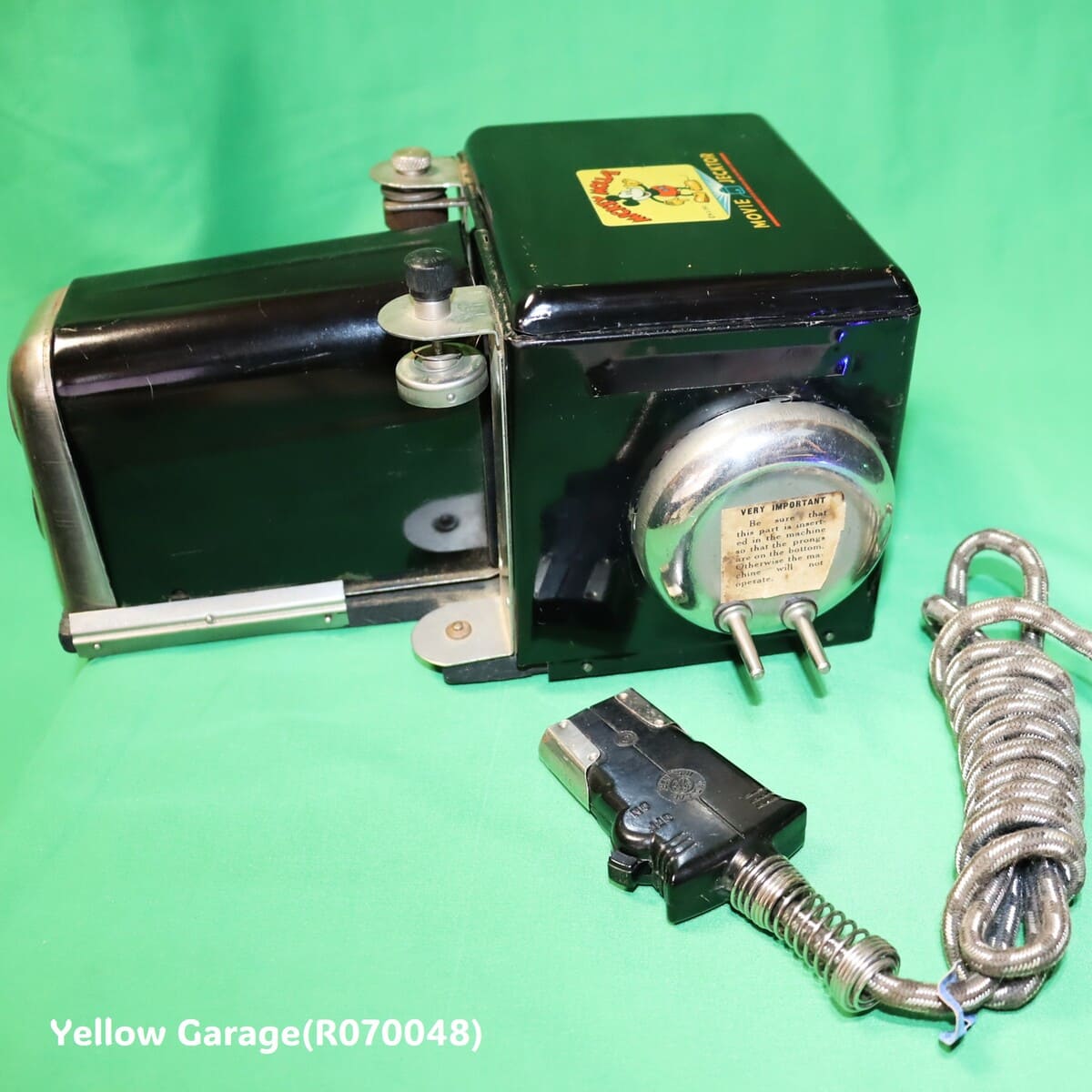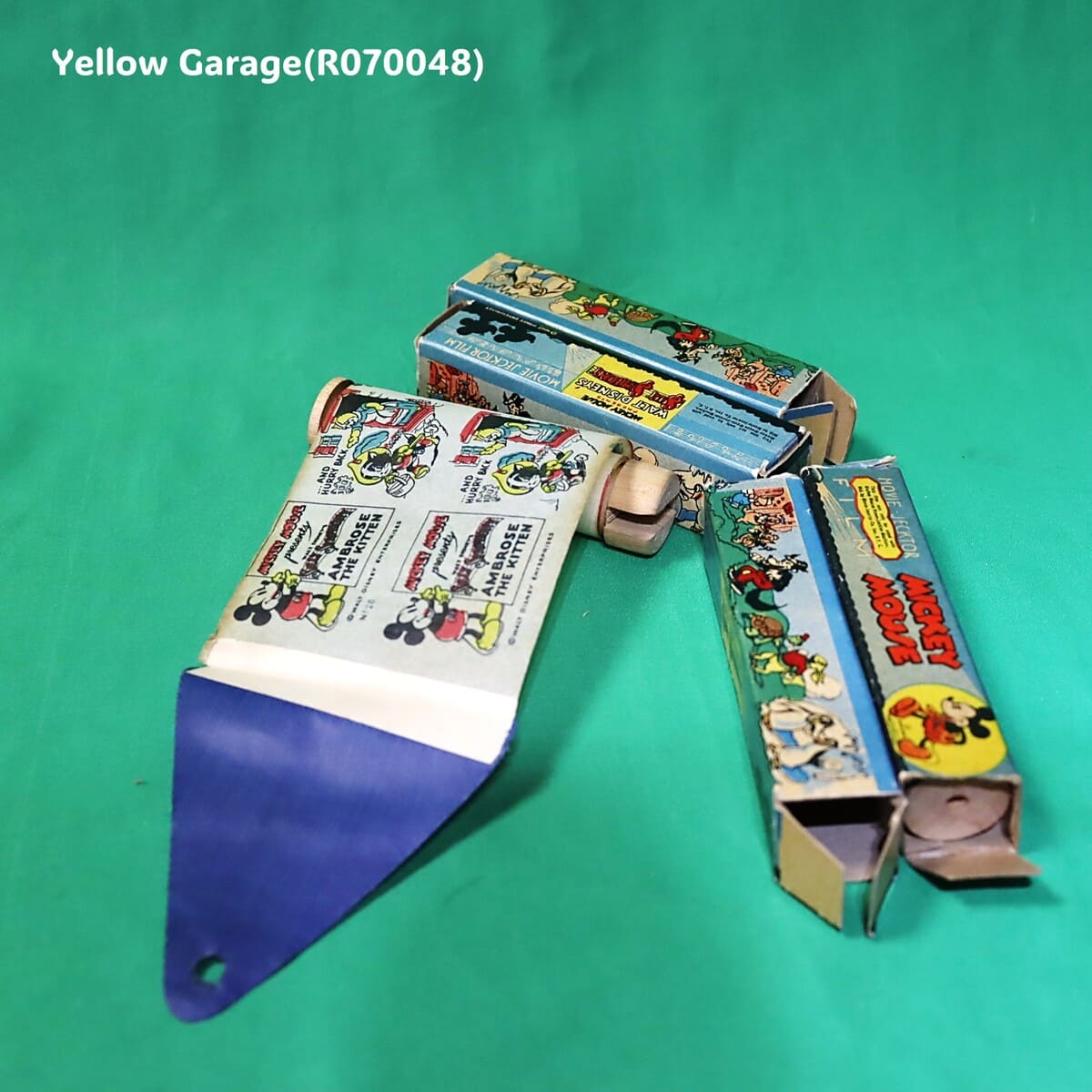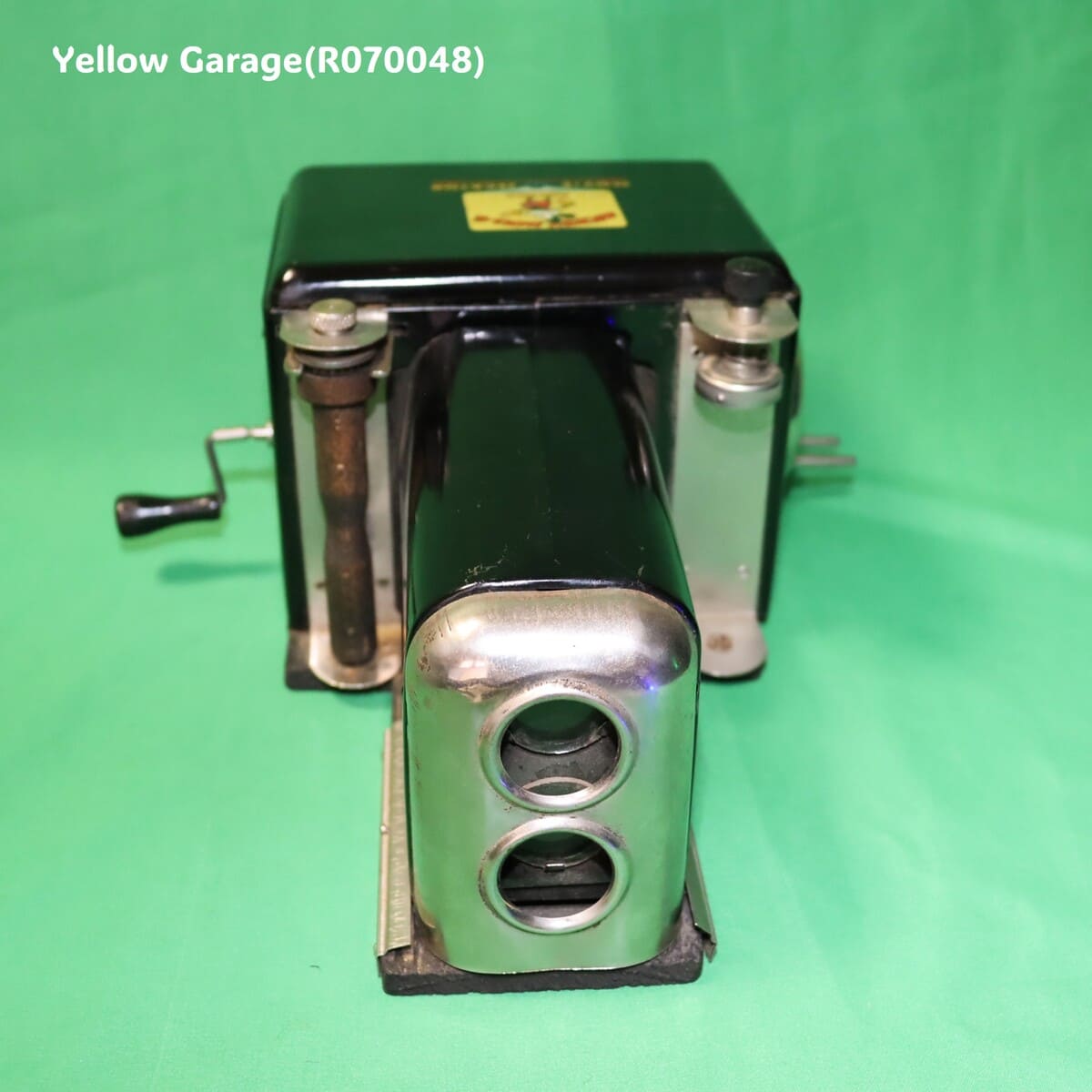 1930年代〜40年代にアメリカ・ニューヨークの「Movie-Jector Co. Inc.」より発売された、ディズニー公式ライセンス品「Mickey Mouse Movie-Jector」です。黒いメタルボディに「Mickey Mouse」のラベルがついた愛らしいデザインで、当時の子どもたちが夢中になった家庭用映写機。手動ハンドルと電源ヒーターによって、専用のカラーフィルム(紙製)を投影します。セット内容には、当時のオリジナルカートンフィルムが4本付属。「Birds in the Spring」「The Doll Dance」「The Fireman」など、当時のディズニー作品を再現したミニストーリーが展開されます。本体には2つのレンズとシャッターが内蔵されており、フィルムには横方向に2コマのカラーフレームが繰り返し印刷されています。側面のハンドルを回すことで、ストリップが送られると同時に内部のシャッターが連動し、上下のレンズから順番に画像を投影。これにより、2コマの連続アニメーション(ミッキーの動作など)が繰り返しスクリーンに映し出されるという、当時としては非常にユニークな映写体験が楽しめる仕組みです。(R070048)