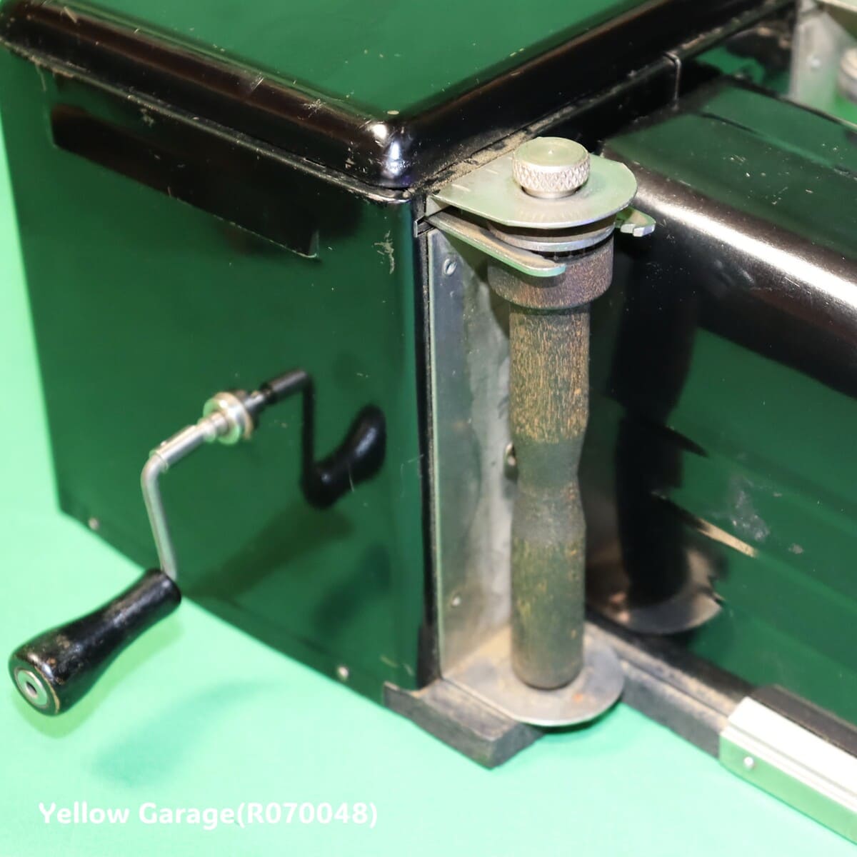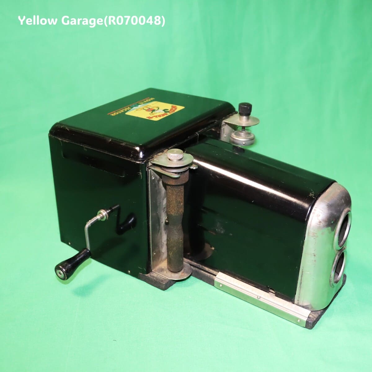 この「Mickey Mouse Movie-Jector」は、2つの投射レンズと内部シャッター機構、そして手回しハンドルによって、次のようなアニメーション投影を可能にしています。ロール紙には2列の画像(フレームA・フレームB)が並んでいます。側面のハンドルを回すと、木製スプールに巻かれたフィルムが横方向に送られ、同時に内部のシャッターが交互に作動し、上下のレンズを通して交互に画像を映写します。これにより、スクリーンには2フレームの繰り返しアニメーションが表示されます。「2コマ連続によるアニメーション効果」を生み出すための簡易的なフリップブック式映写機(2-frame animation projector)です。