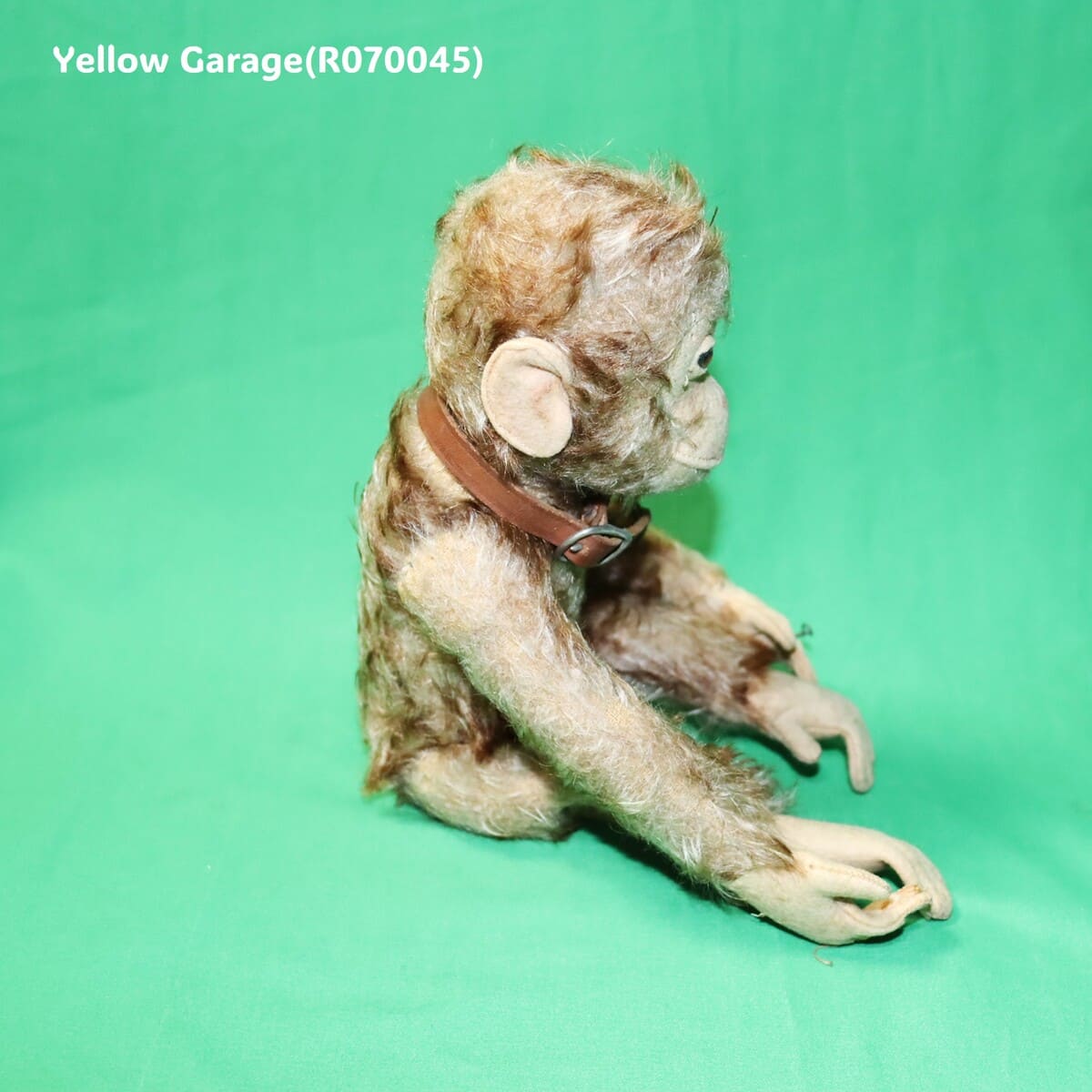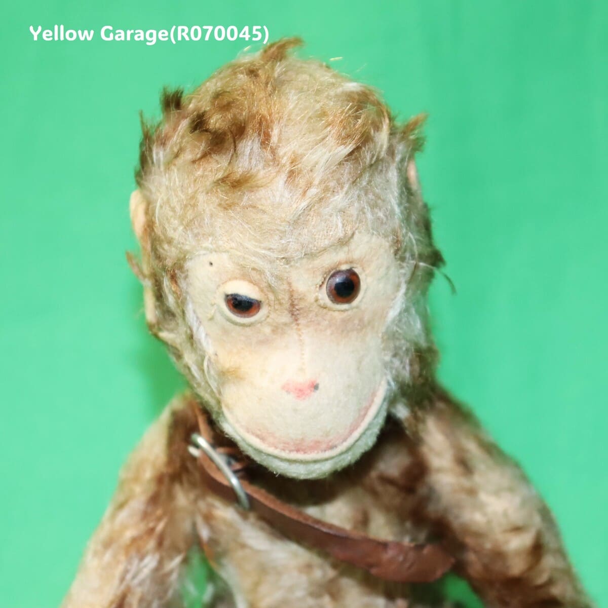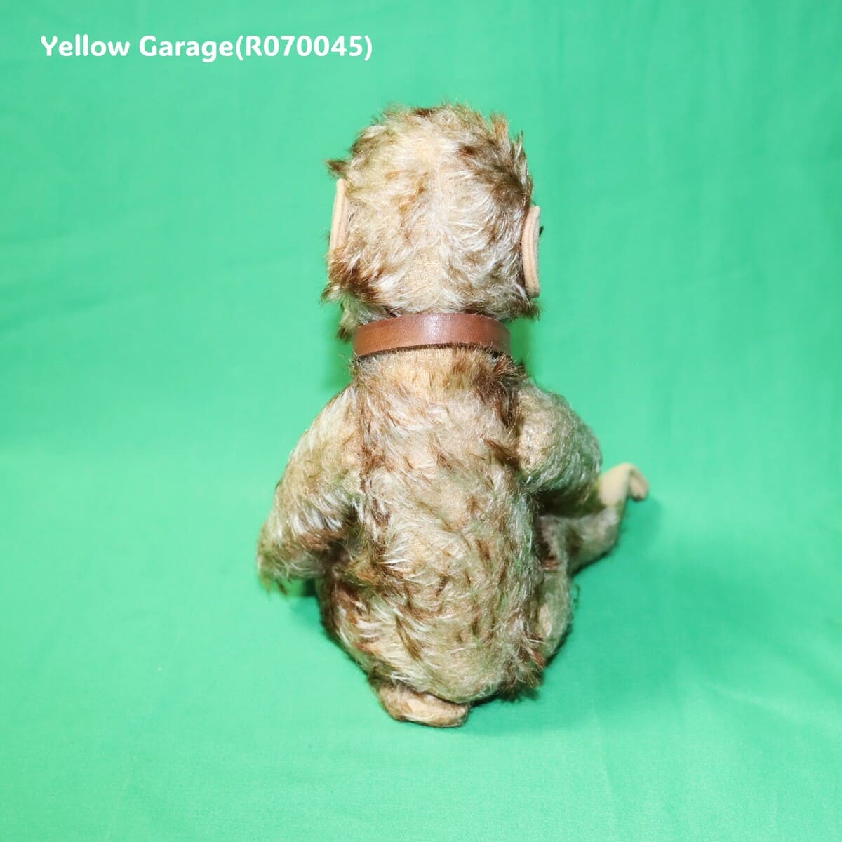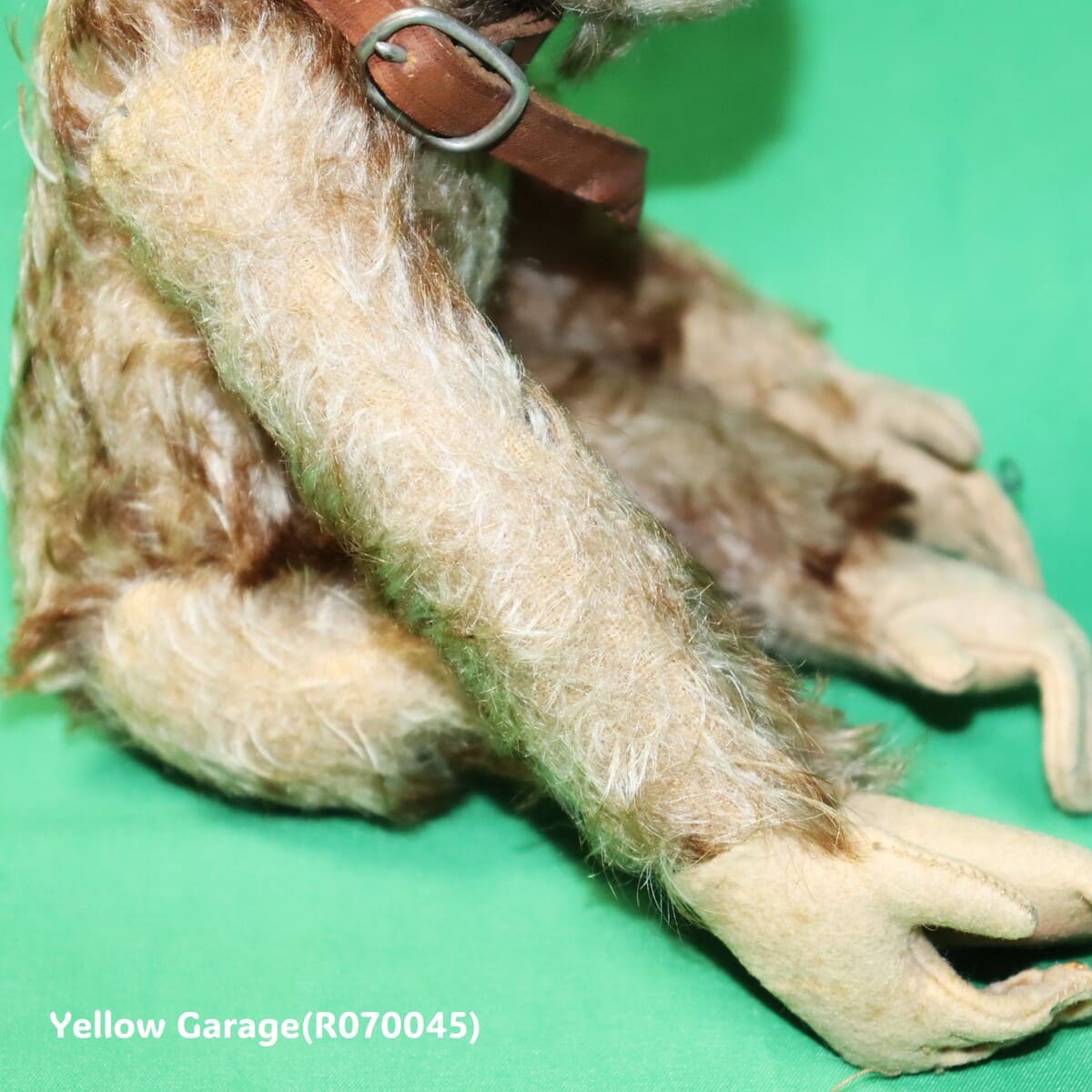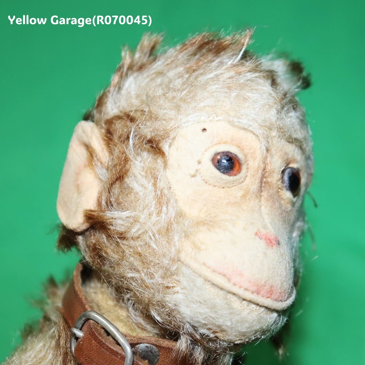 時代を感じさせる、愛嬌たっぷりのアンティークのモンキーです。柔らかい毛並みと布製の手足、そしてどこか憂いを含んだガラスの瞳が特徴のこのおサルさん。首には本革のベルトが巻かれ、昔どこかで誰かに大切にされていた雰囲気が漂っています。尾をひねると首を左右に振って”NO!”を示します。破れや汚れ、摩耗といった経年によるダメージが多々見られますが、それこそがアンティーク品ならではの「味」。この子が歩んできた時間をそのまま受け継いでくれる方にお届けしたい一点です。(R070045)