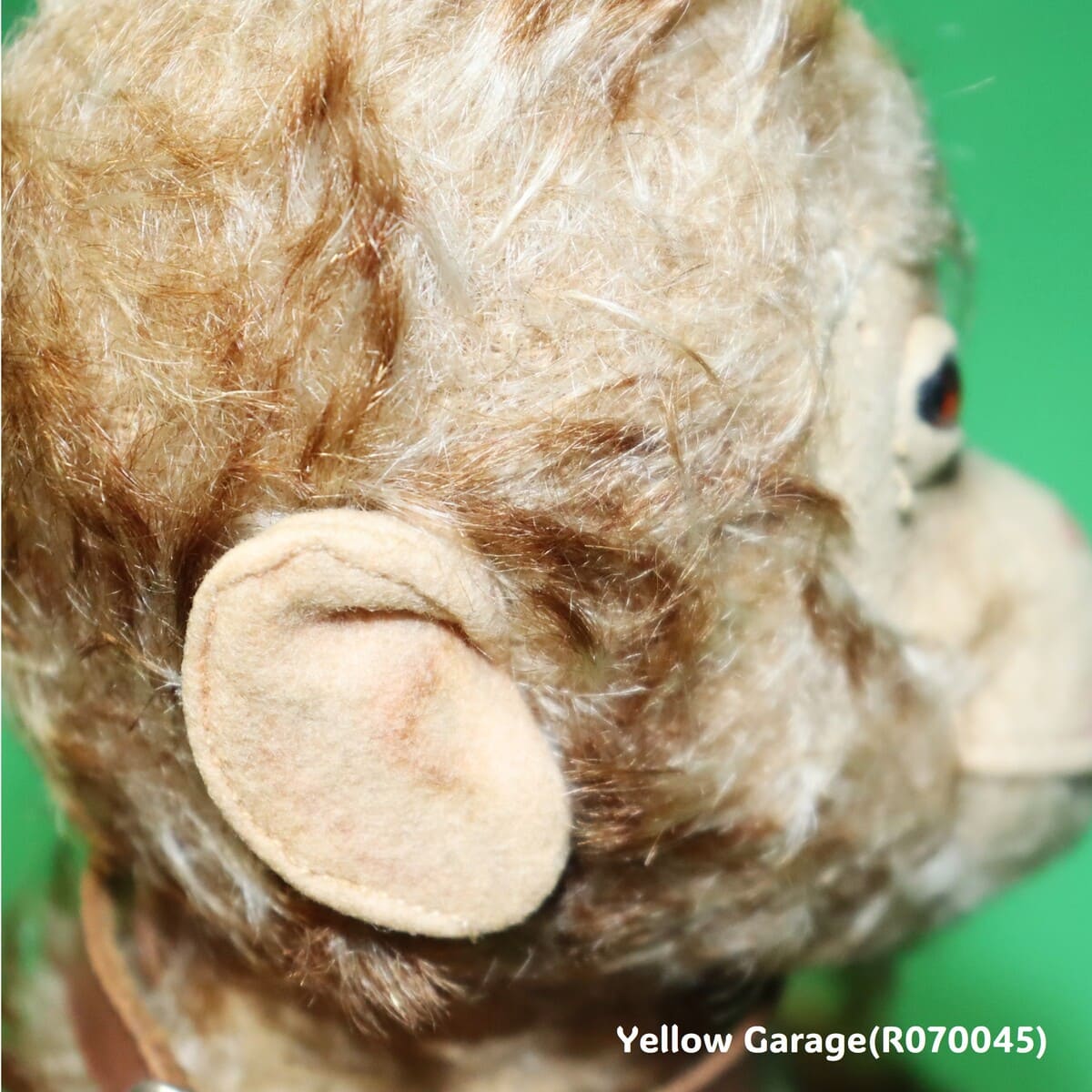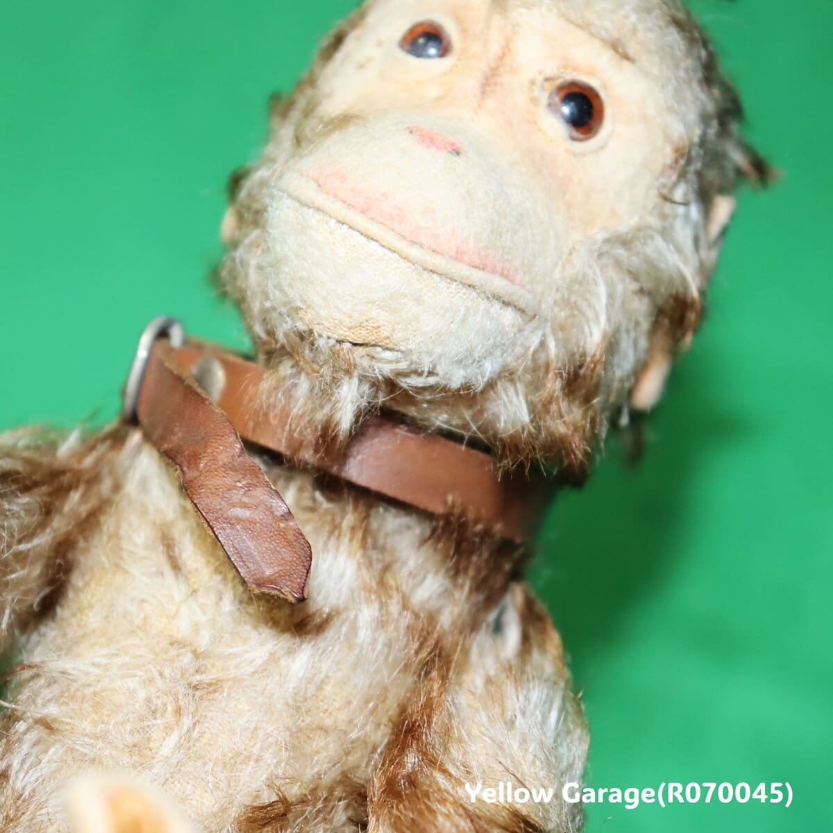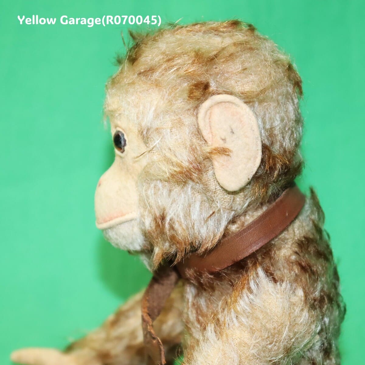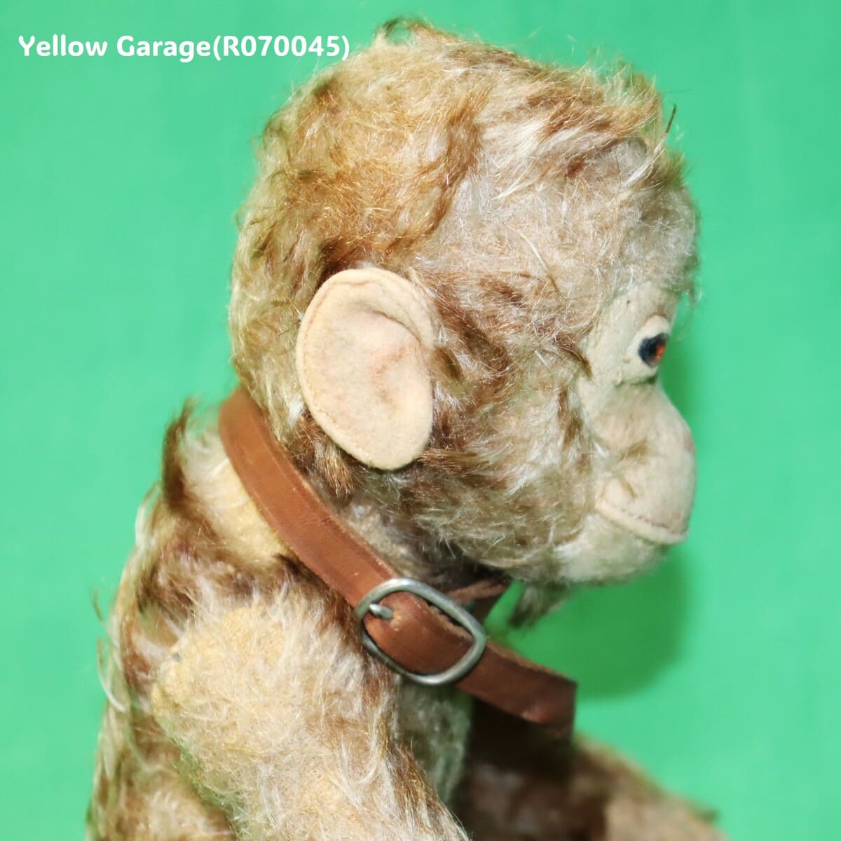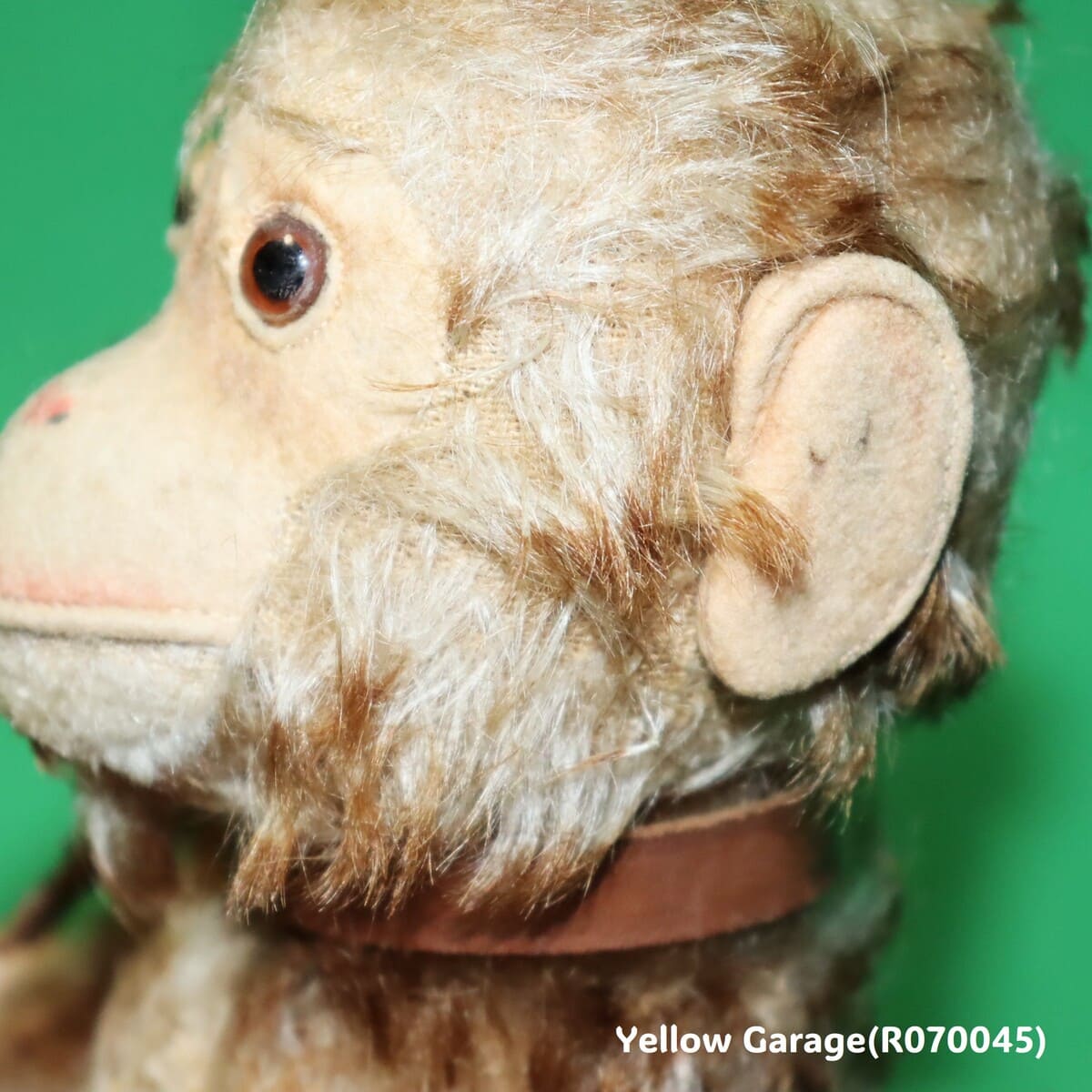 時代を感じさせる、愛嬌たっぷりのアンティークのモンキーです。柔らかい毛並みと布製の手足、そしてどこか憂いを含んだガラスの瞳が特徴のこのおサルさん。首には本革のベルトが巻かれ、昔どこかで誰かに大切にされていた雰囲気が漂っています。尾をひねると首を左右に振って”NO!”を示します。破れや汚れ、摩耗といった経年によるダメージが多々見られますが、それこそがアンティーク品ならではの「味」。この子が歩んできた時間をそのまま受け継いでくれる方にお届けしたい一点です。(R070045)