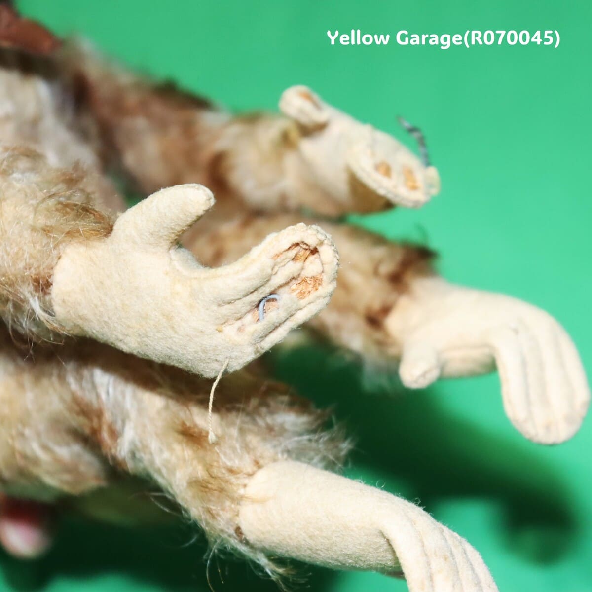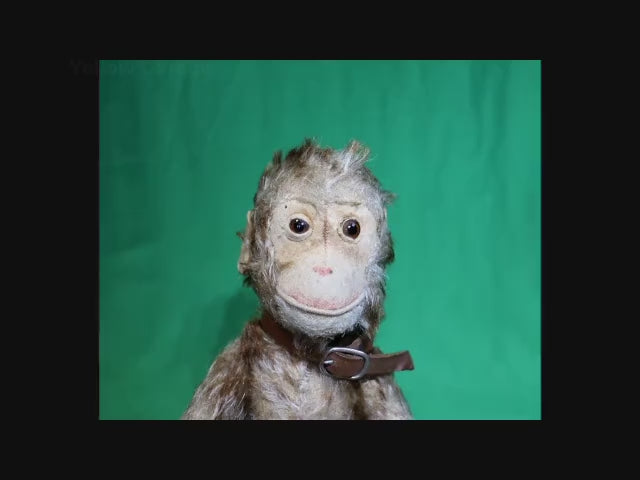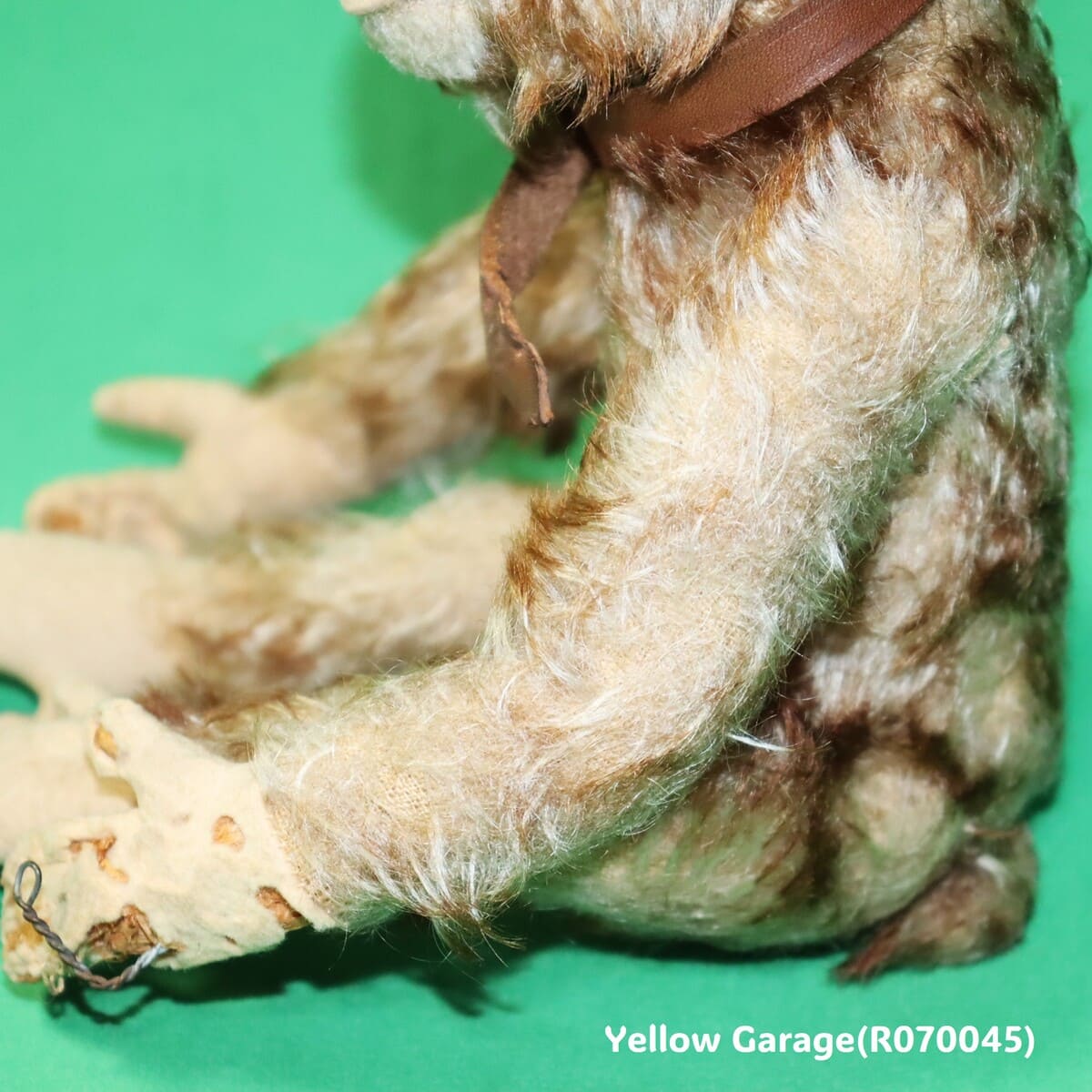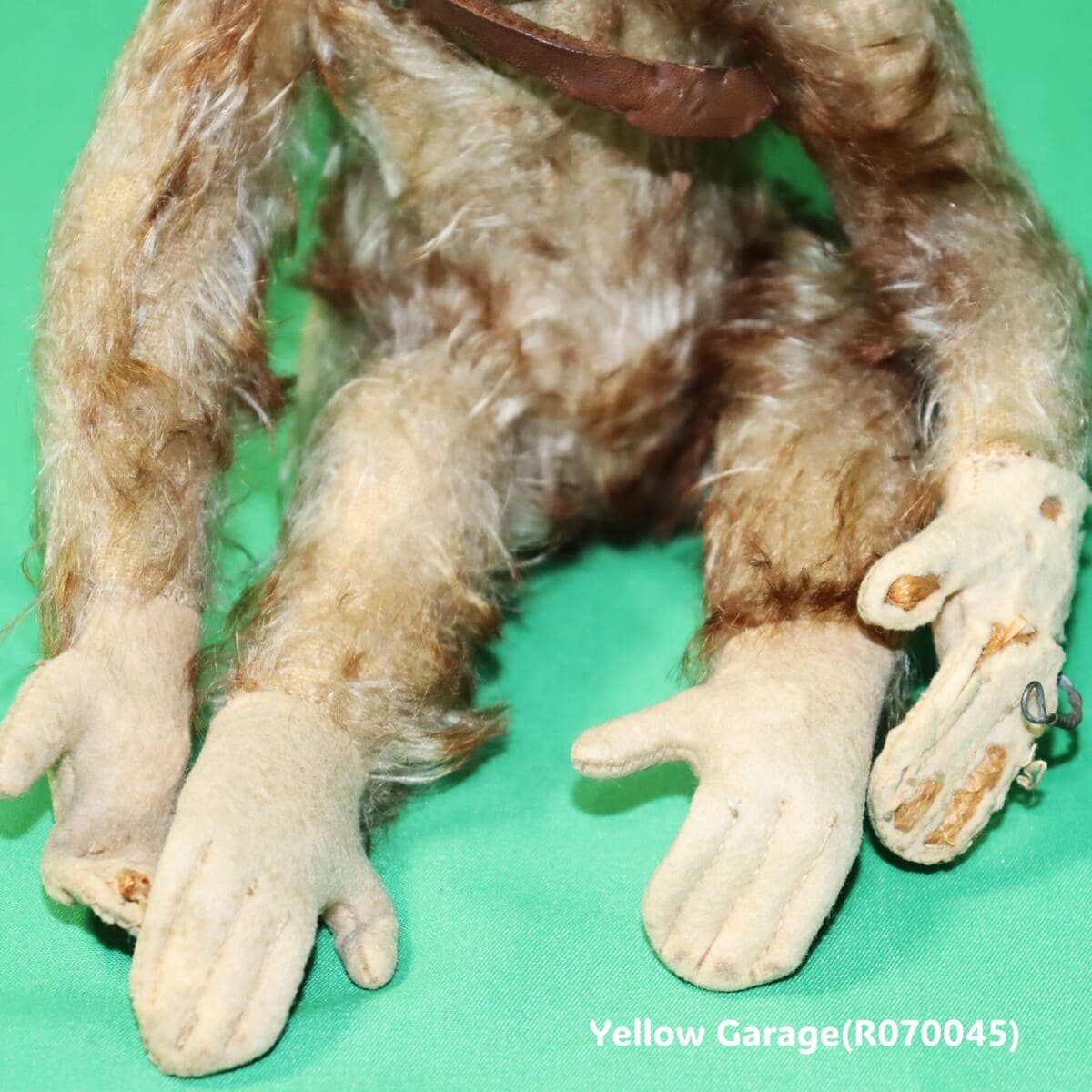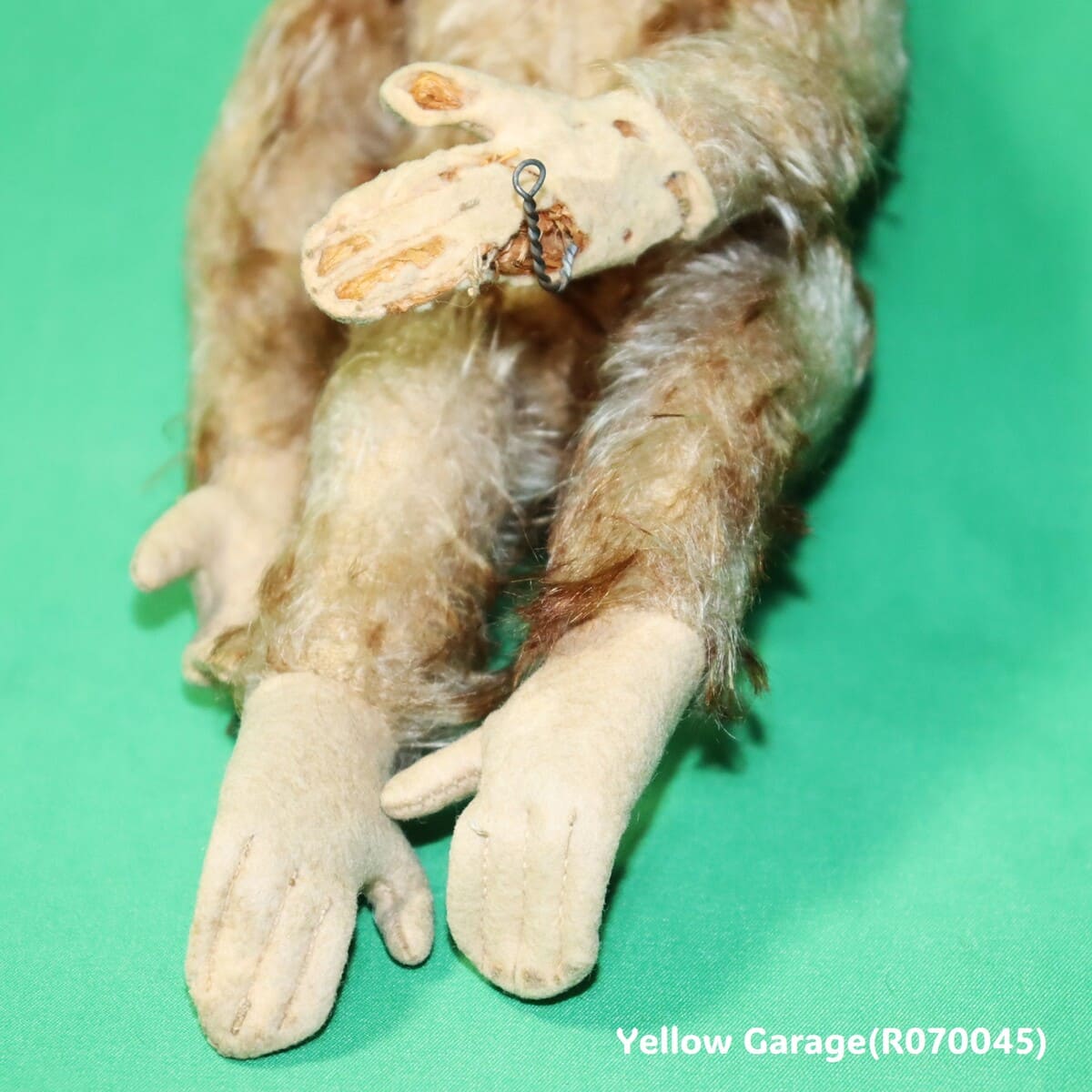 時代を感じさせる、愛嬌たっぷりのアンティークのモンキーです。柔らかい毛並みと布製の手足、そしてどこか憂いを含んだガラスの瞳が特徴のこのおサルさん。首には本革のベルトが巻かれ、昔どこかで誰かに大切にされていた雰囲気が漂っています。尾をひねると首を左右に振って”NO!”を示します。破れや汚れ、摩耗といった経年によるダメージが多々見られますが、それこそがアンティーク品ならではの「味」。この子が歩んできた時間をそのまま受け継いでくれる方にお届けしたい一点です。(R070045)