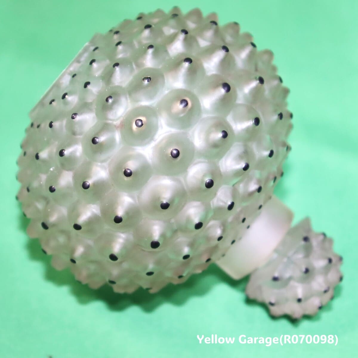 突起のあるガラスデザイン(スタッズ状の装飾)は、特にアール・デコ期(1920〜1930年代)において、かなりの人気を博していました。アール・デコ(Art Déco)の特徴は、幾何学的でシンメトリカルなデザイン、工業的・機械的な美意識、表面装飾にリズムやパターンを取り入れる、高級感と装飾性を追求しながらも機能美を大切にするなどがあります。そのため、この時代のガラス製品では、ドット、リブ(波状)、突起(スタッズ)、繰り返し模様(レピティション)、フロスト加工やサチネ仕上げ(すりガラス風)などが多用されました。R. Lalique における突起デザインは、植物の実(イチジク、マルメロ、トゲのある種子)、水泡や真珠、宝石などの自然形態からインスピレーションを得て、繊細かつ有機的な突起をあしらったと言われています。