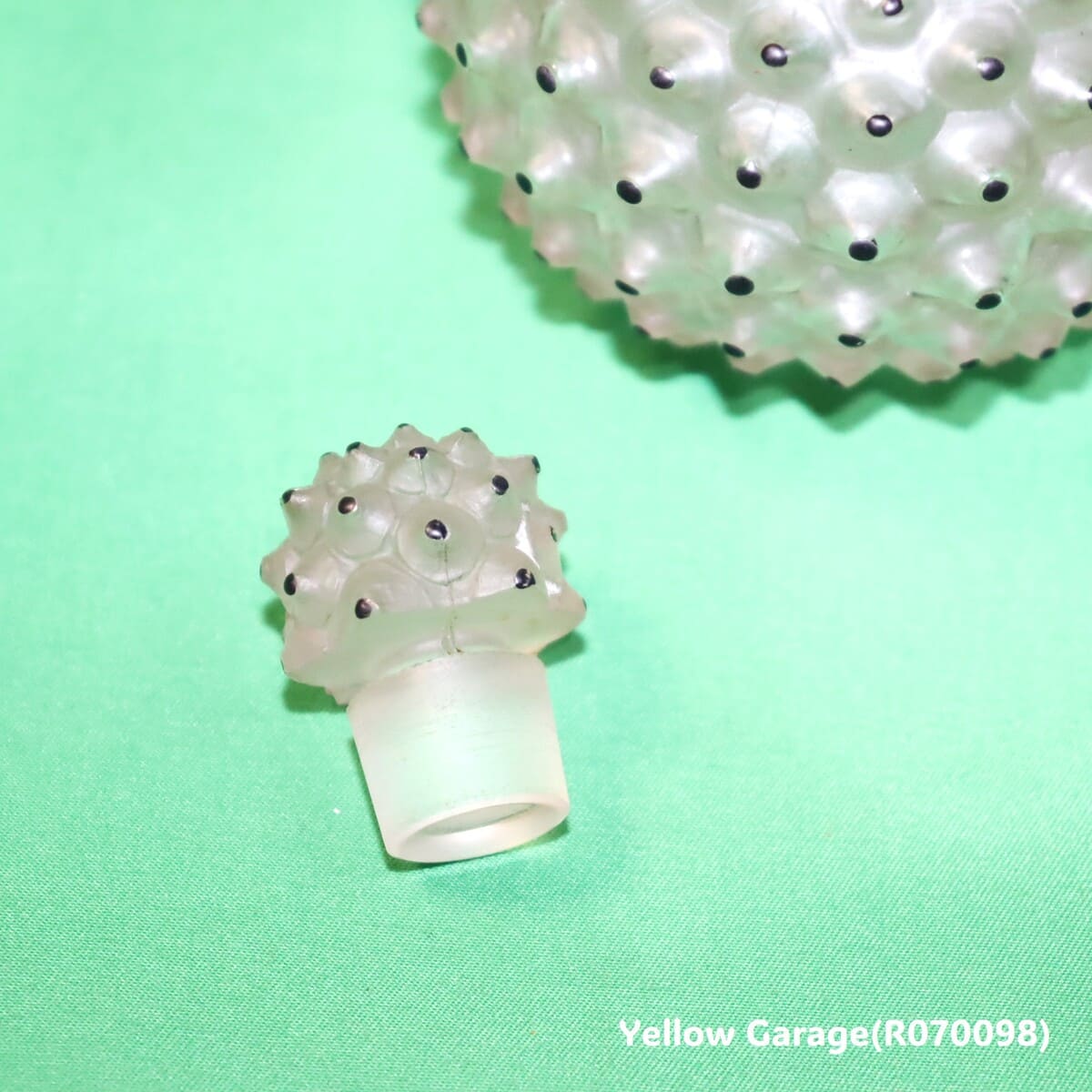 フランスを代表するガラス工芸家ルネ・ラリック(R. Lalique)による、1930年代頃のアンティーク香水瓶《Cactus》。丸みを帯びた球形フォルムに、凹凸のある突起が全体に規則正しく施され、突起の先端には濃いブルーの着色がアクセントとして加えられています。蓋も本体と同じ意匠で統一されており、まるで宝石のような存在感を放ちます。底部には「R.LALIQUE FRANCE」の刻印があり、オリジナルであることが確認できます。アール・デコ期の美学を感じさせる逸品であり、ディスプレイはもちろん、香水ボトルとしての実用性も兼ね備えています。(R070098)