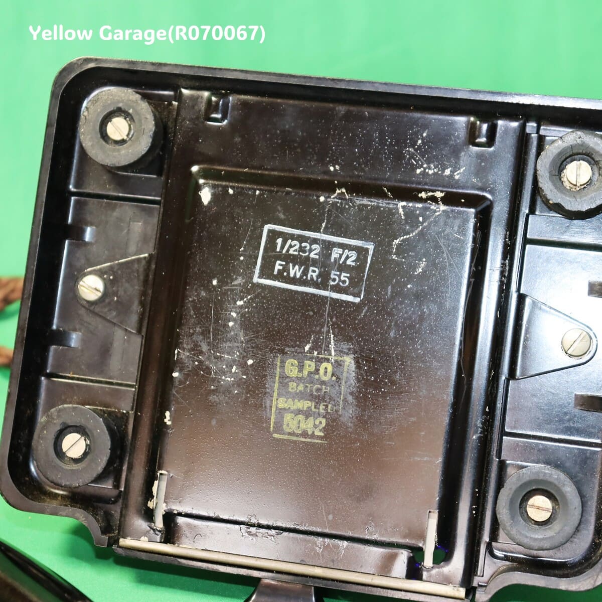 G.P.O.(英国・ゼネラル・ポスト・オフィス)は、18世紀から1969年まで存在していたイギリス政府の通信行政機関で、郵便(Post)、電話・電信(Telecom)、ラジオ放送(初期)、電報・緊急通報システム(999)の業務を総括していました。当時のイギリスでは、電話機はG.P.O.が仕様を決定し、認可・管理された業者に製造させていました。この電話機に見られる「G.P.O. BATCH SAMPLED」の刻印は、サンプル検査済み(品質確認済み)であることを示しています。「BATCH SAMPLED」は、「ロット(製造バッチ)単位で抜き取り検査を受けた製品」という意味です。この表記の意味は、量産品の中から抜き取り、品質検査のためにサンプルとして選ばれたもので、通常はその後、実際の現場(家庭・オフィスなど)で使用されます。