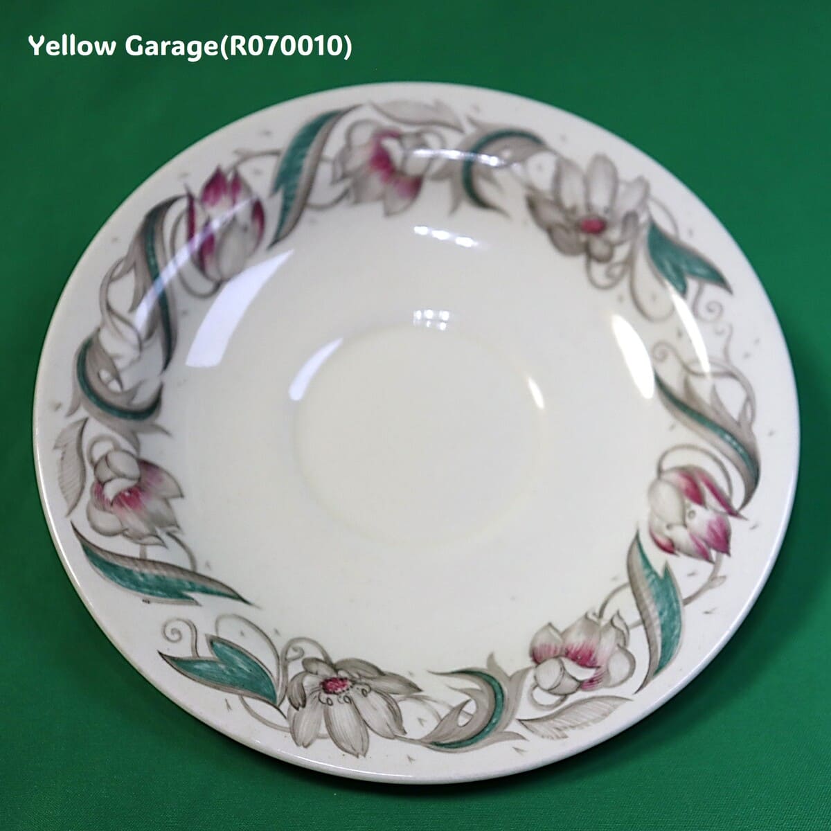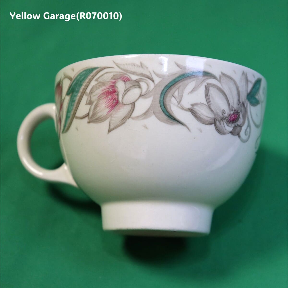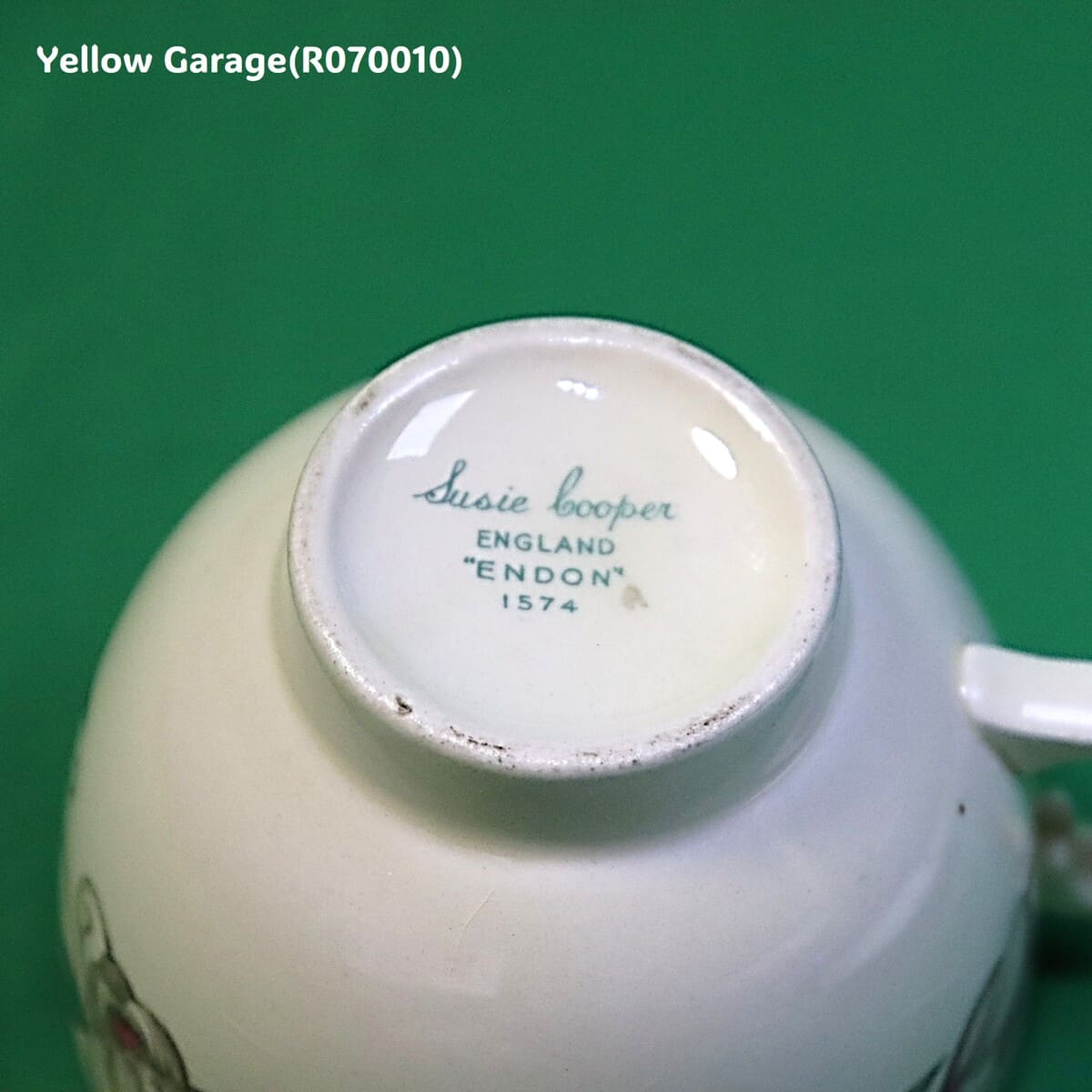 イギリスを代表する陶磁器デザイナー、Susie Cooper(スージー・クーパー) によるヴィンテージのカップ&ソーサーです。裏面には 「Susie Cooper, ENGLAND, ENDON 1574」 のバックスタンプが入っており、スージー・クーパーの人気シリーズ “ENDON” パターン の一点です。淡いベースカラーに、流れるような花と葉のデザインが特徴で、どこかアールデコ調を思わせる優美な雰囲気を纏っています。紅茶をいただくだけでなく、アンティークインテリアとして飾っても存在感を放つ逸品です。(R070010)